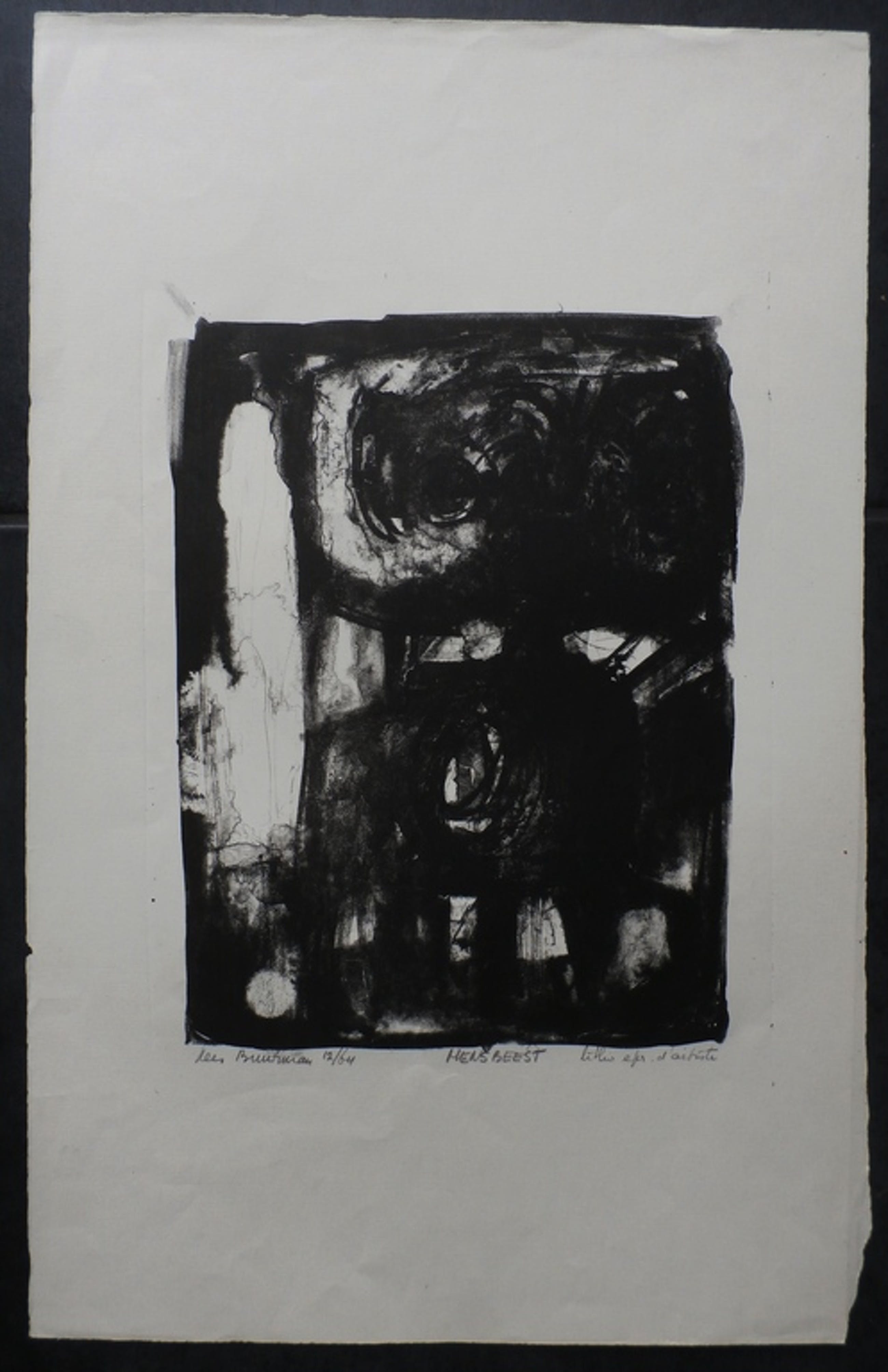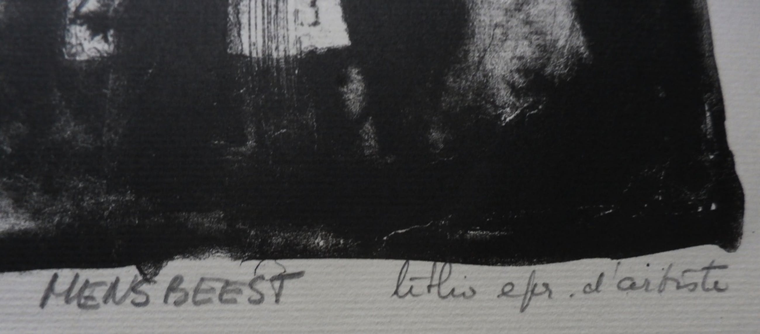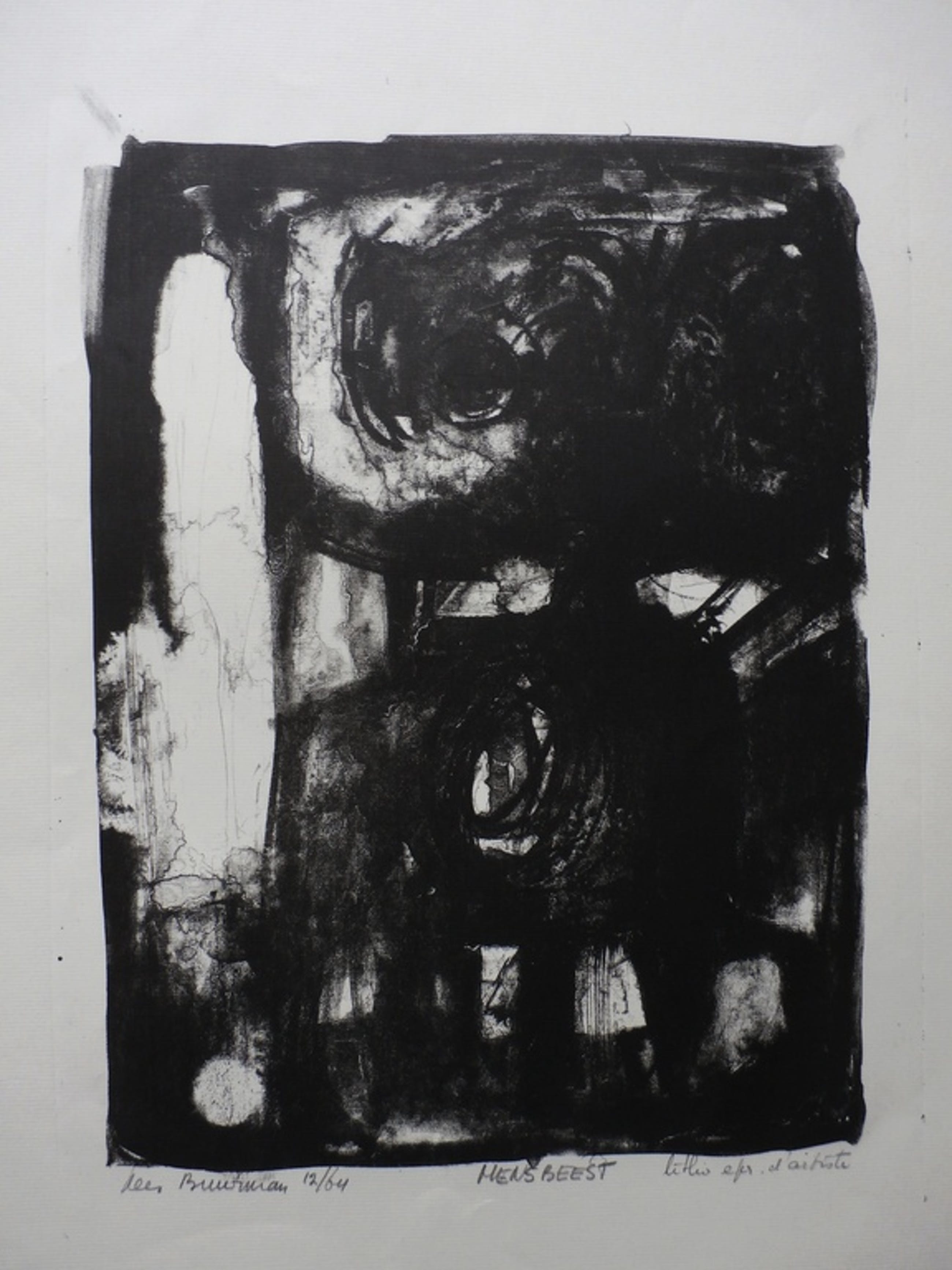 Litho van Kees Buurman. Titel: Mensbeest. Jaar: 1964 (december). Nummer: Epr. d'artiste. Het werk is linksonder gesigneerd en gedateerd (12/64), met potlood, door de kunstenaar. Afmetingen blad: H51 x b33,5 cm. Afmetingen voorstelling: H28,5x b21,5 cm. Conditie: in goede staat.