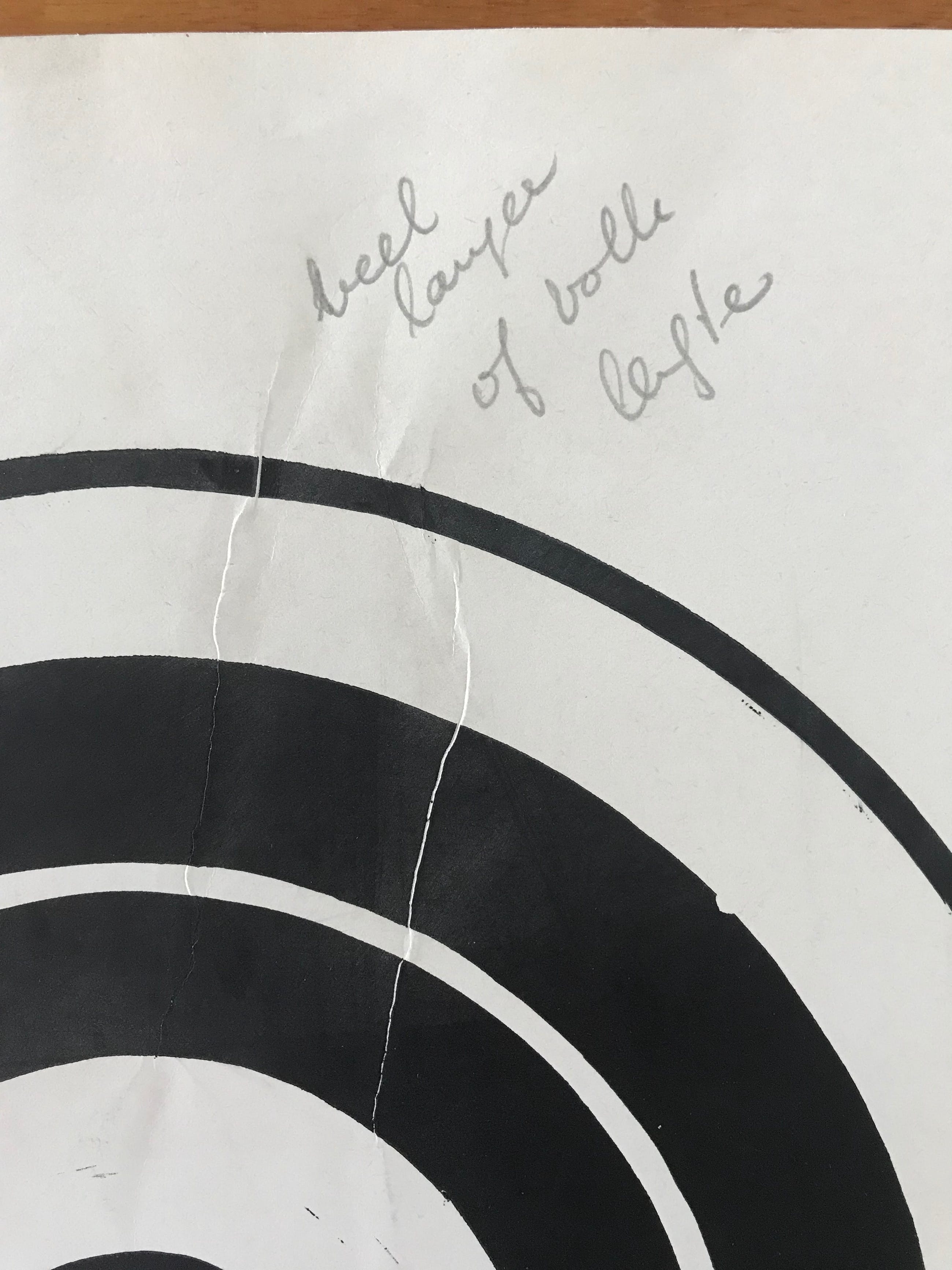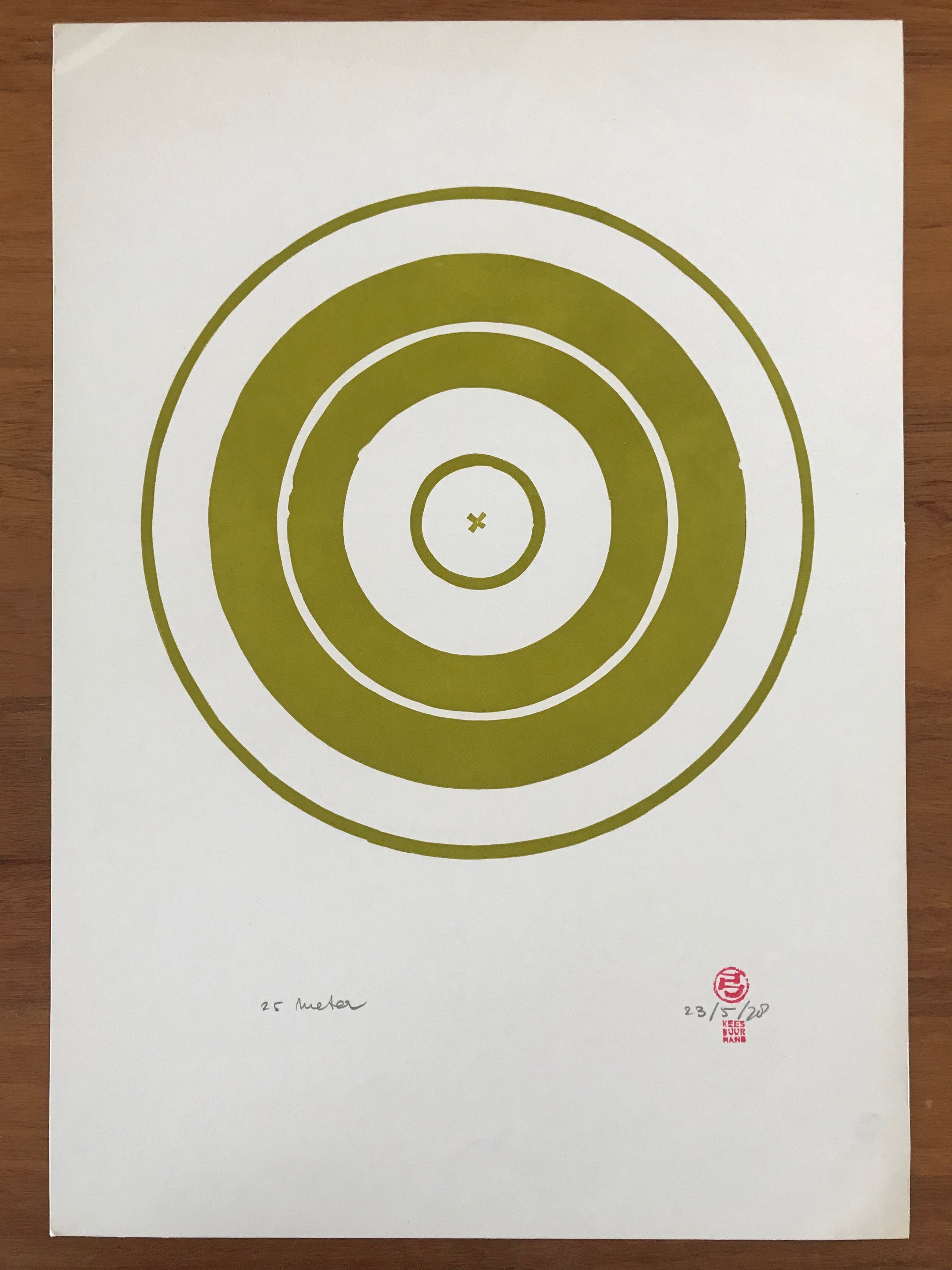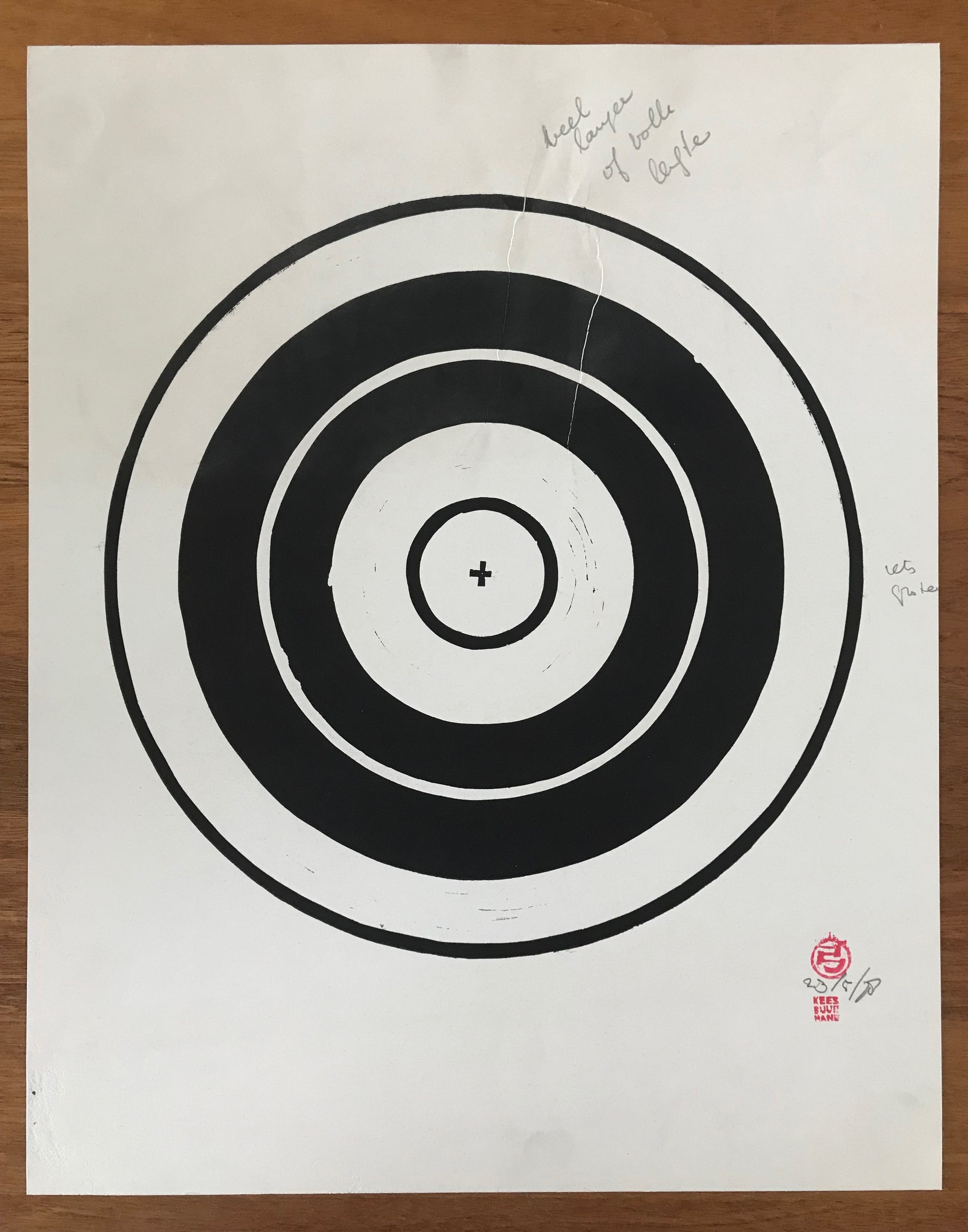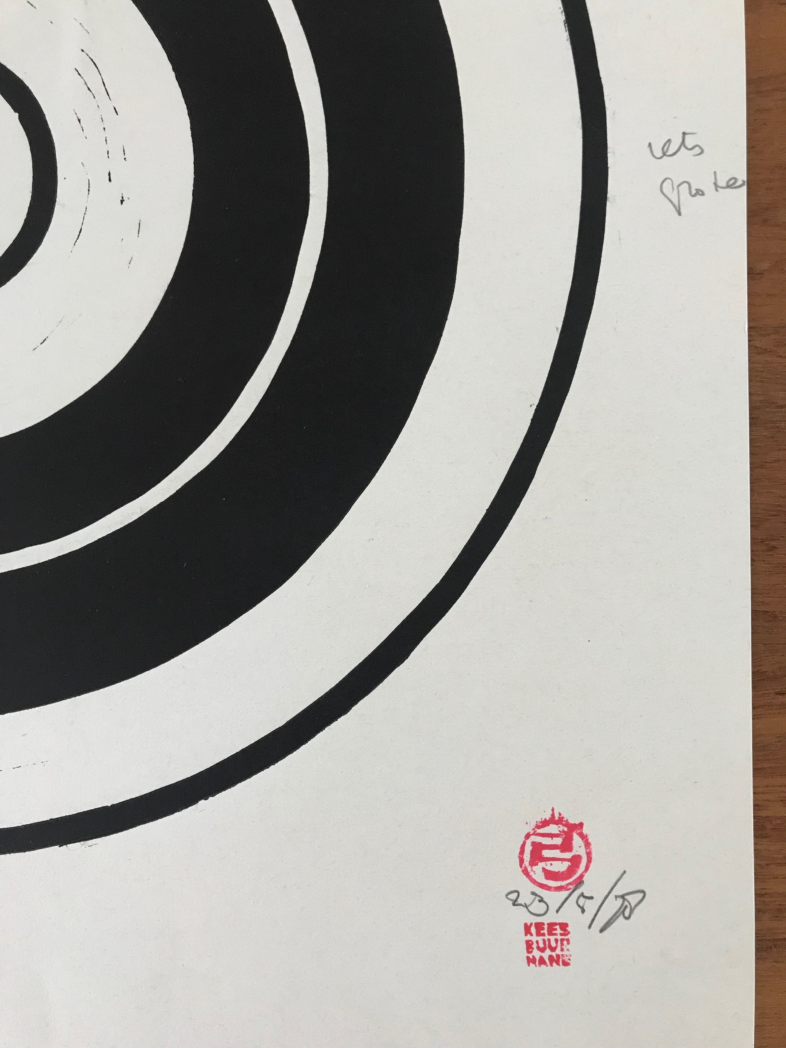 2 Litho's van Kees Buurman. Jaar: 23/5/78. Beide werken zijn voorzien van de typische atelier stempel. Eén werk heeft de tekst: '25 meter' Het andere werk is beschadigd (zie foto) en heeft ook tekst: 'veel langer of volle lengte' en 'iets groter' Afmetingen (groen werk): H54 x B38 cm. Afmetingen (zwart werk): H45,5 x B36 cm. Zoals gezegd heeft dit werk 2 verticale plooien in het midden.