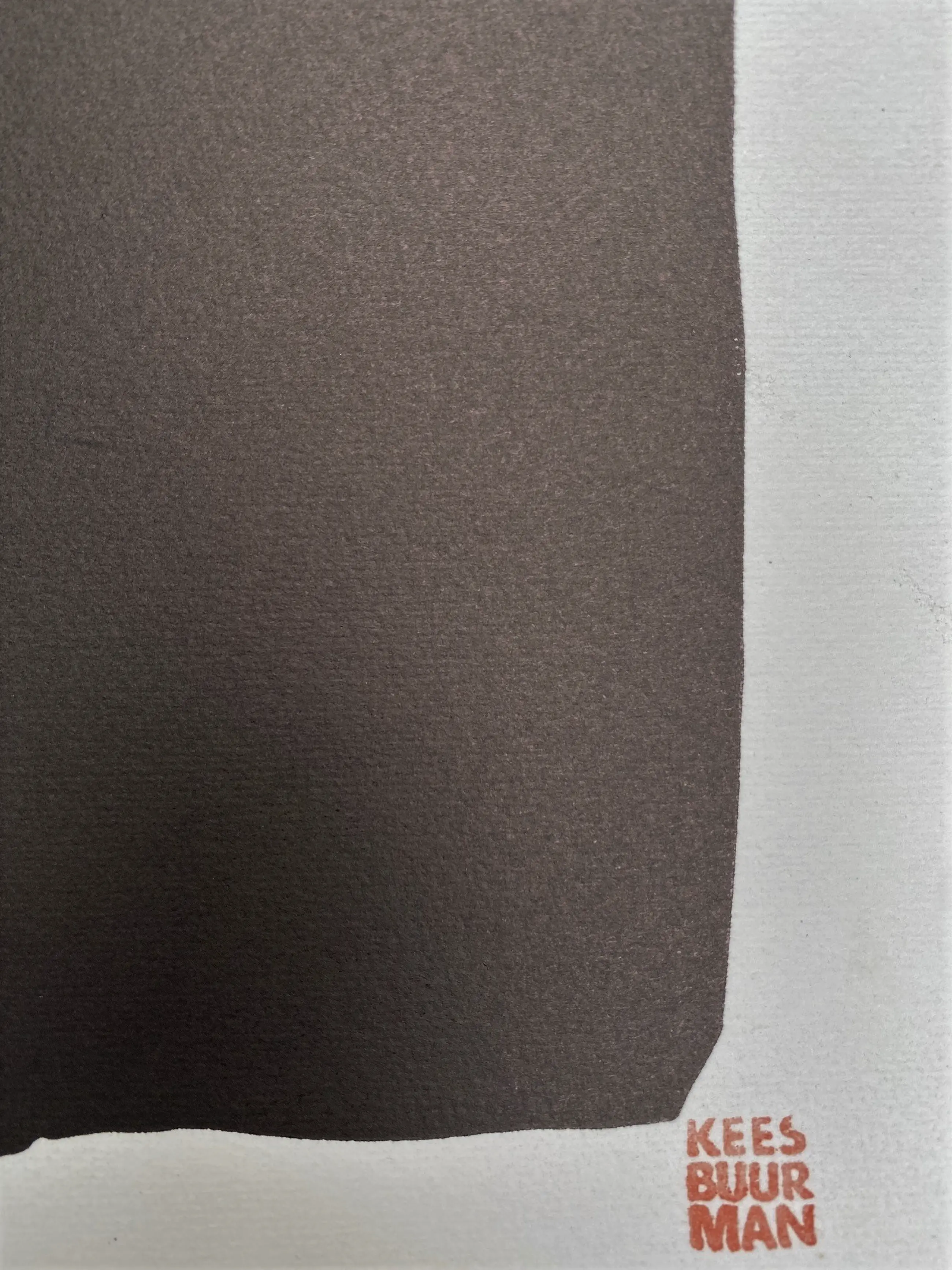 Voor de liefhebber: lino van begaafd graficus Kees Buurman uit een beperkte oplage. Postuum, maar met veel aandacht voor de door Buurman zo belangrijk geachte diep-zwarte kleur, op dik papier afgedrukt; onderaan Buurman's naamstempel, en met potlood voorzien van titel ("Vijf Verticalen") en oplagenummer ("38/50") en datum "October 2000").