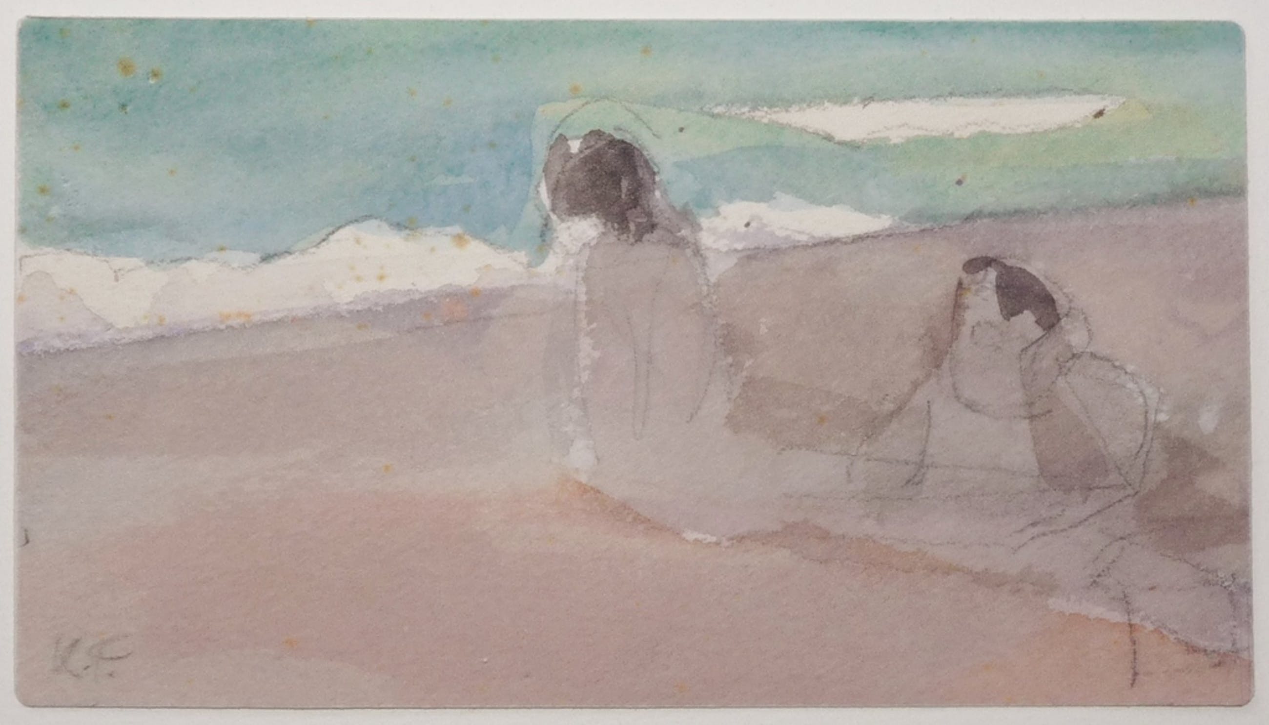 * Leuke kleine aquarel van Kees Franse van een strandgezicht met enkele figuren.