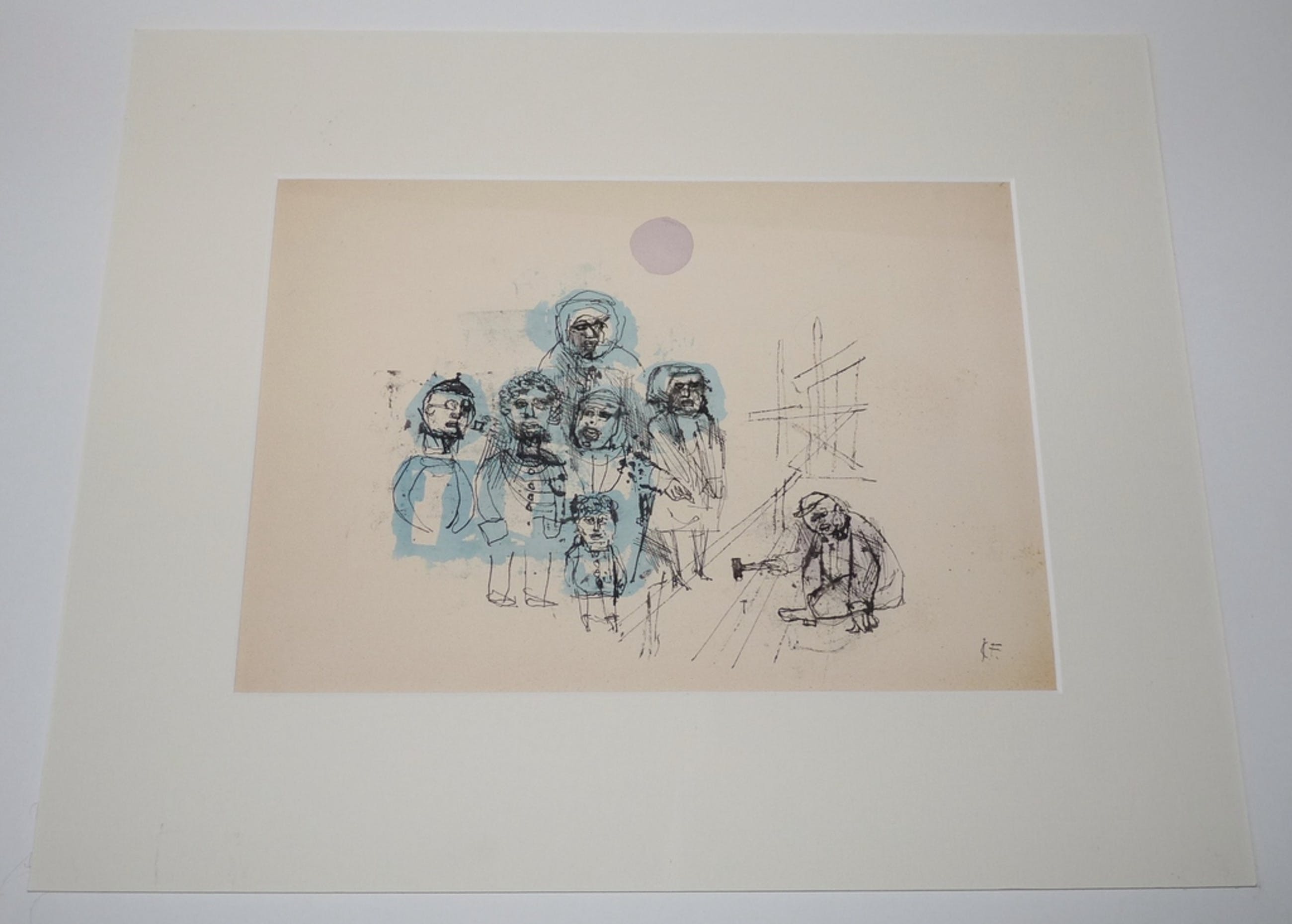 Leuke tekening met pen, inkt en aquarel van timmerende man met groep mensen
