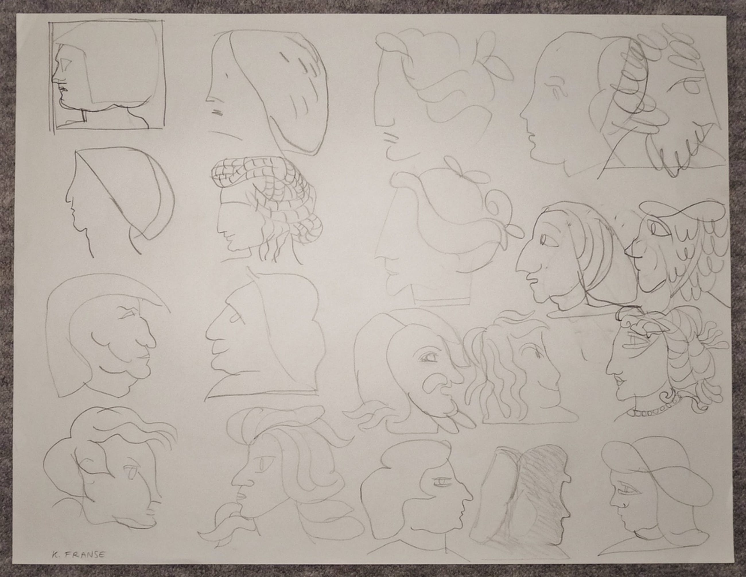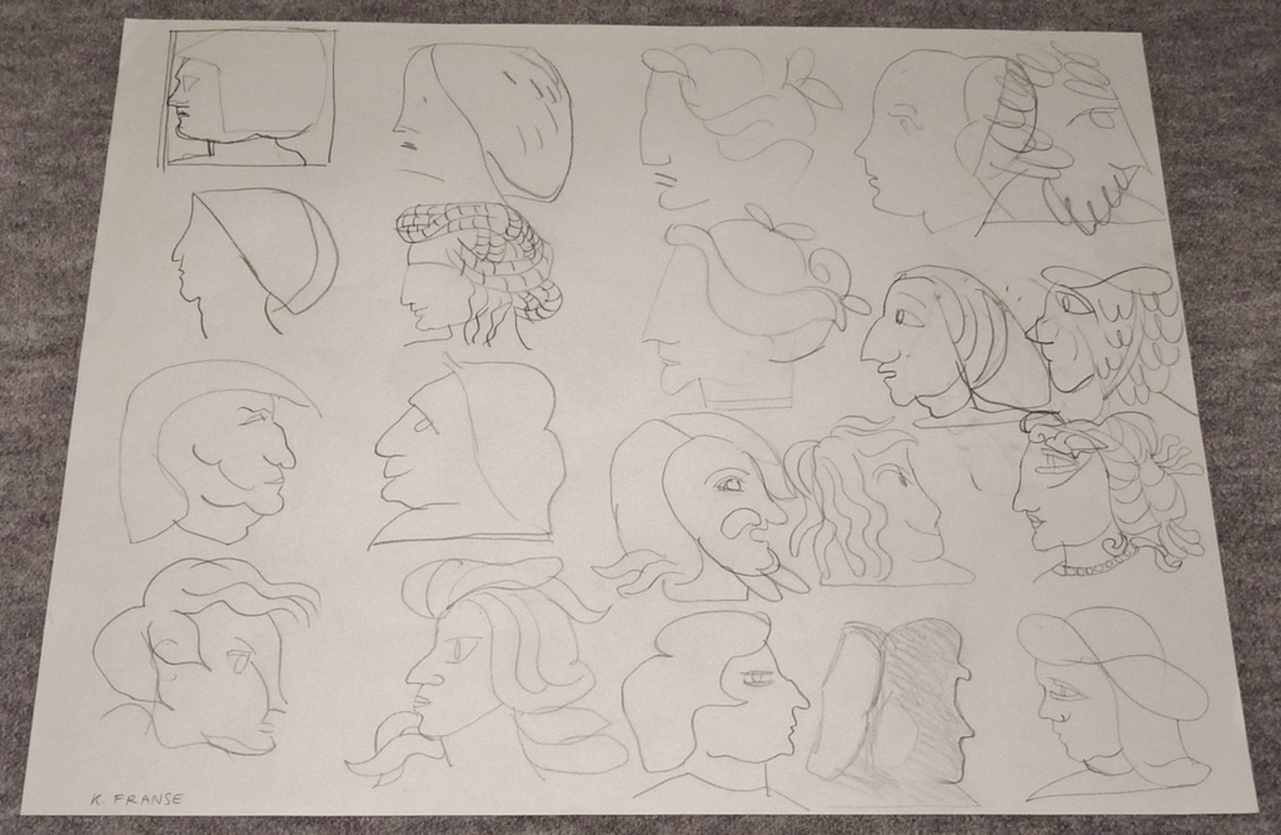 *Origineel Studie/Schetsblad met ontwerpen van koppen door Kees Franse. Leuk om te zien hoe hij op zijn bijzondere wijze onderzoek doet naar (mogelijk) verder uit te werken schilderijen of objecten.