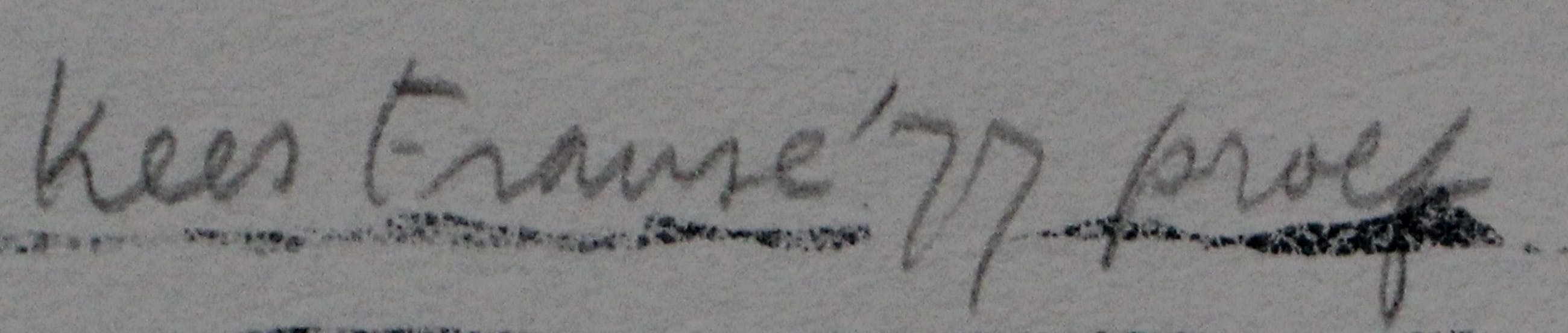 Litho van Kees Franse uit 1977. Dit betreft een proefdruk. Afmetingen blad: H56.5 x b78.5cm. Het werk is rechts onderaan, met potlood, gesigneerd door de kunstenaar. De authenticiteit van het aangeboden werk wordt volledig gegarandeerd. Een certificaat van echtheid kan, op aanvraag, worden gemaild.