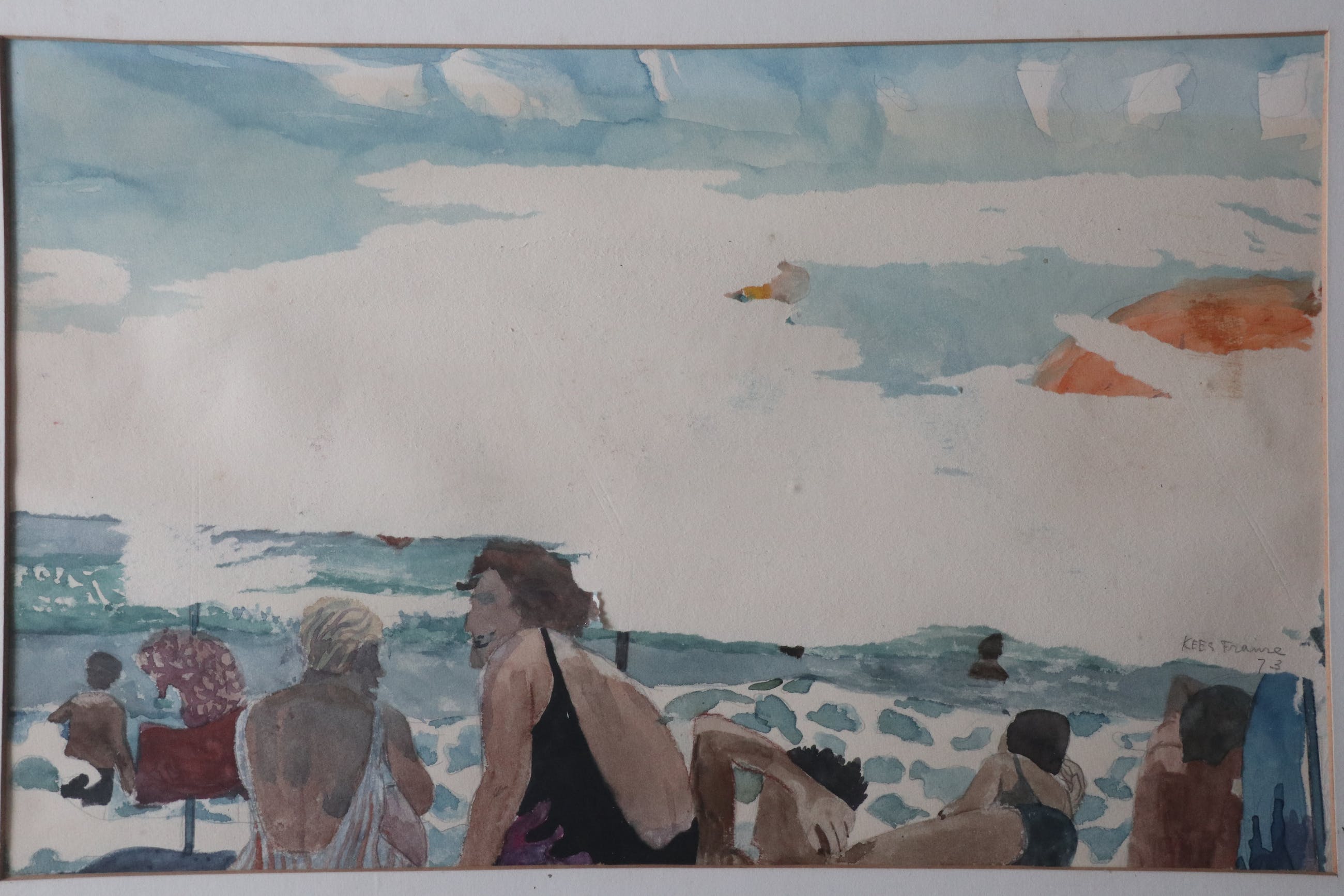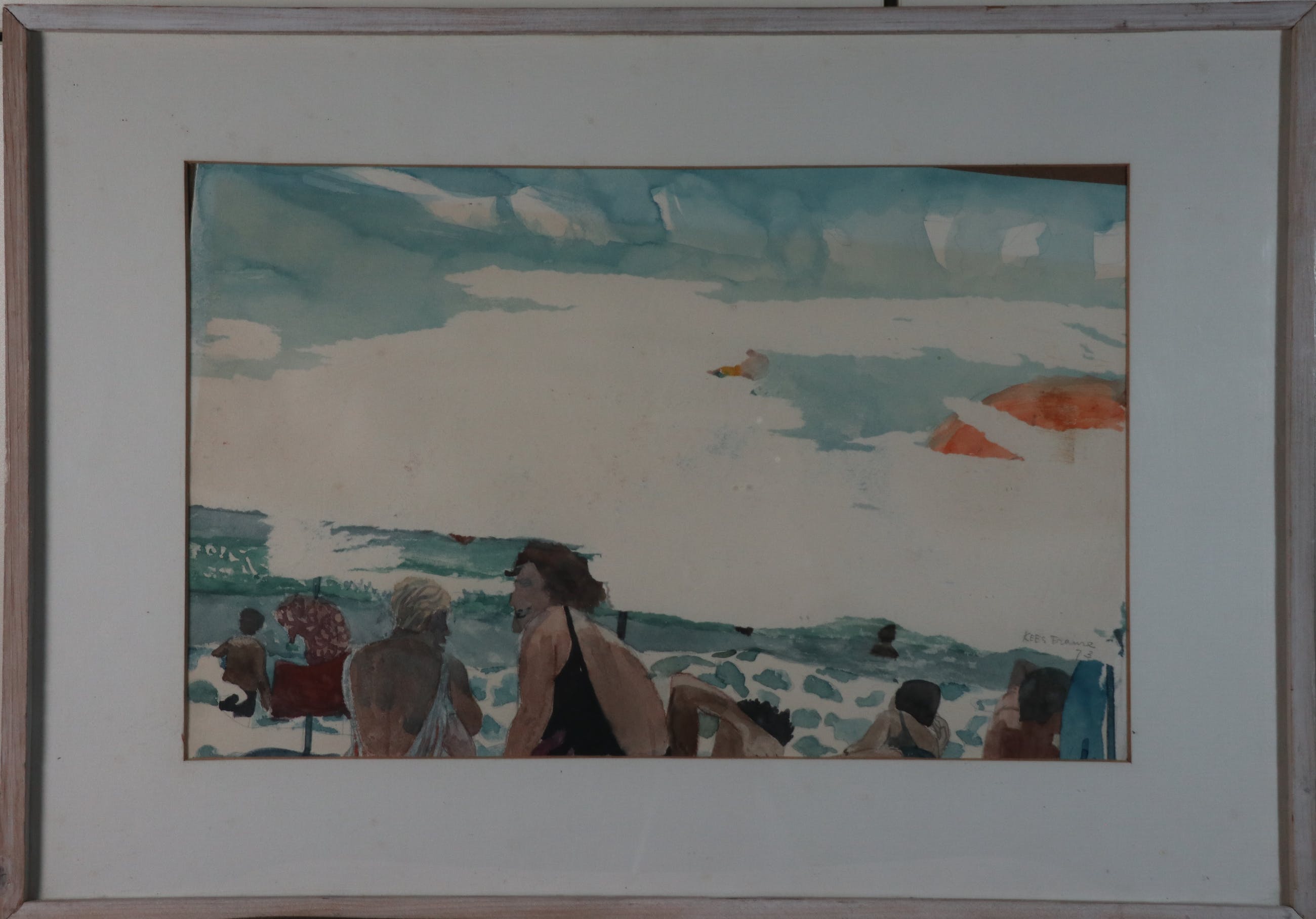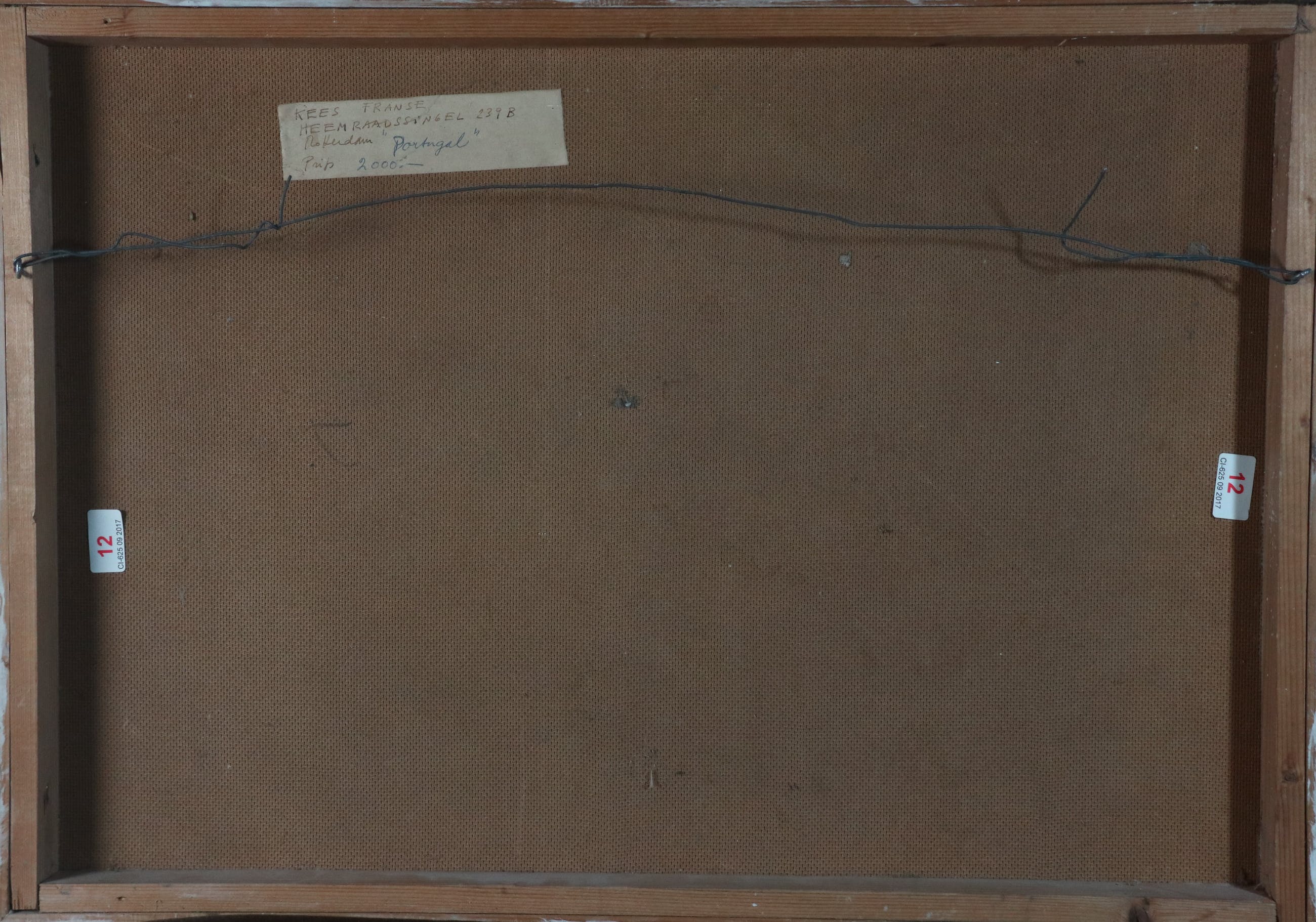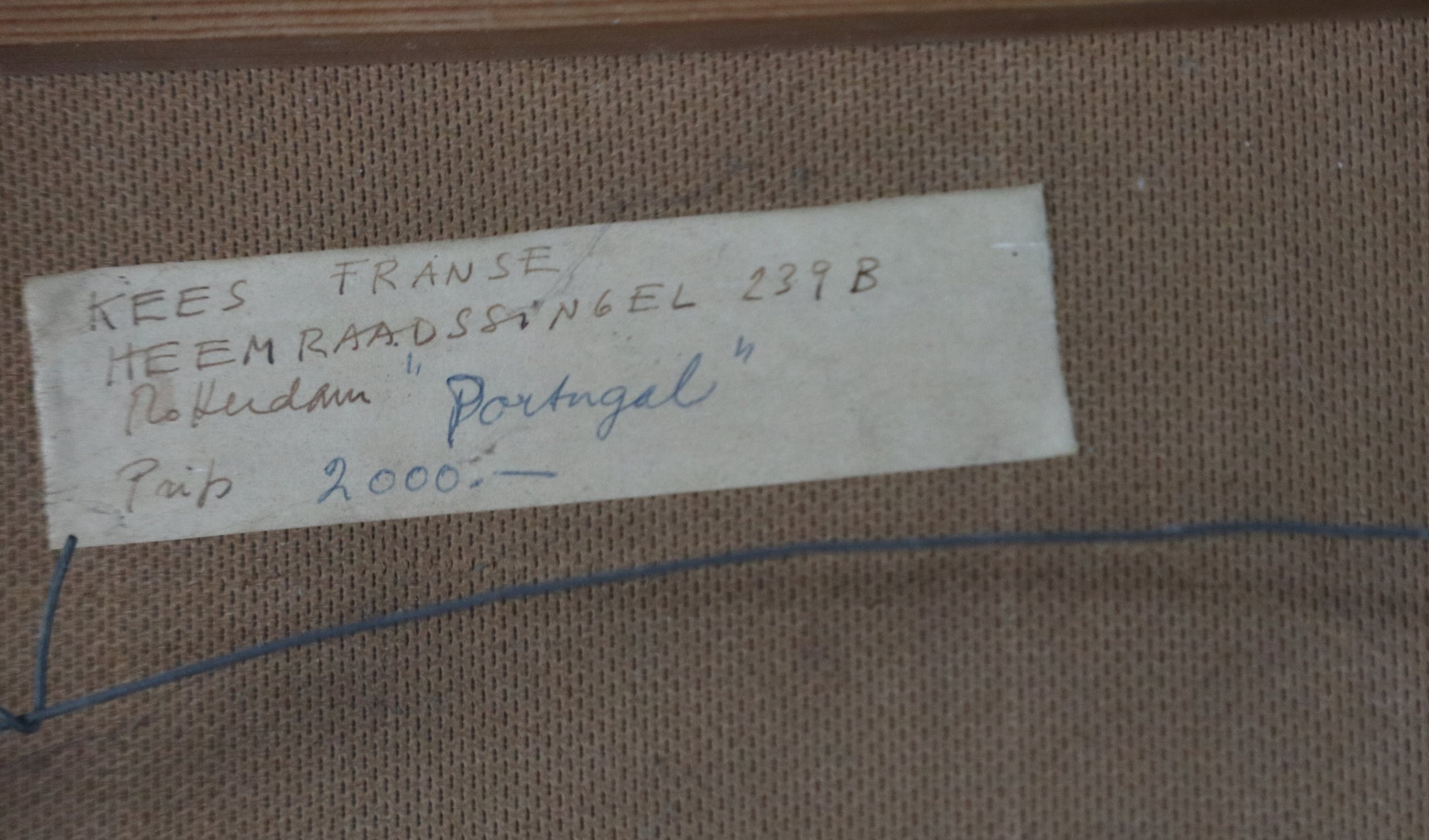 Aquarel van Kees Franse, verso getiteld "Portugal". Het papier van de aquarel is door de kunstenaar nabewerkt waarbij in de lucht een laagje papier verwijderd is, dit is gedaan voor de signatuur is aangebracht. De omlijsting is origineel door de kunstenaar zelf gemaakt en na aankoop door mij niet geopend, dus nog volledig in originele conditie. De aquarel zit los in de lijst.