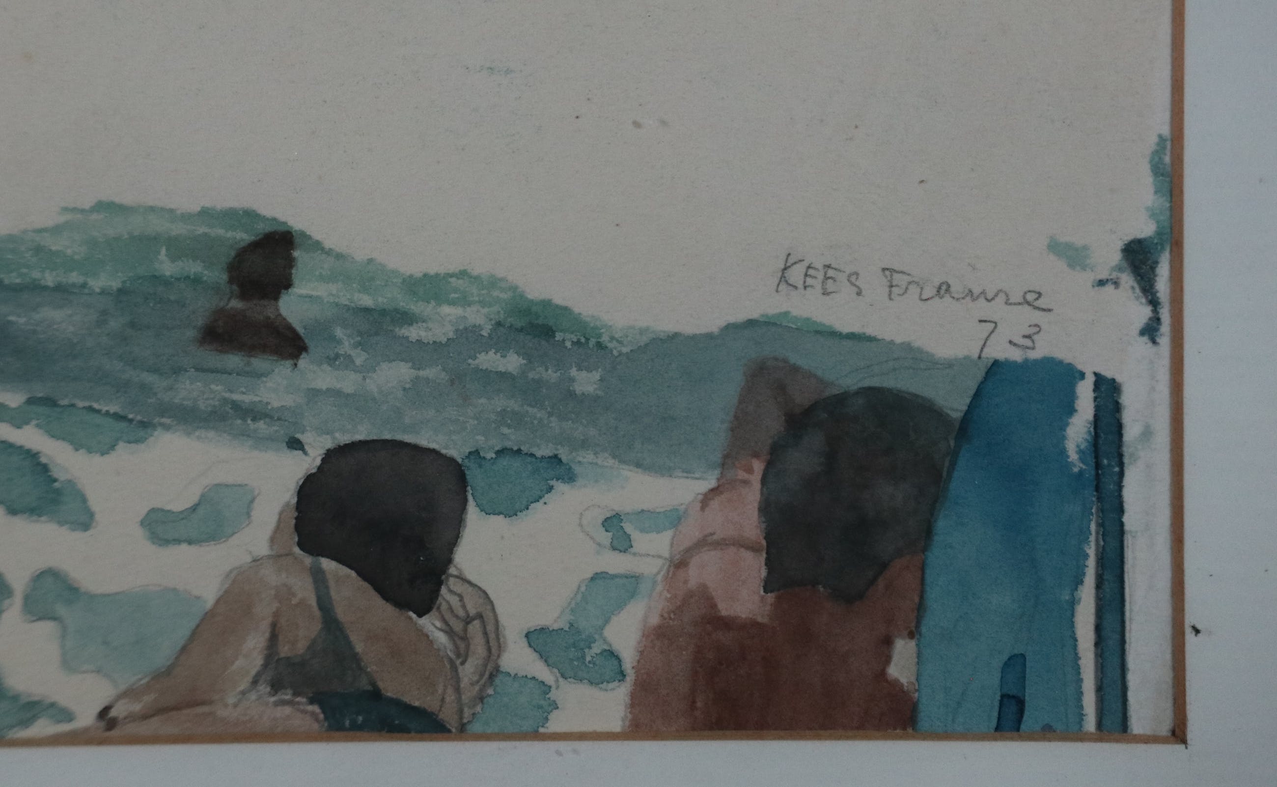 De aquarel zit los in de lijst en is iets verkleurd.