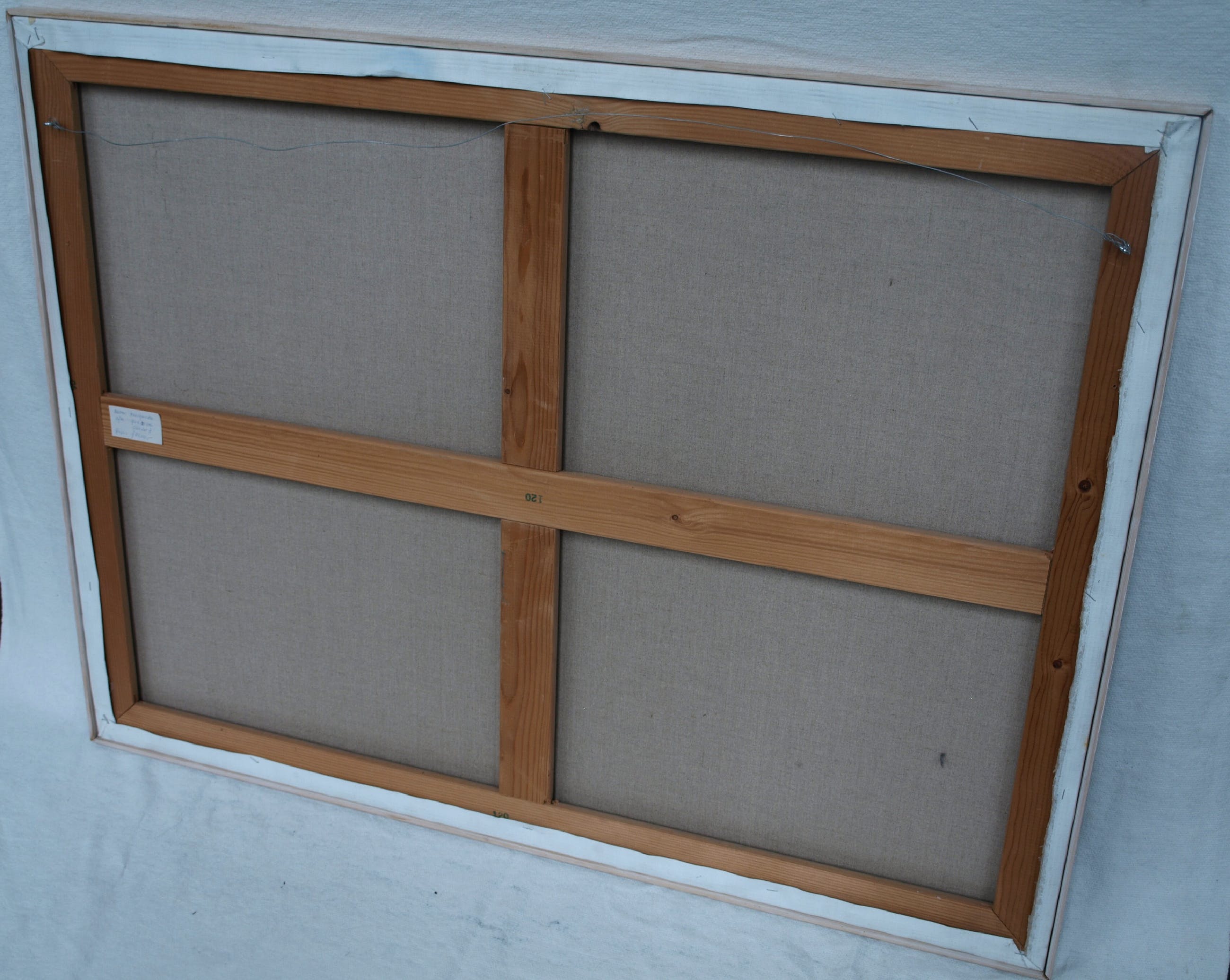 -Olieverf op doek, opgespannen op een houten spieraam en ingelijst d.m.v. ‘expositie-latjes’.