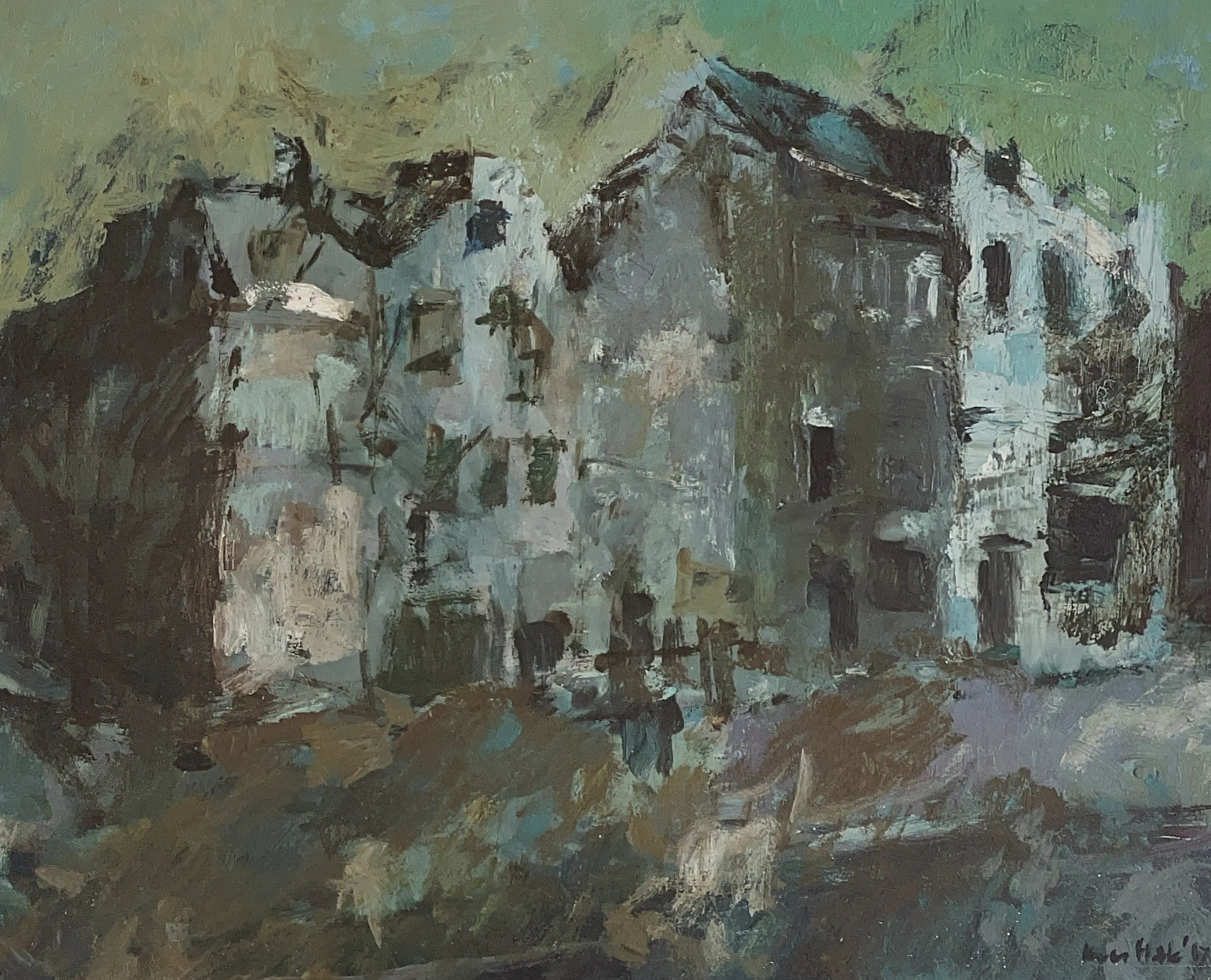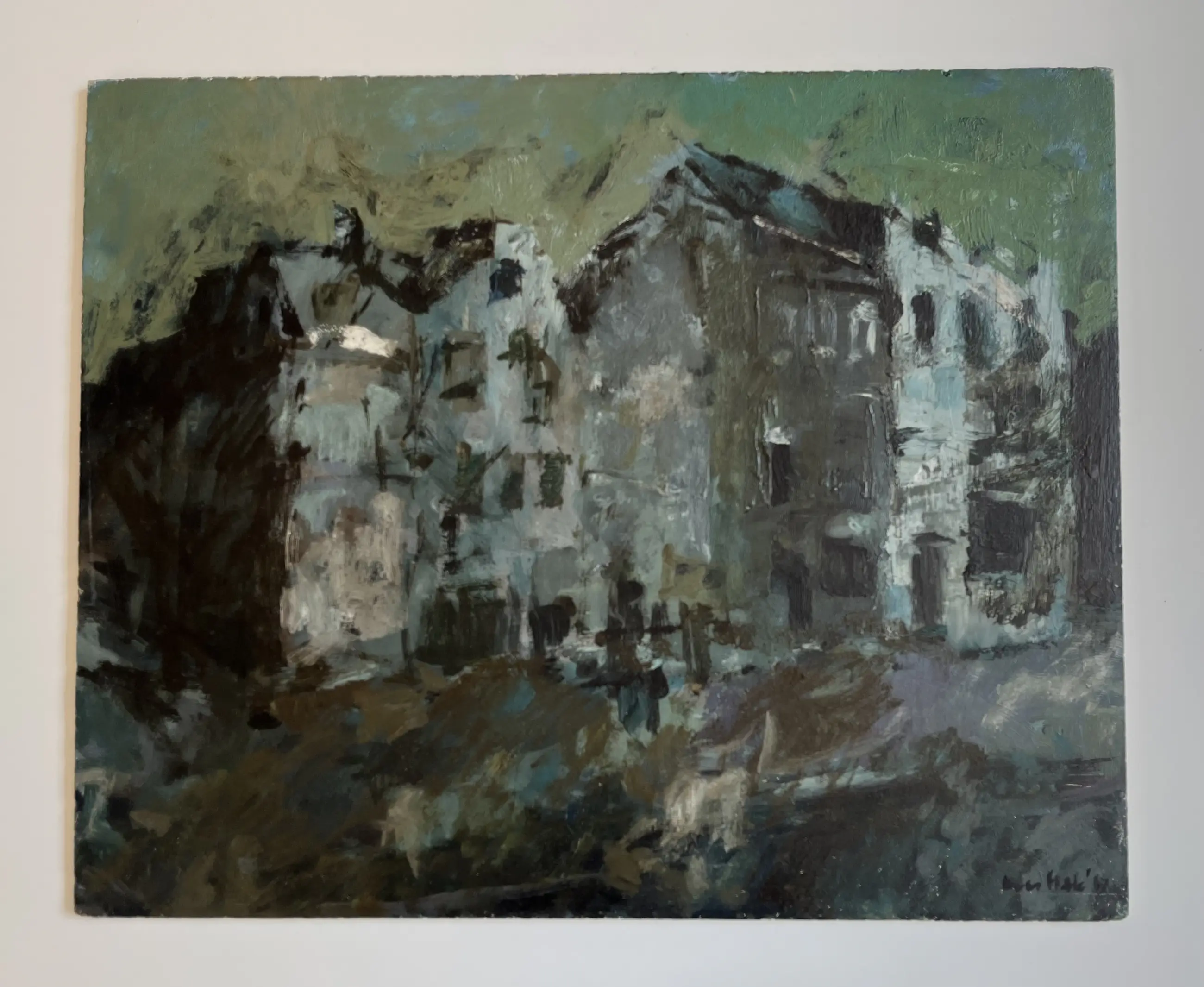 Dit schilderij toont afbraak van oude huizen voor nieuwbouw. Deze Haarlemse schilder (1941)heeft zowel schilderijen, als sculpturen en werken op papier gemaakt. Bekend zijn vooral zijn landschappen en stillevens, uitgevoerd in een karakteristieke stijl met trefzekere penseelstreken.