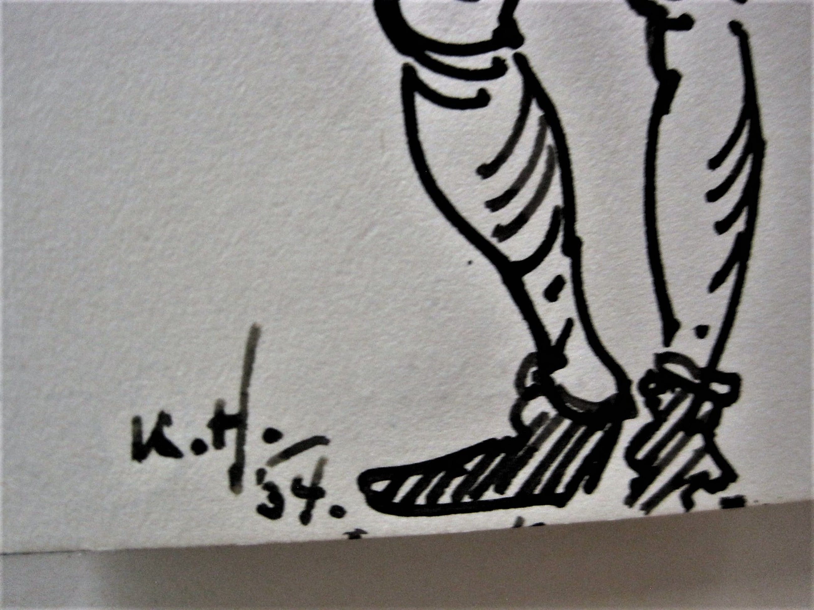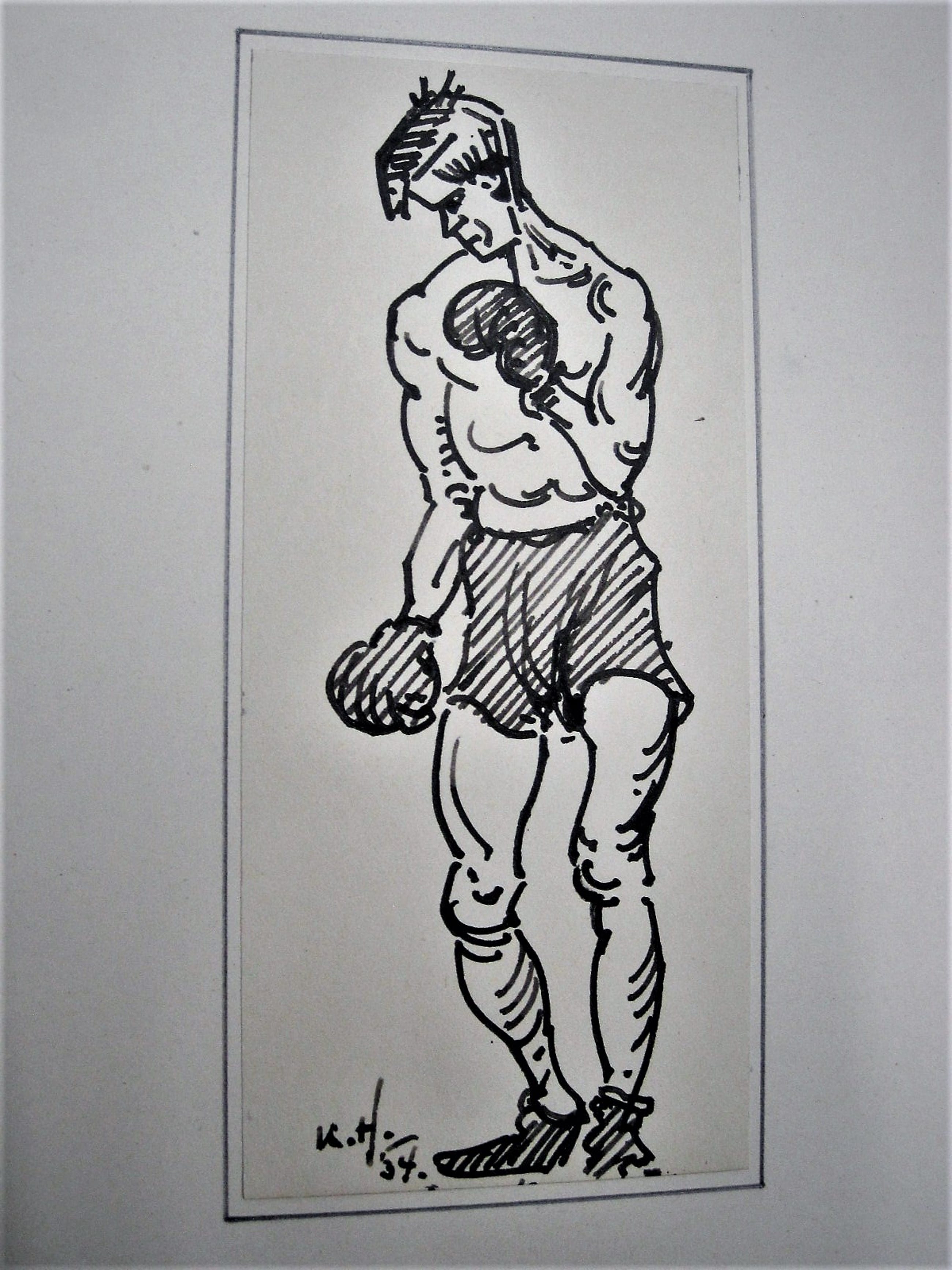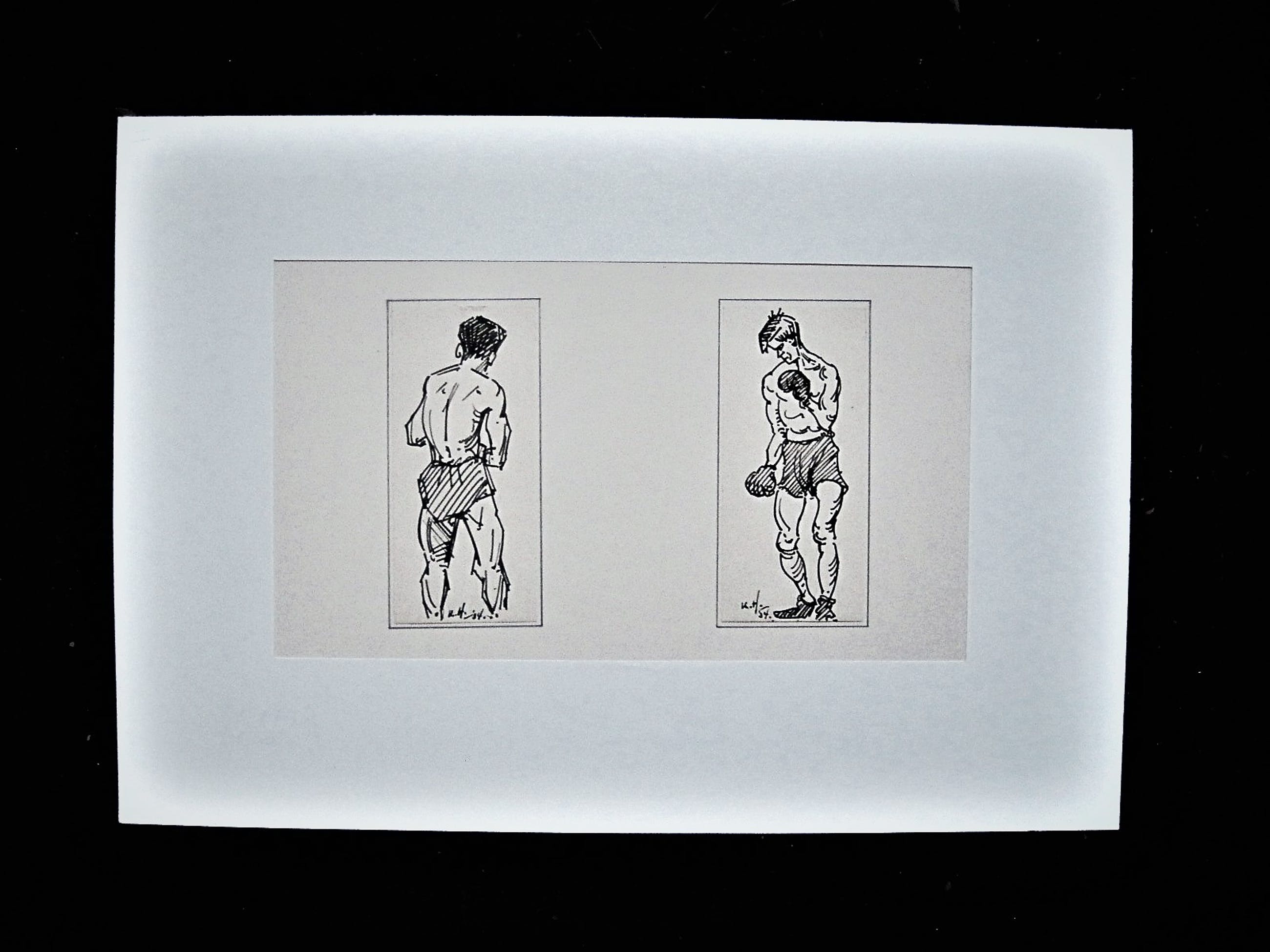 Leuke karikaturale inkttekeningen / illustraties van twee Boxers, gemaakt door Kees Heynsius In goede conditie en van passend passe partout voorzien. Gesigneerd linksonder. Papiermaat per tekening ca. 20 x 15 cm.
