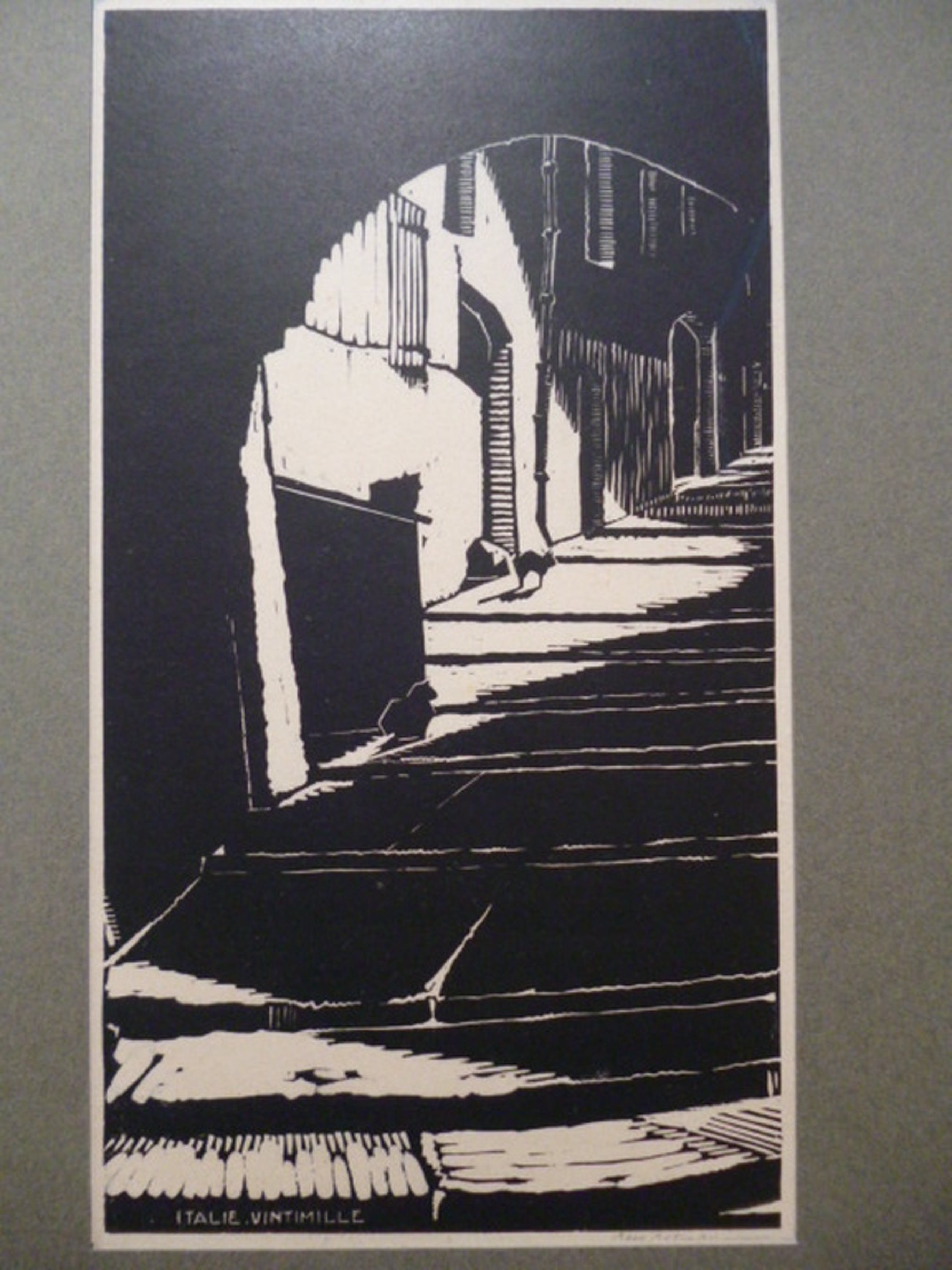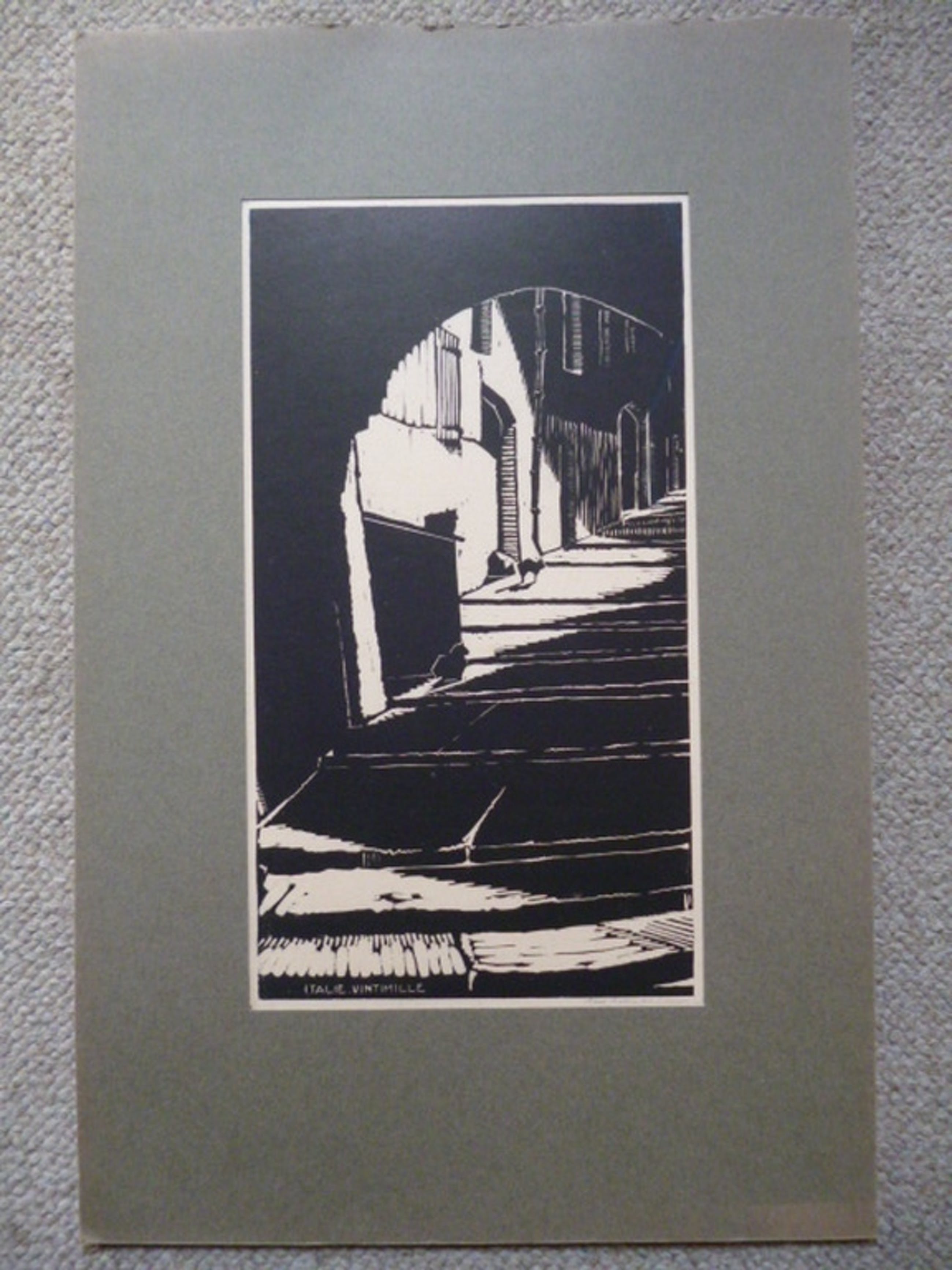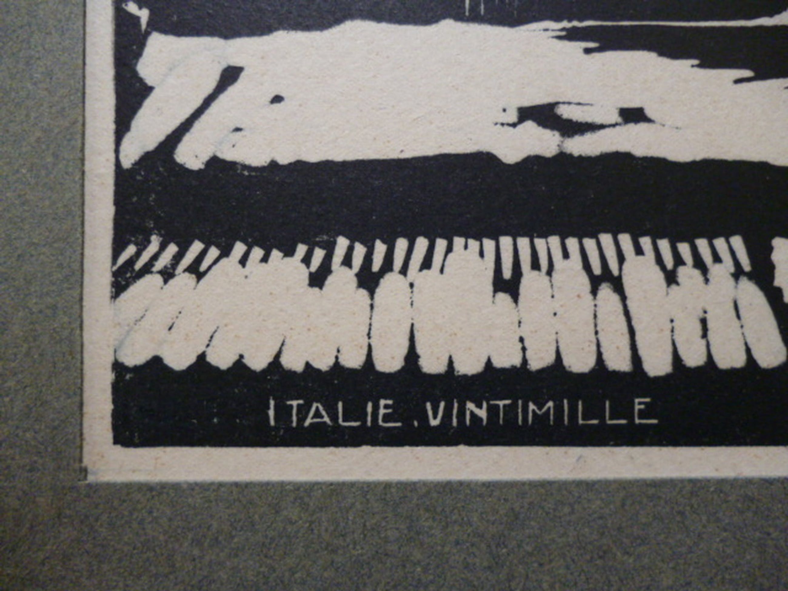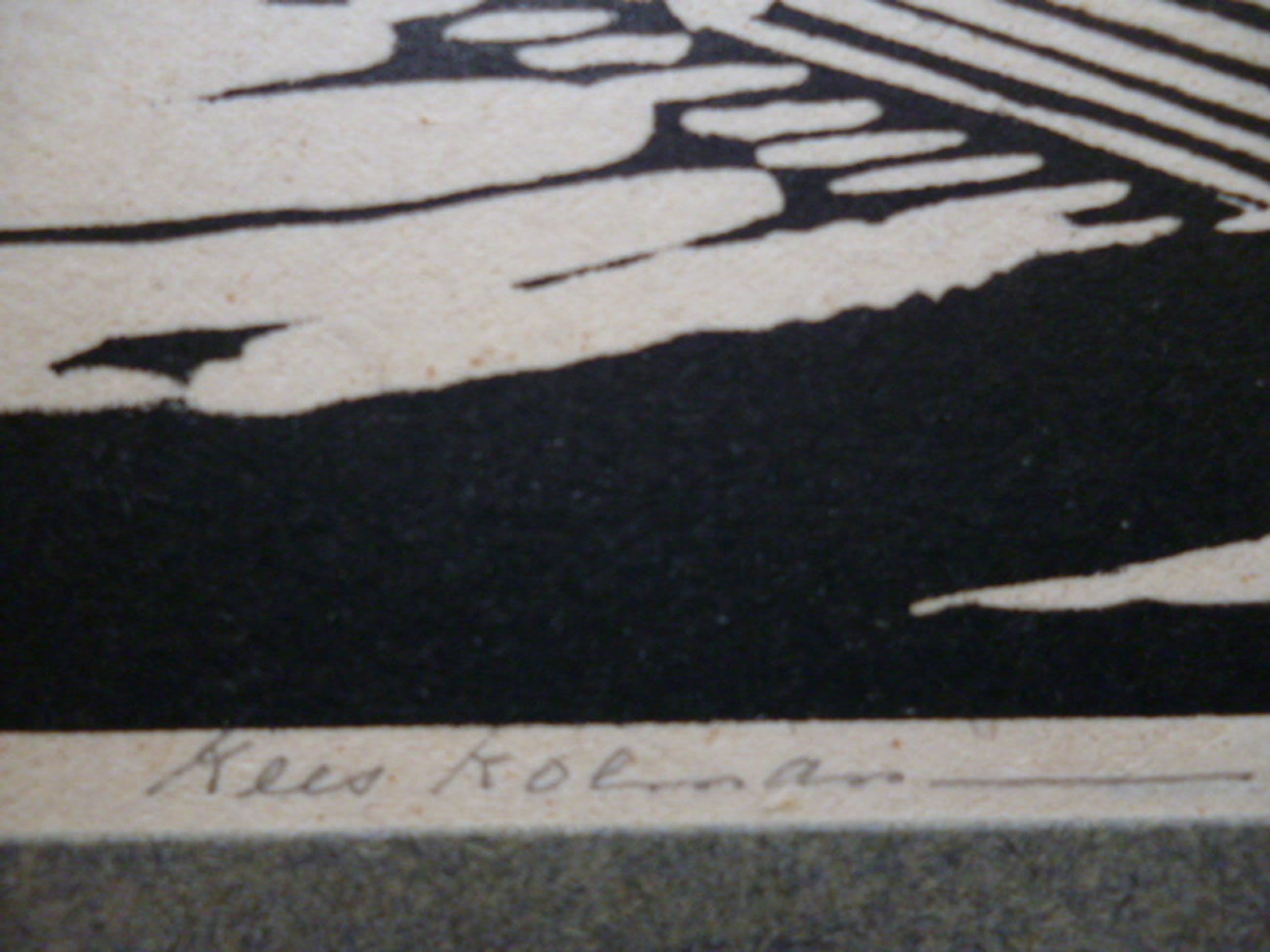 Houtsnede, potlood gesigneerd rechtsonder. Getiteld in het blok linksonder.
