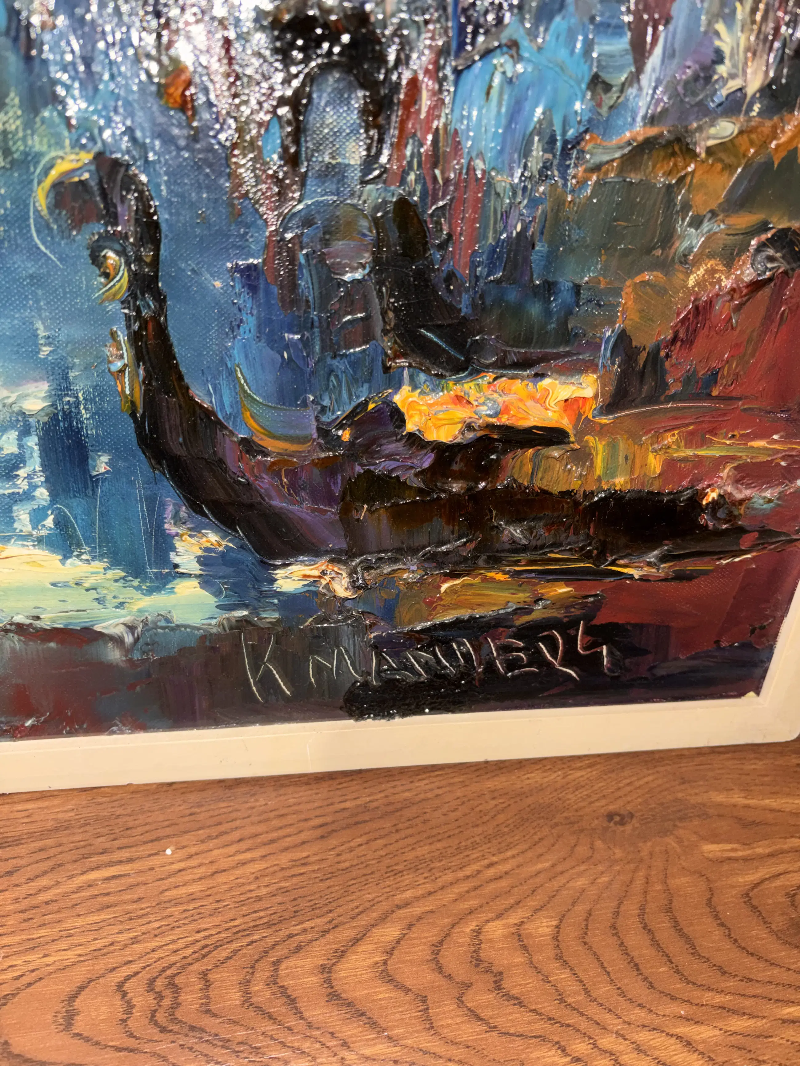 Het is een modern-impressionistisch stadsgezicht, uitgevoerd met een paletmes in de kenmerkende "impasto"-techniek (dikke lagen verf).