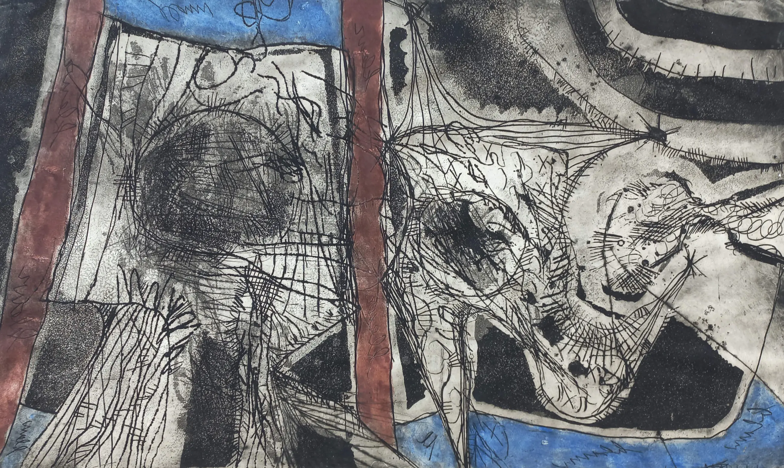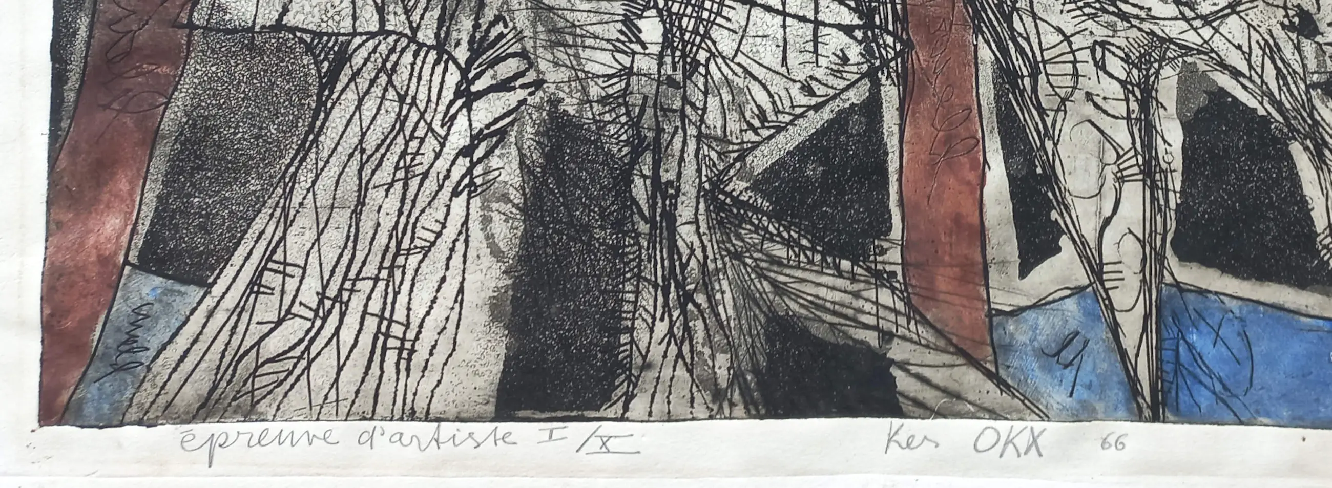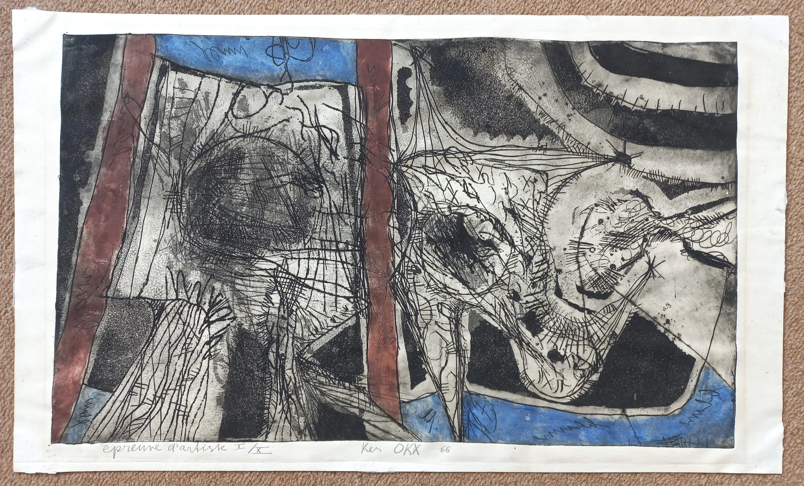 Karakteristiek werk van Kees Okx uit 1966. Aquatint ets op geschept papier, met potlood gesigneerd, gedateerd en genummerd (I/X). In redelijk goede conditie.