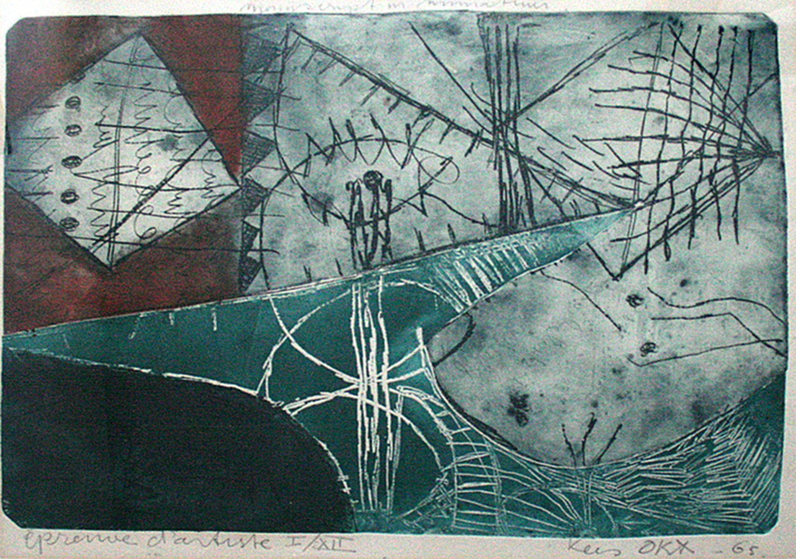 Ets van de Haarlemse kunstenaar Kees Okx uit 1965. Gesigneerd, E/A, I/XII. Afmeting (beeld): 32x45 cm