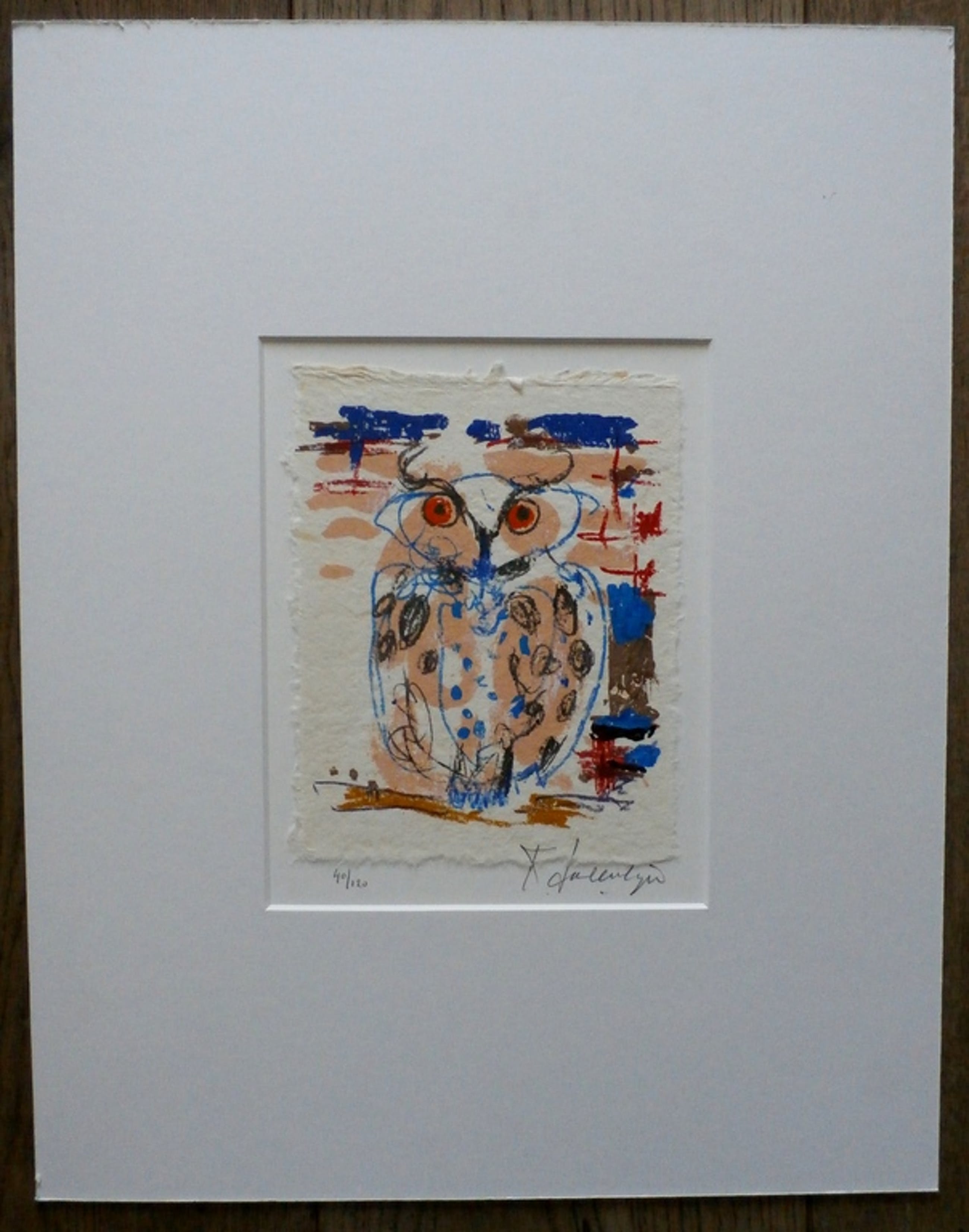 Kees Salentijn - litho: Uil ; nummer: 40/120; het werk is rechtsonder door de kunstenaar, met potlood, gesigneerd; het werk is gedrukt op Japans papier; afm. voorstelling: h20,5 x b17 cm; afm. incl. passe-partout: h50 x b40 cm
