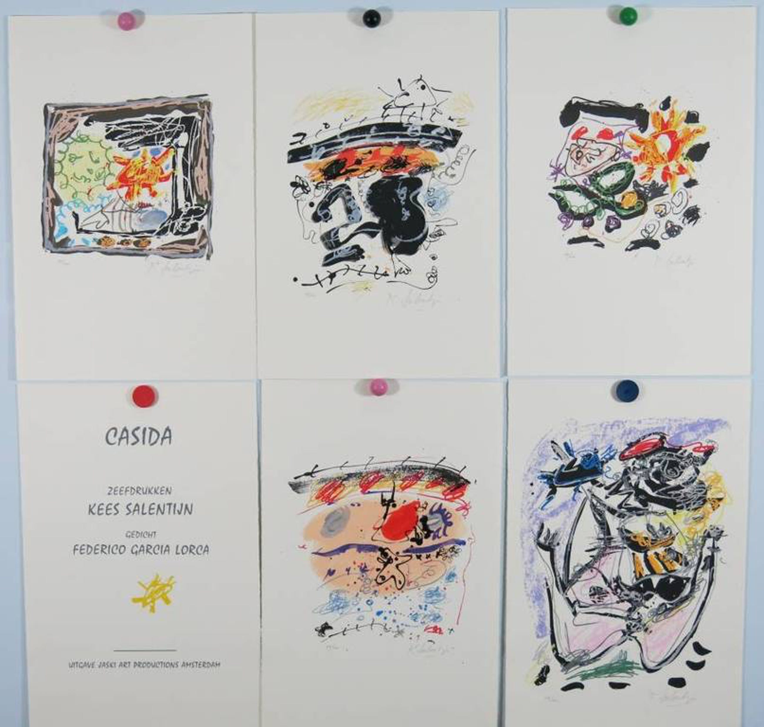 Materiaal: 5x Zeefdruk op geschept papier + (1x) gedicht Federico Garcia Lorca op geschept papier, in originele omslag