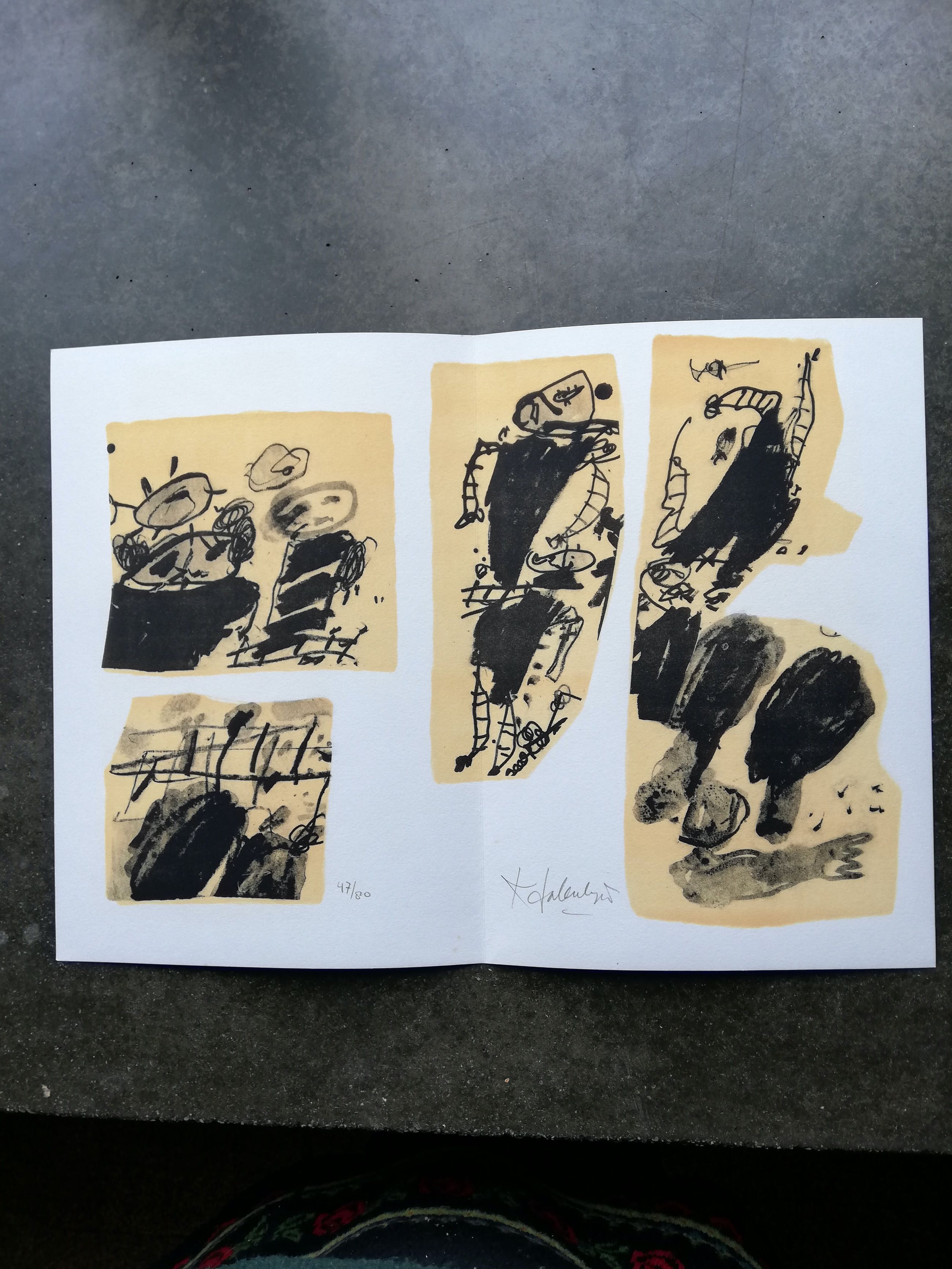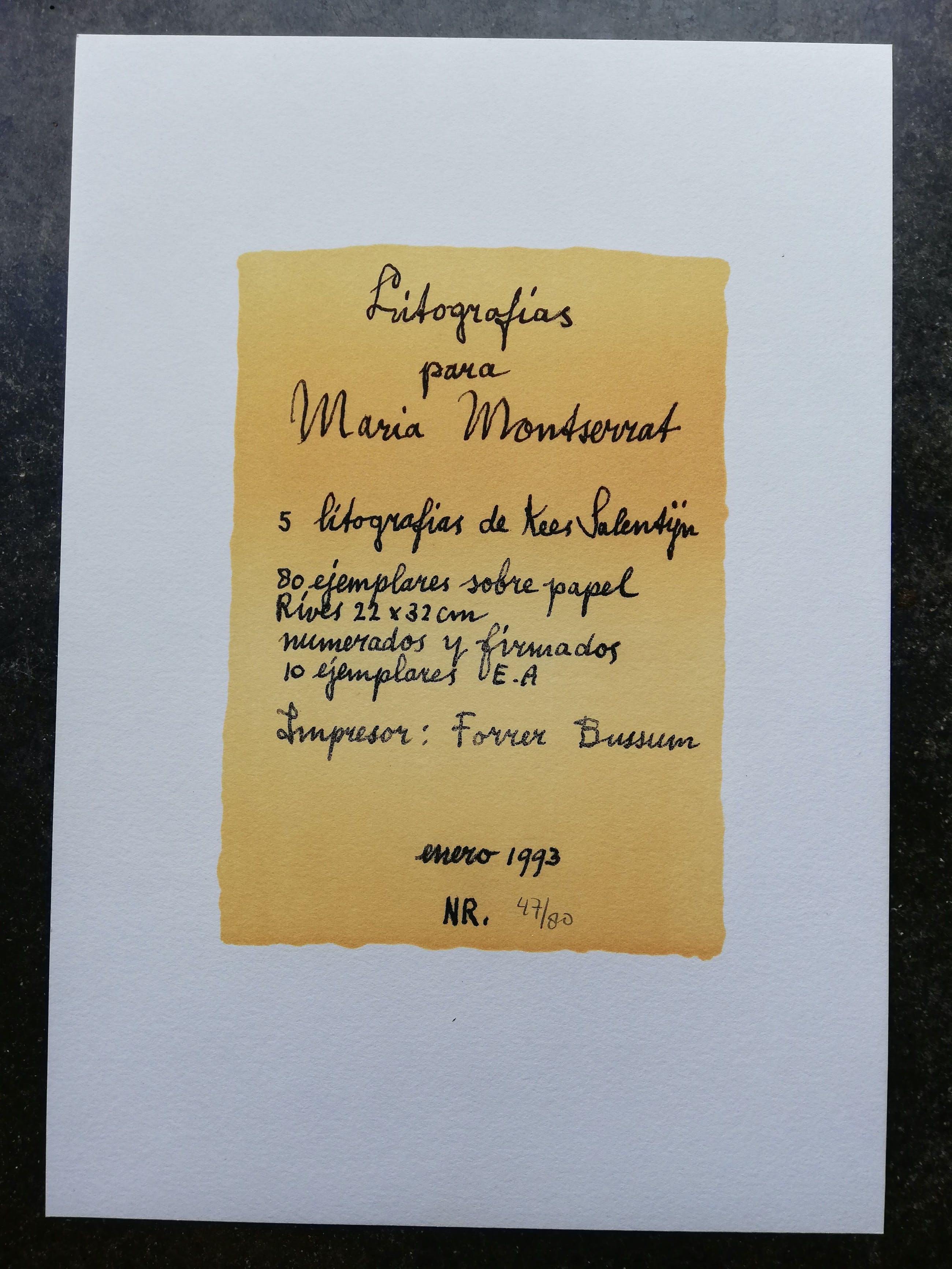 Cardboard portfolio (hardcover) with tipped-in cut-out colour lithographs on front-panel, signed by Salentijn in the lower right, 32 x 23 cms., containing colophon leaf, handnumbered '47/80' and 5 (including 1 double-page) colour lithographs.
