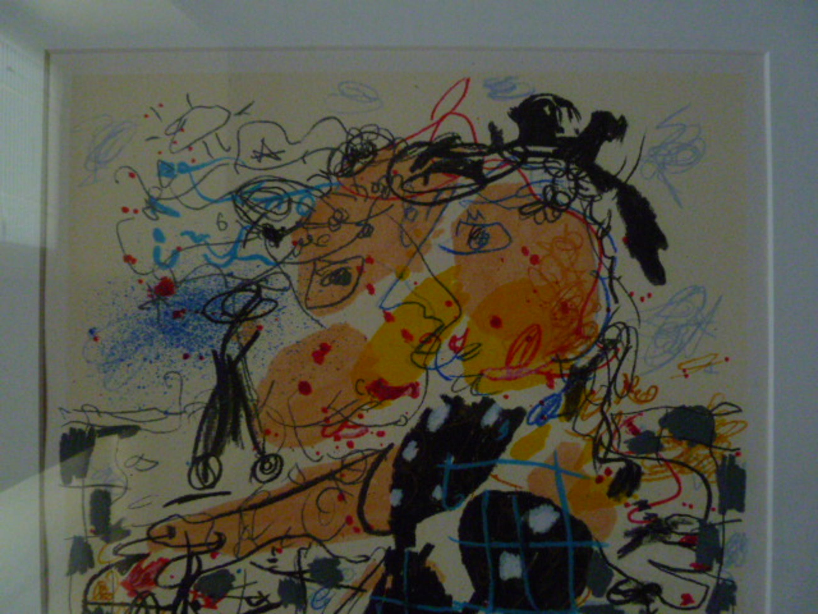 Vrolijk werk in een vrije stijl. Kleurrijk en expressieve afbeelding van twee figuren die elkaar kussen. Er is een fiets in beeld. Kan gezien worden als een verliefd stel dat van fietsen houdt maar ook als een innige ontmoeting de een kwam te voet en de ander kwam lopend.