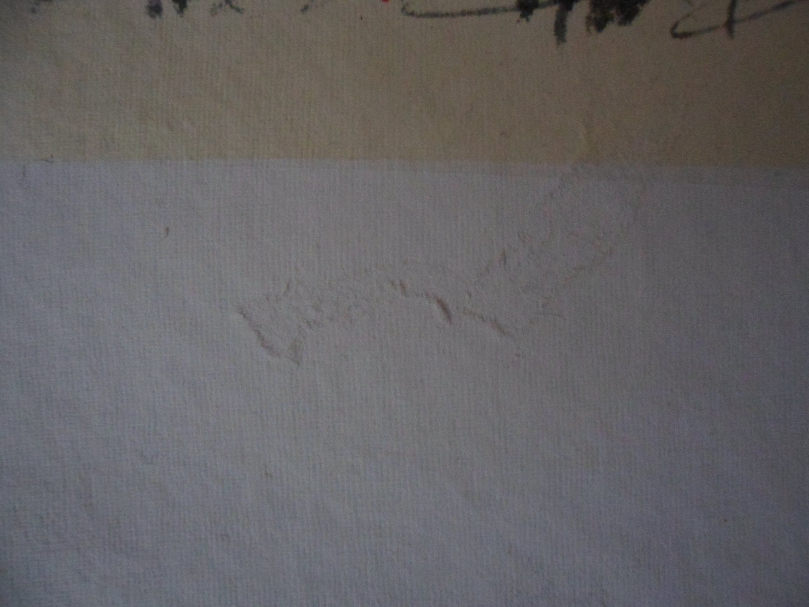| Zit een klein beschadiging onder in de zeefdruk is bijna niet te zien. Komt van een plakbandje. Zie de foto`s. | |||