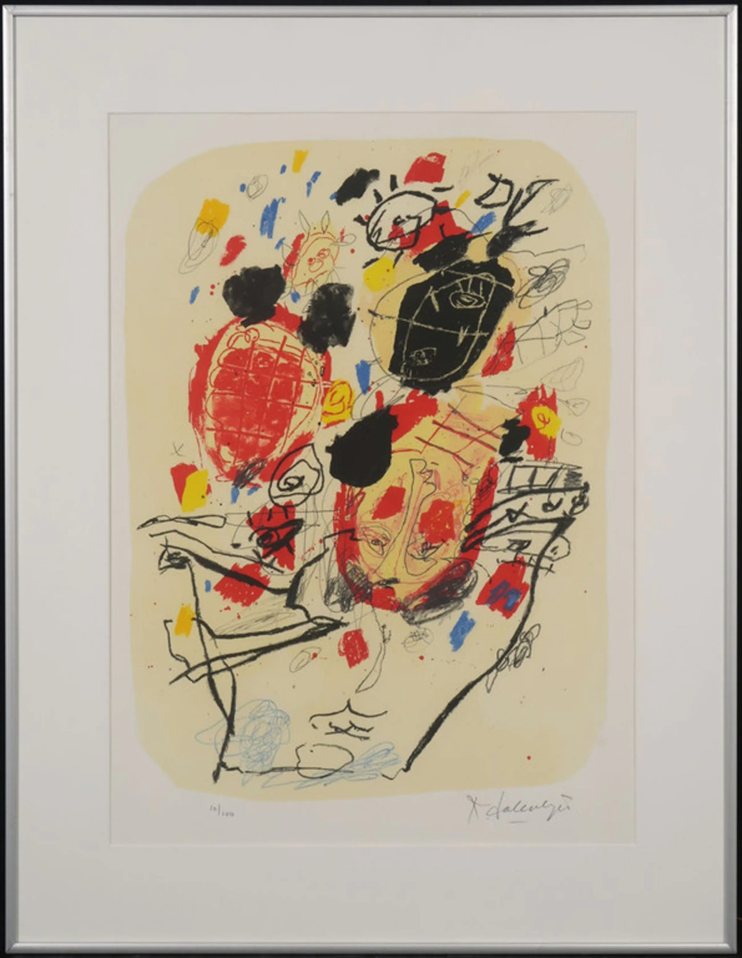 Veel Kees Salentijn te koop op mijn account. Mooie werken, hoge waarde. Titel: Sobre la mesa Jaartal: Niet gedateerd Afmetingen lijst: 76 cm x 61 cm Oplage: 10/100 Gesigneerd: Ja, handgeschreven met potlood (rechtsonder) Materiaal: Zeefdruk op papier Ingelijst: Ja, in aluminium ijst (kleine beschadiging aan het glas linksonder) Conditie kunstwerk: In zeer goede staat Oorspronkelijke galerieprijs: € 325,00
