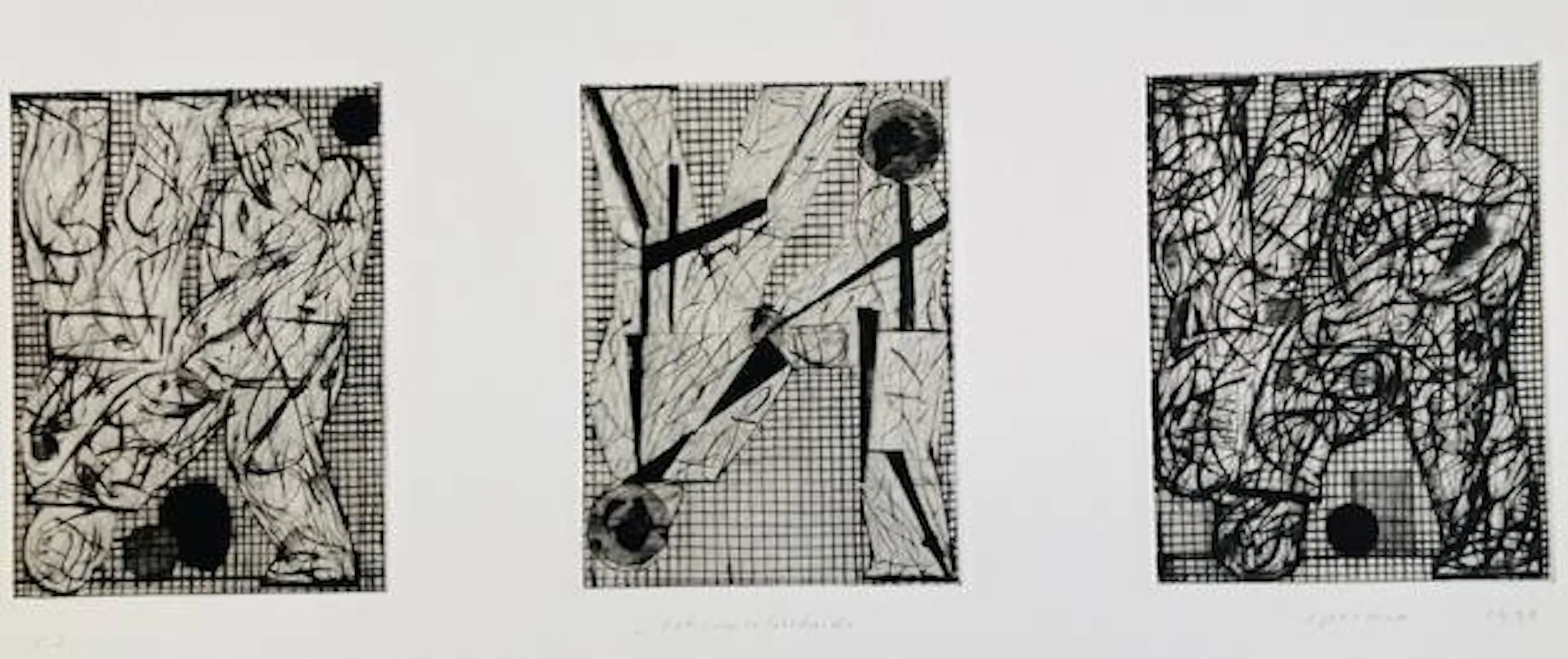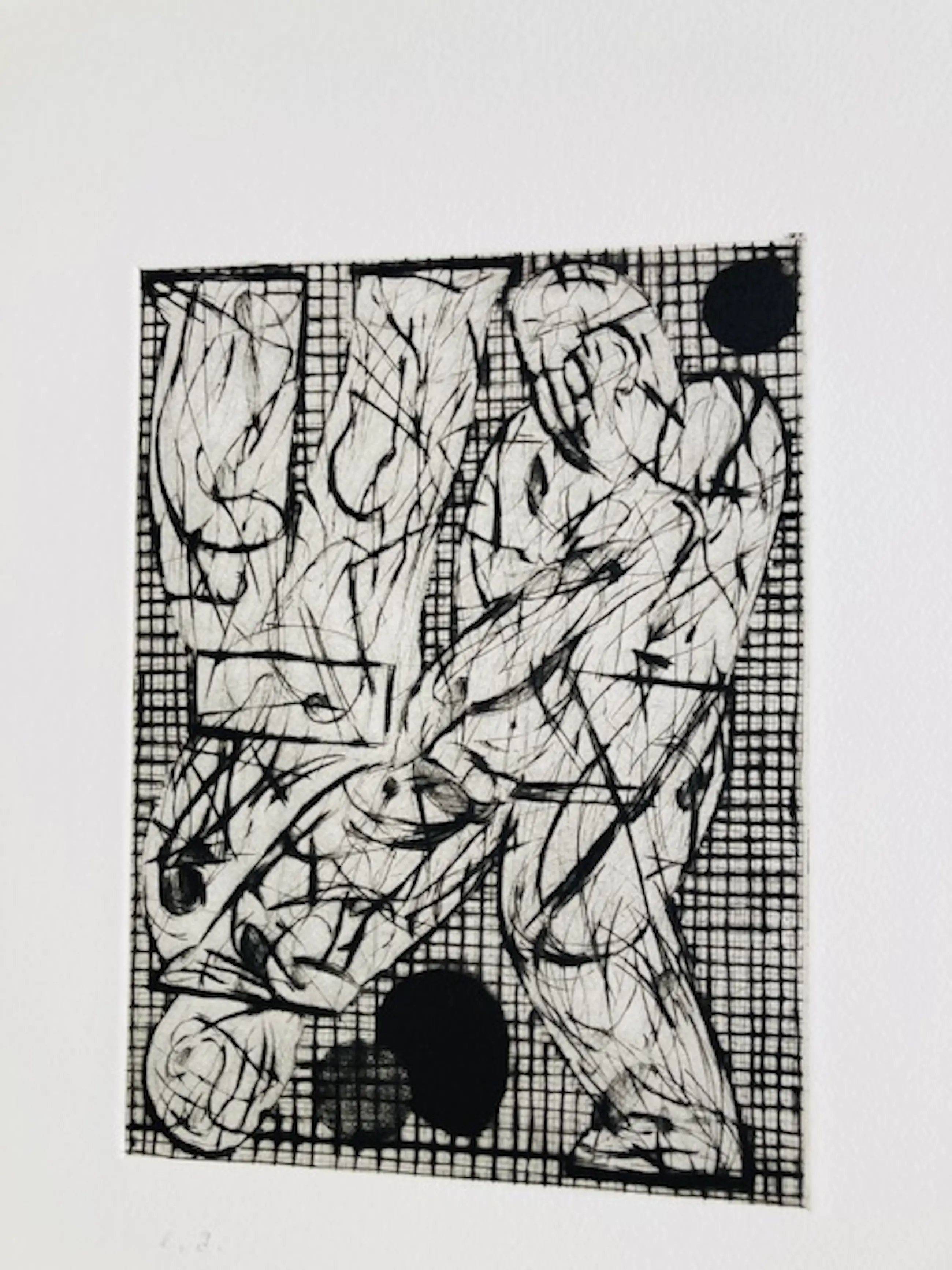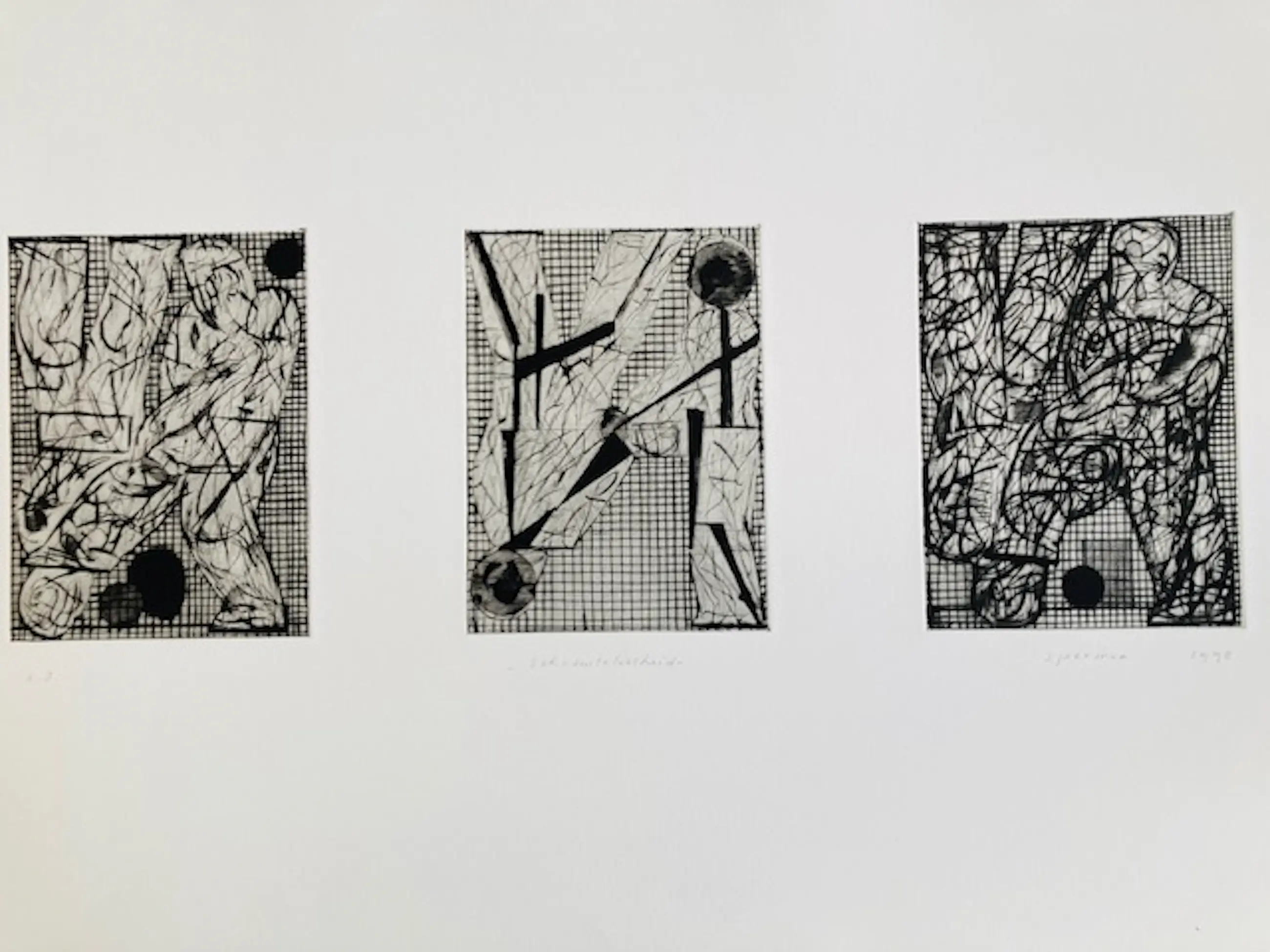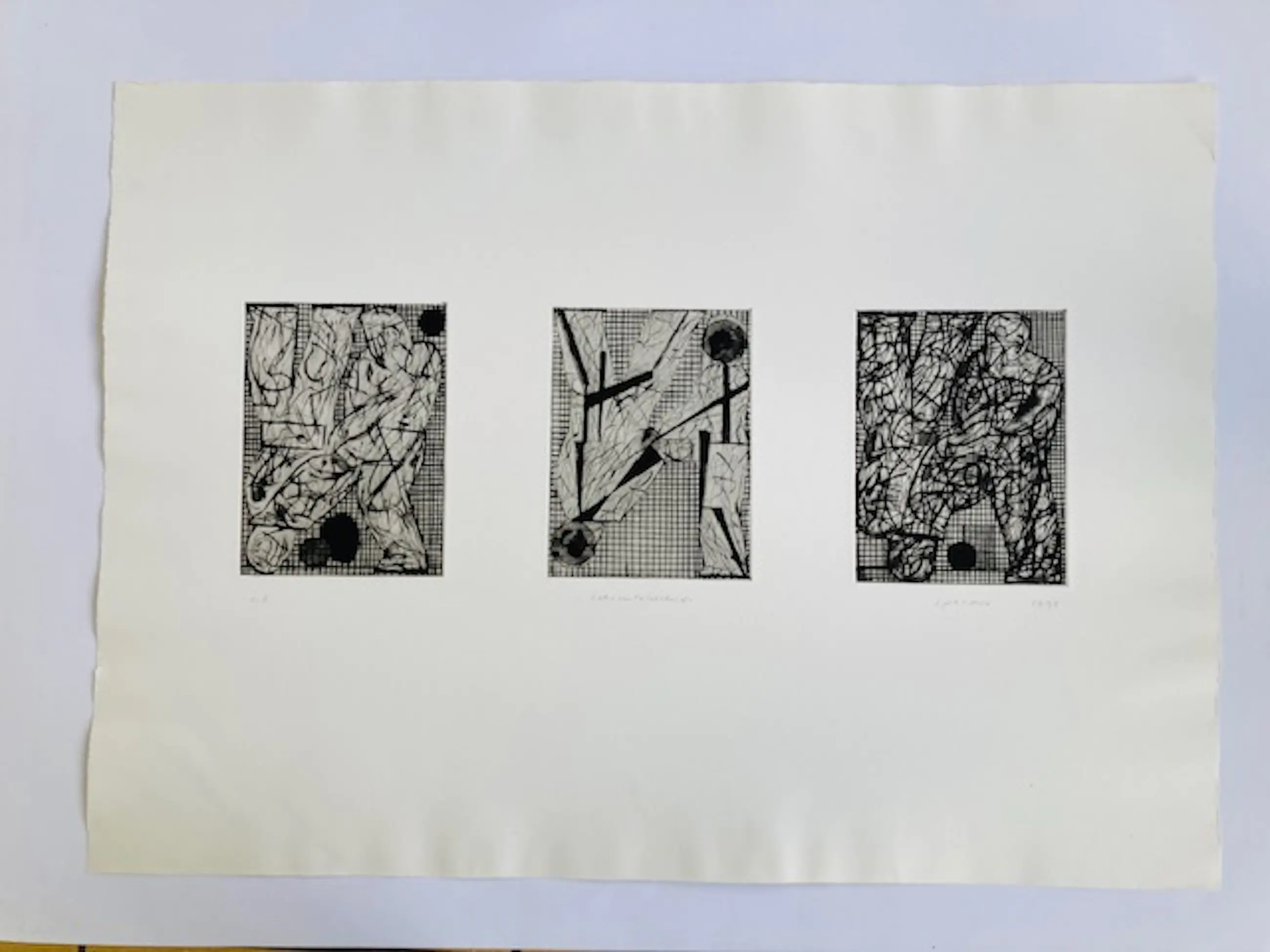 Fraaie ets van Kees Spermon. Het blad telt drie etsen die samen het beeld vormen. Let op de drie etsen zijn dus veel kleiner dan de totale papiermaat. (zie foto's) Gesigneerd, en genummerd in potlood.