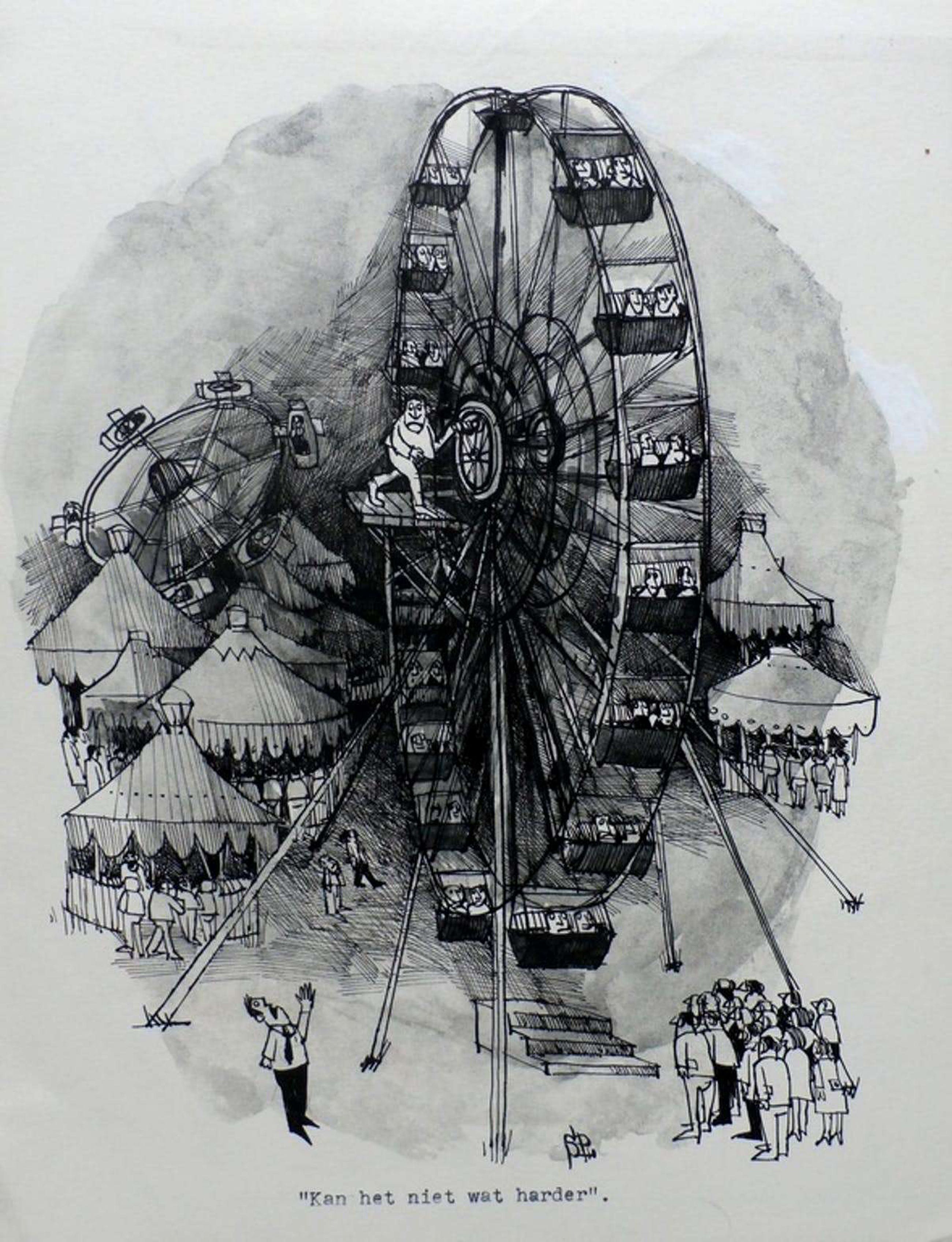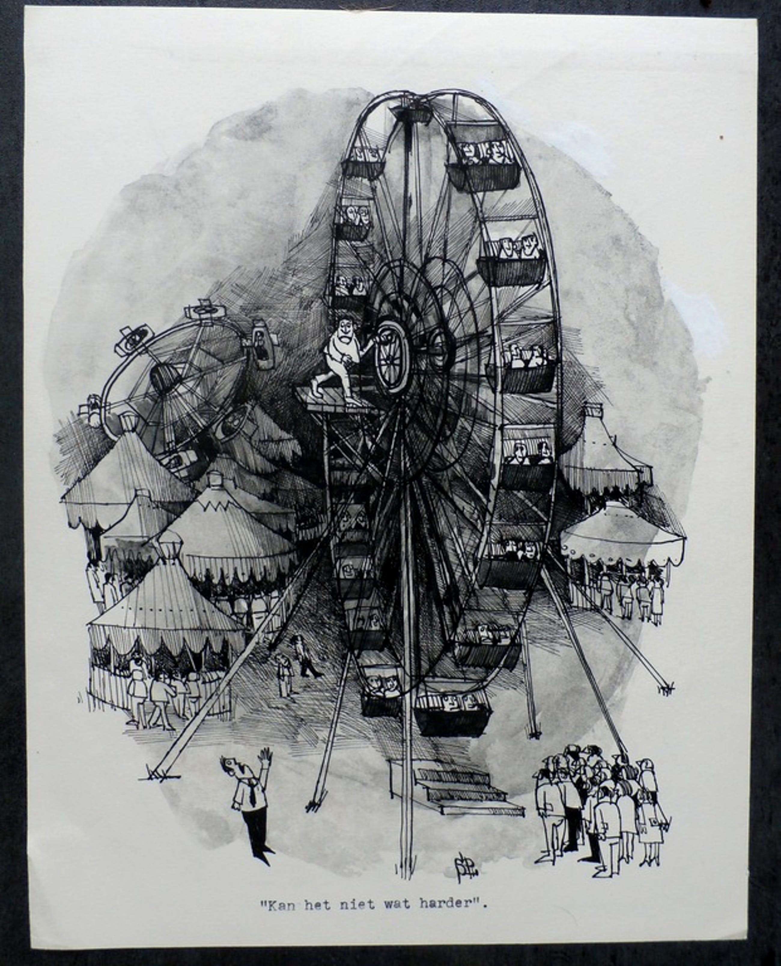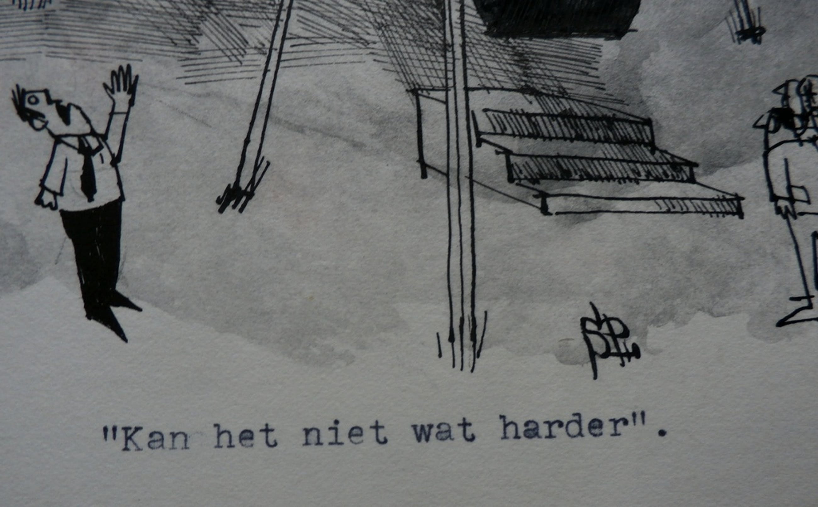 Prachtige tekening van Kees Spermon. Titel: "Kan het niet wat harder". Afmetingen: H26 x b21 cm. De tekening stamt uit de eind jaren zestig. Het werk is middenonder gesigneerd met SP. De authenticiteit van het, aangeboden, werk wordt volledig gegarandeerd. Een certificaat van echtheid kan, op aanvraag, worden gemaild.