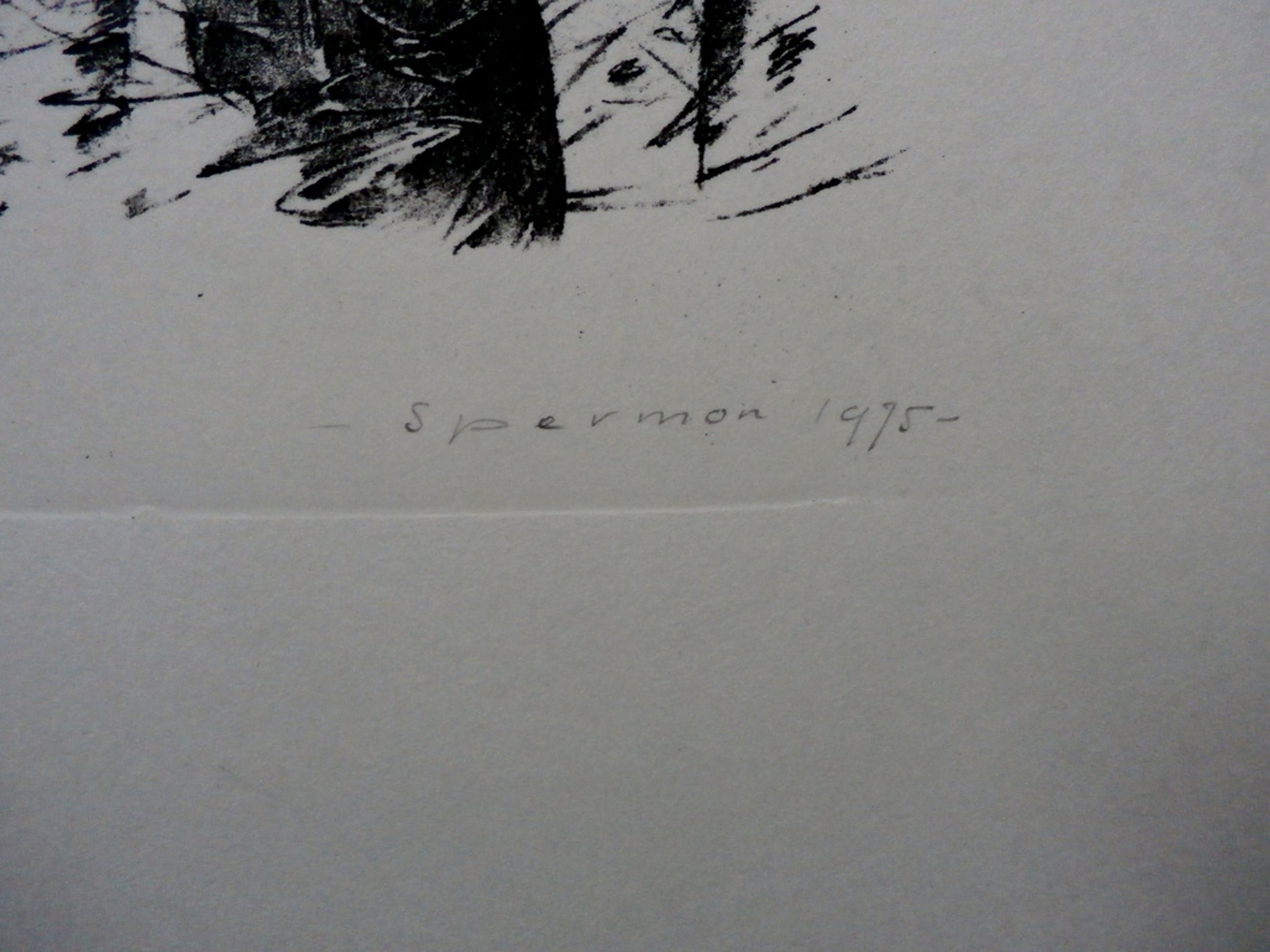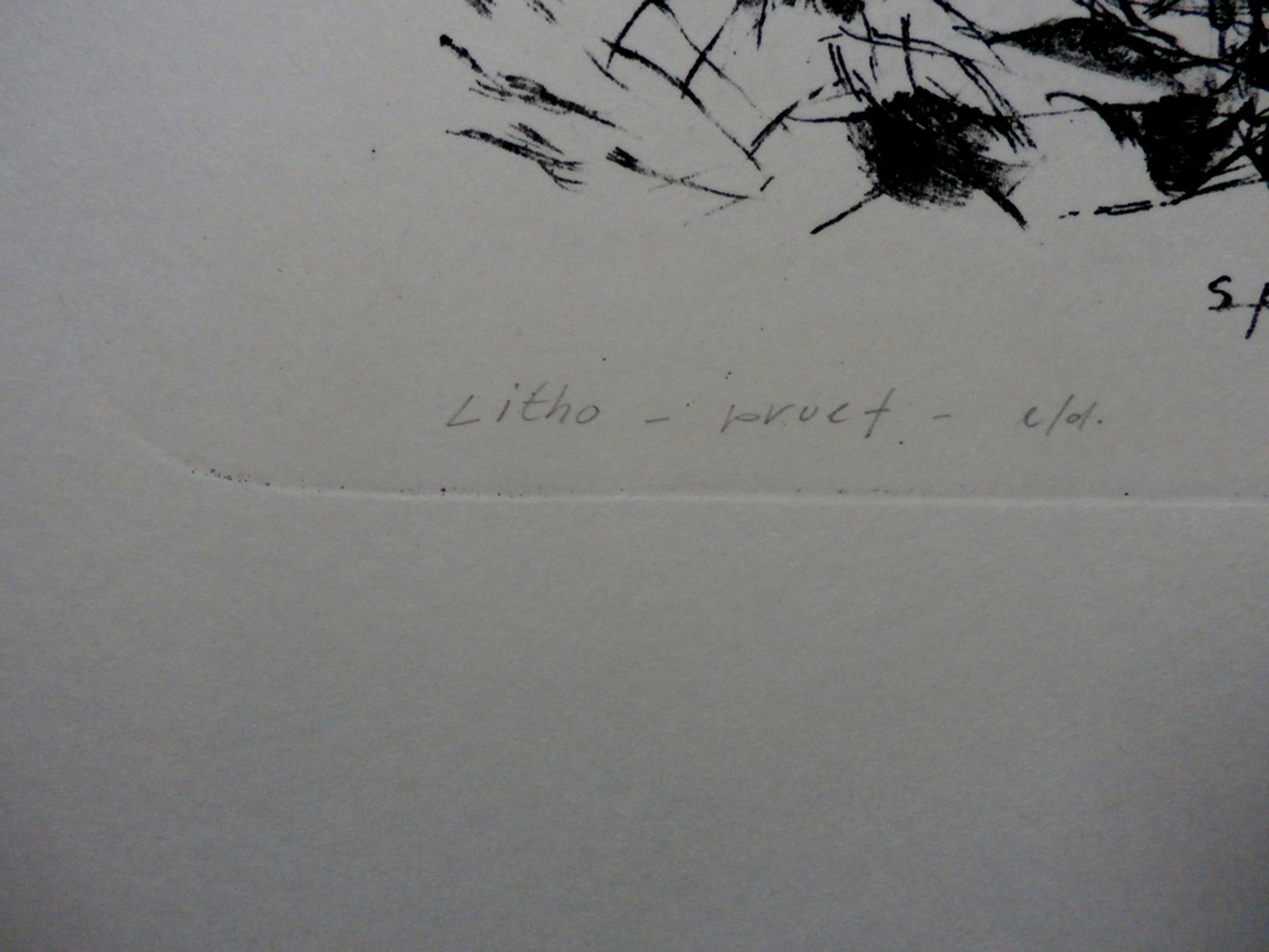 Litho van Kees Spermon. Jaar: 1975. Nummer: proefdruk. Afmetingen blad: H36 x b39 cm; Afmetingen voorstelling: H19 x b21 cm; Gesigneerd en gedateerd, rechtsonder, door de kunstenaar met potlood.