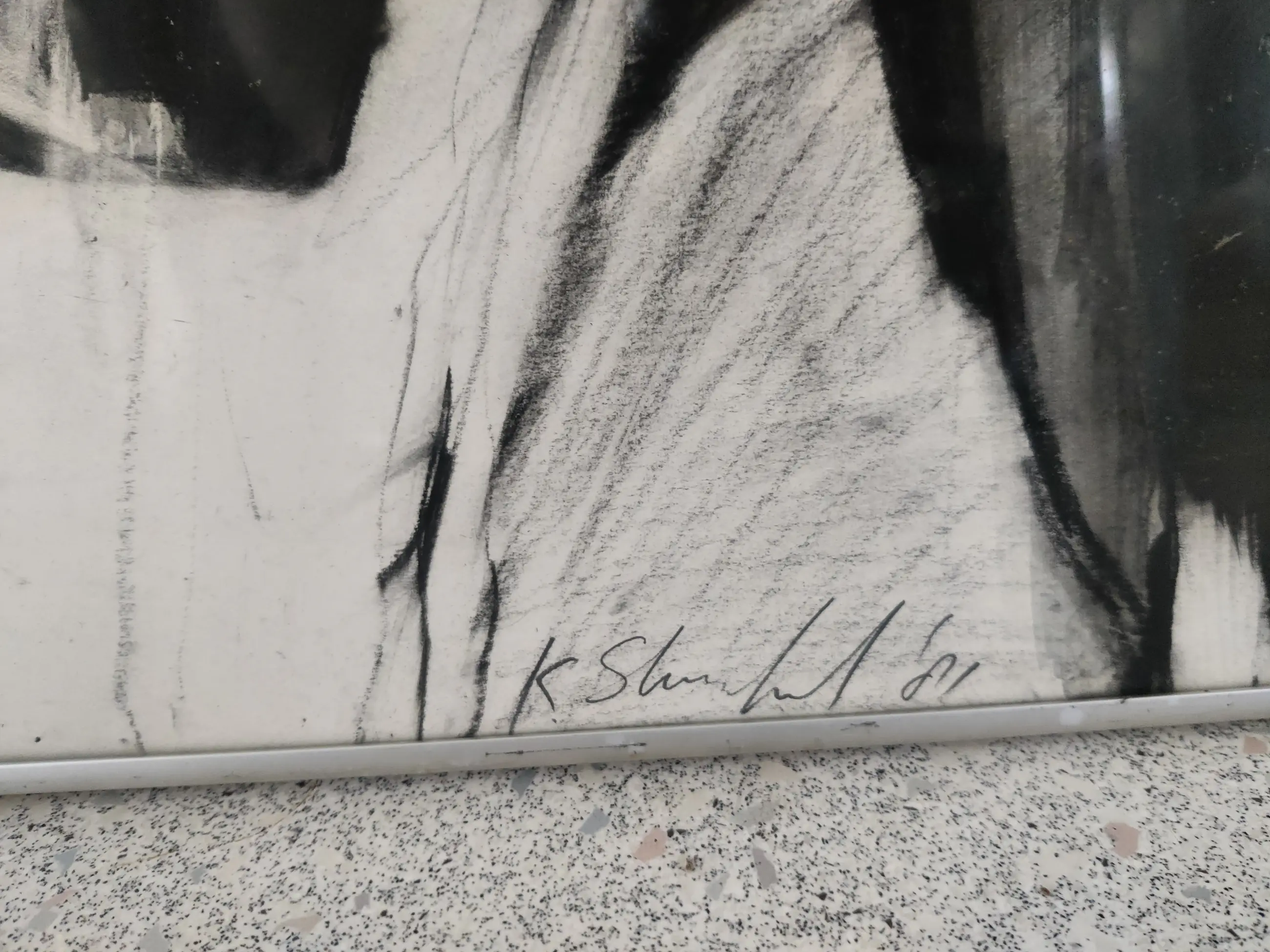 Mooi werk in houtkool, aquarel en krijt Glas stuk in 1 hoekje.