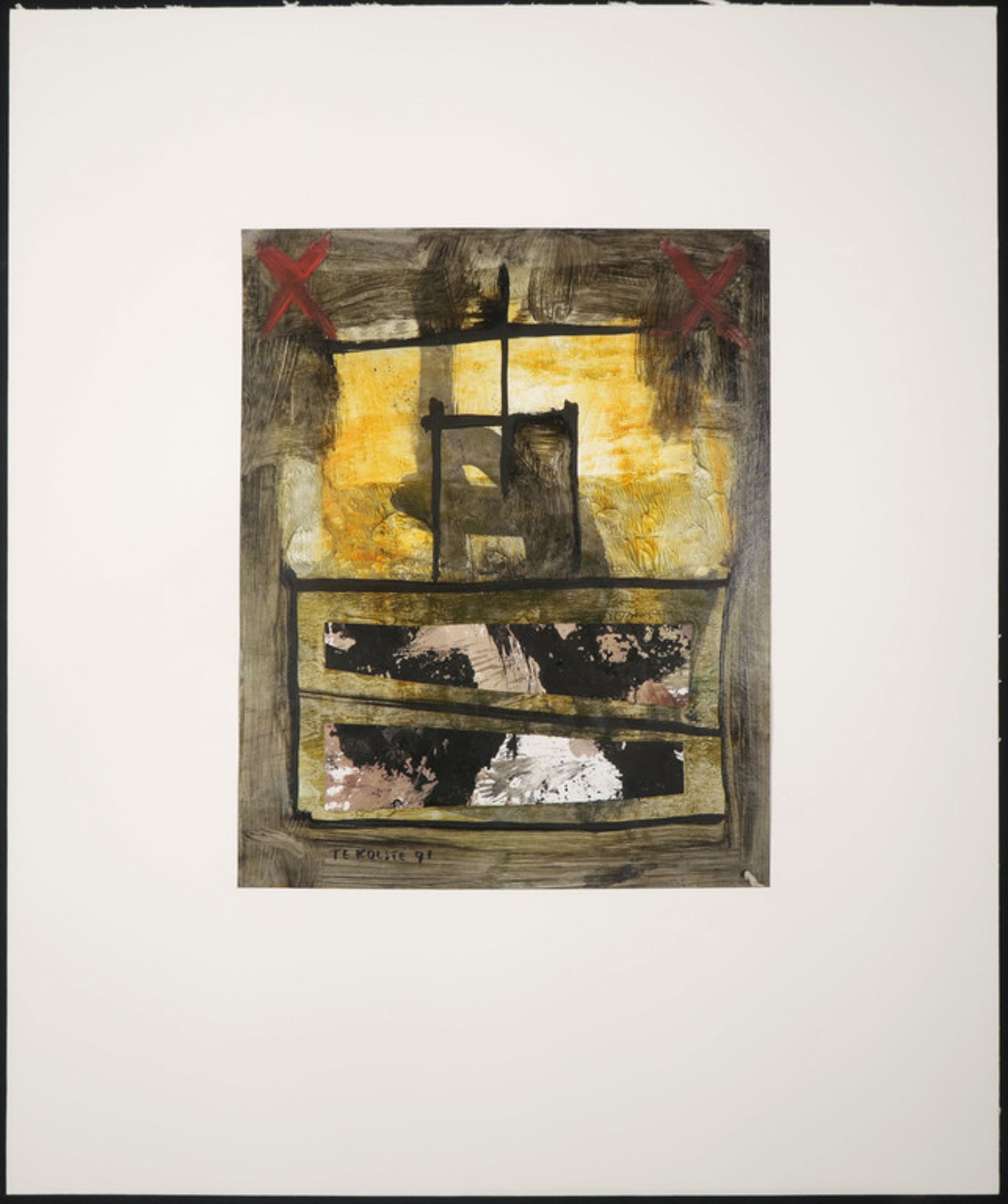 Materiaal: Acryl en papier collage op papier, bevestigd op stevig onderblad