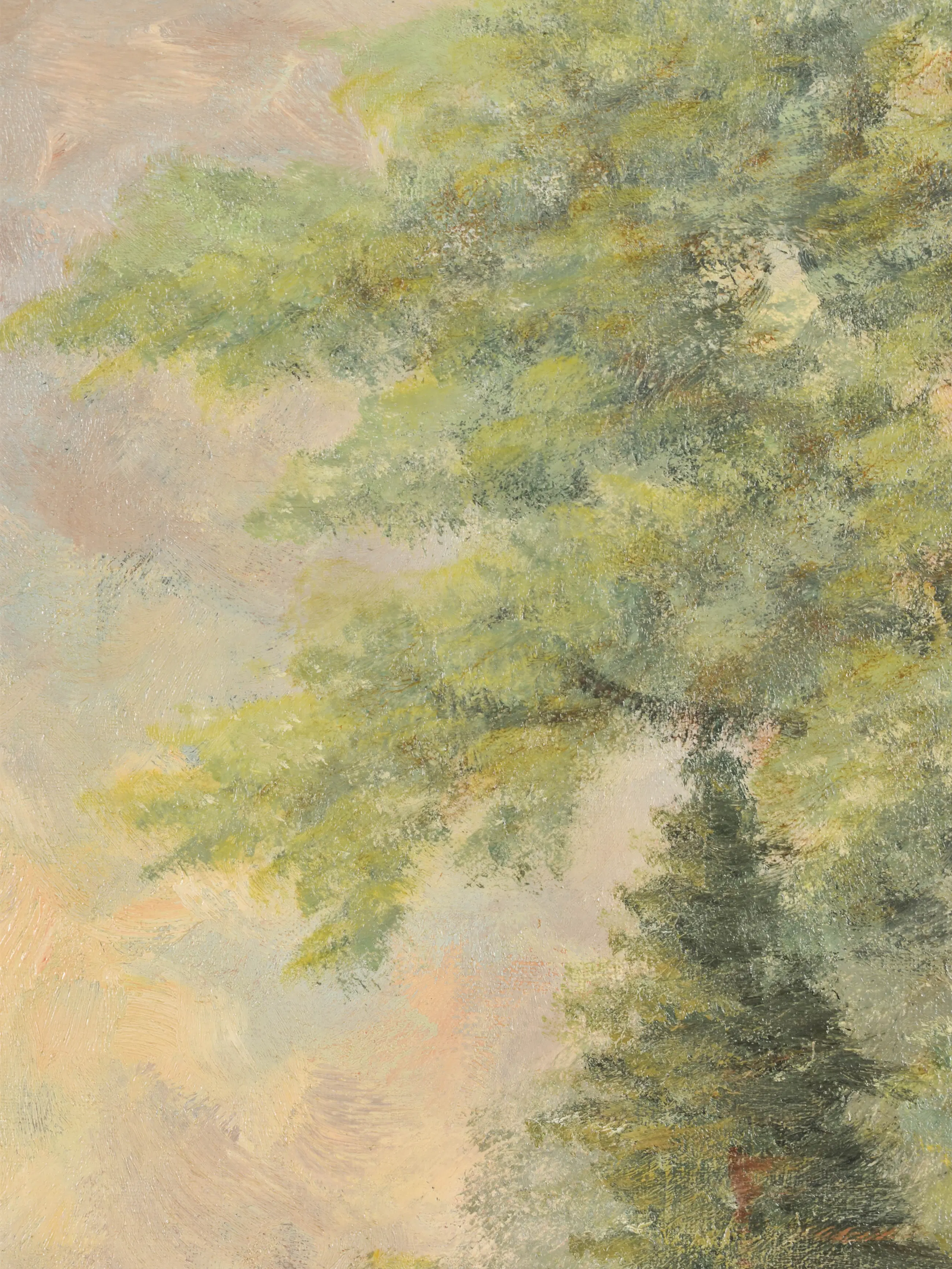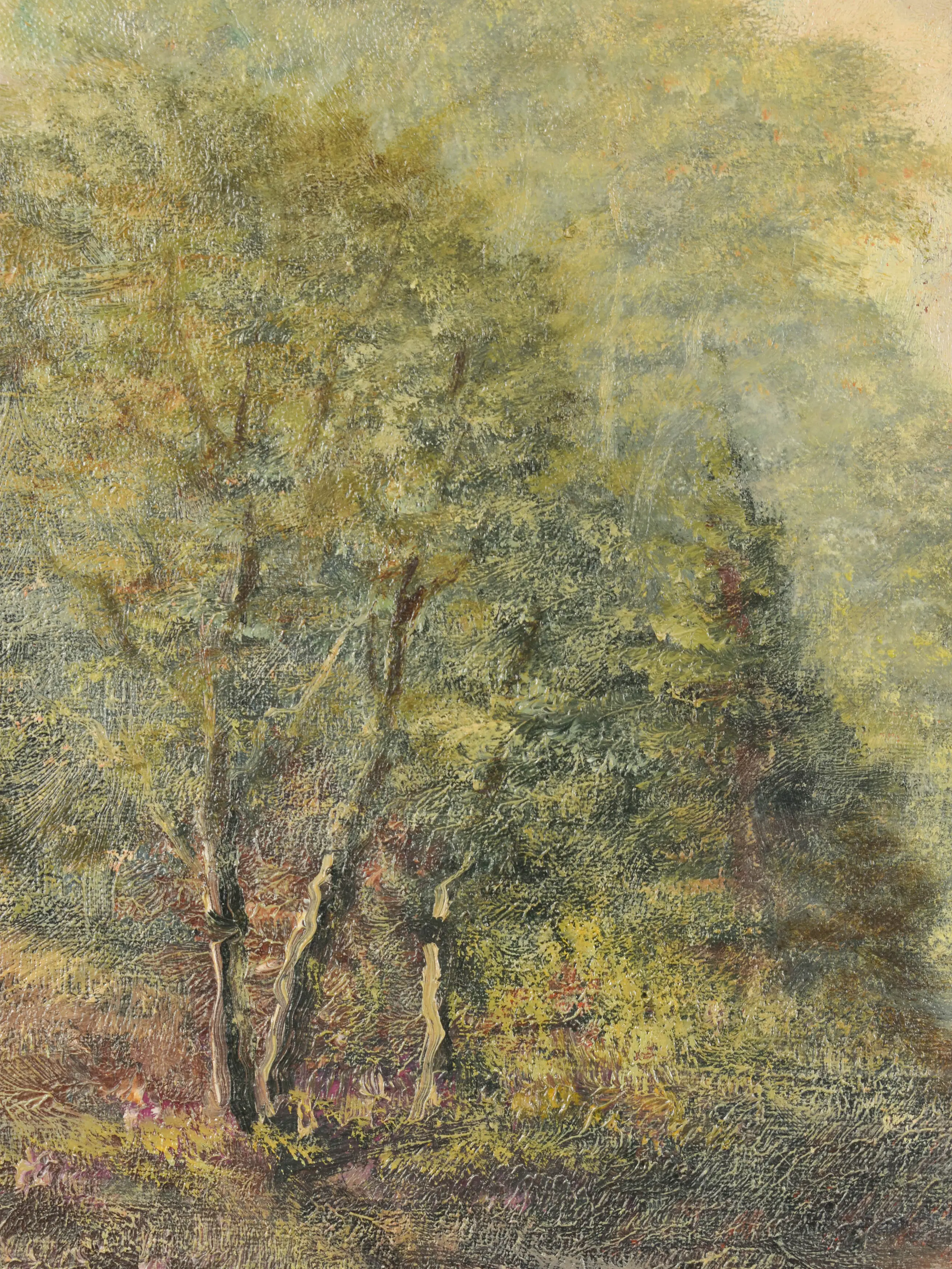 Dit mooie olieverfschilderij van Kees van Ameijden straalt rust en sereniteit uit. Het werk verbeeldt een zomerse wandeling en ademt een gevoel van stilte en warmte. Met verfijnde penseeltoetsen heeft de kunstenaar een subtiel bosgevoel op het doek weten te vangen — licht, lucht en natuur smelten samen tot een harmonisch geheel.