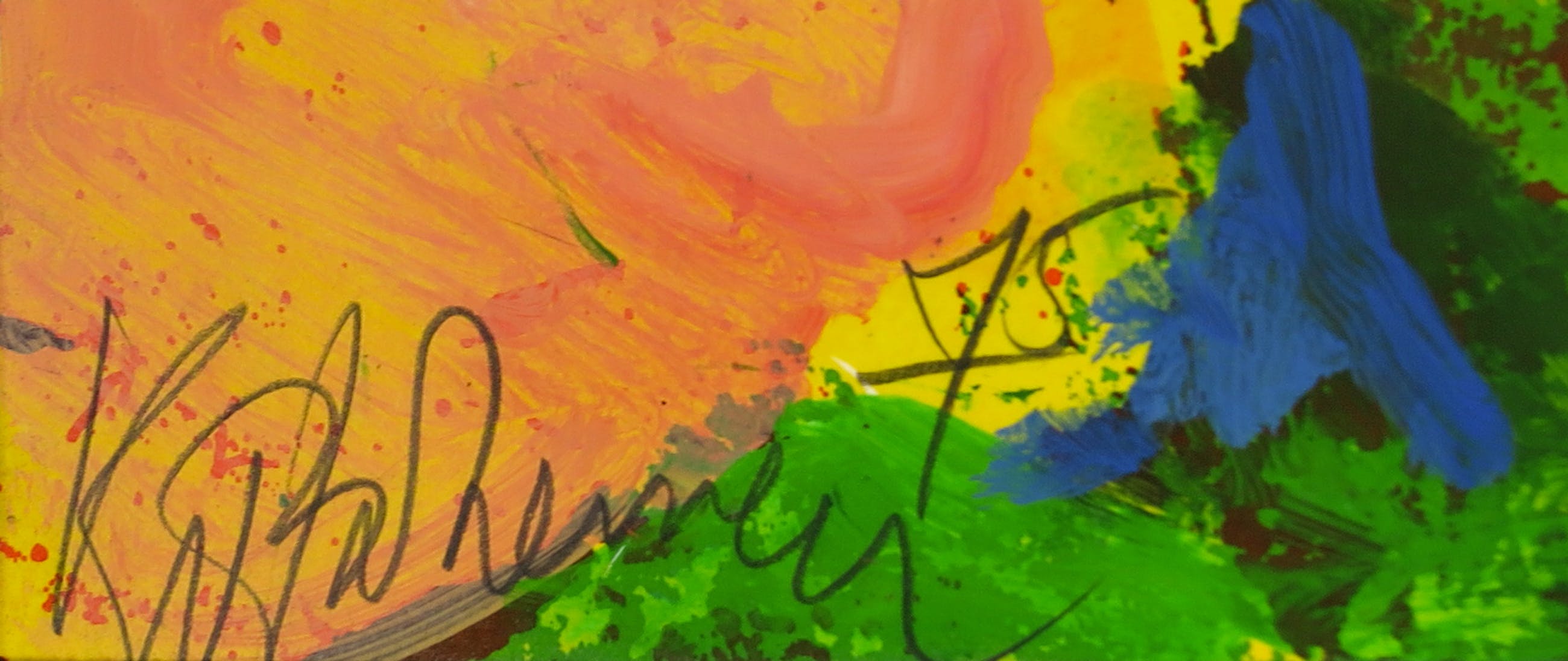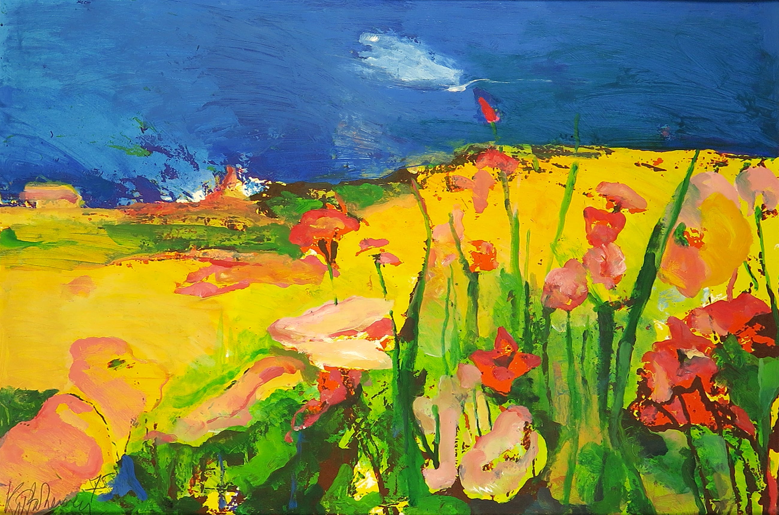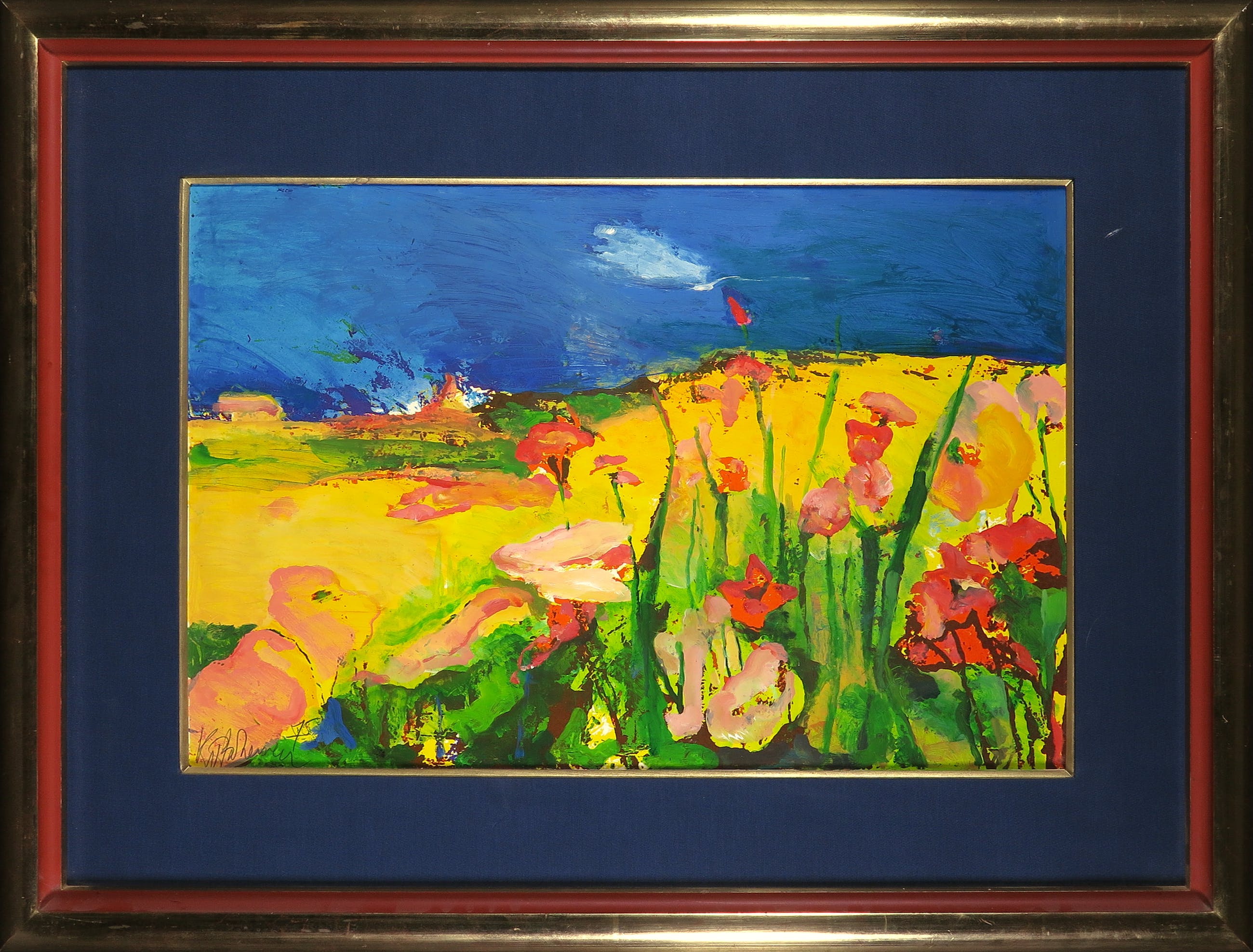 Kleurrijk landschap van Kees van Bohemen, in de hoek linksonder met de hand in potlood gesigneerd en gedateerd.