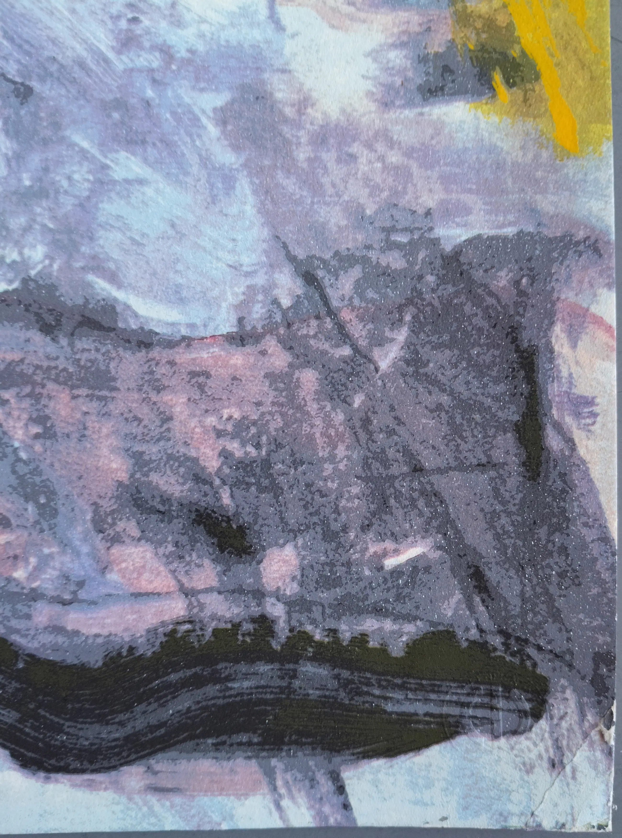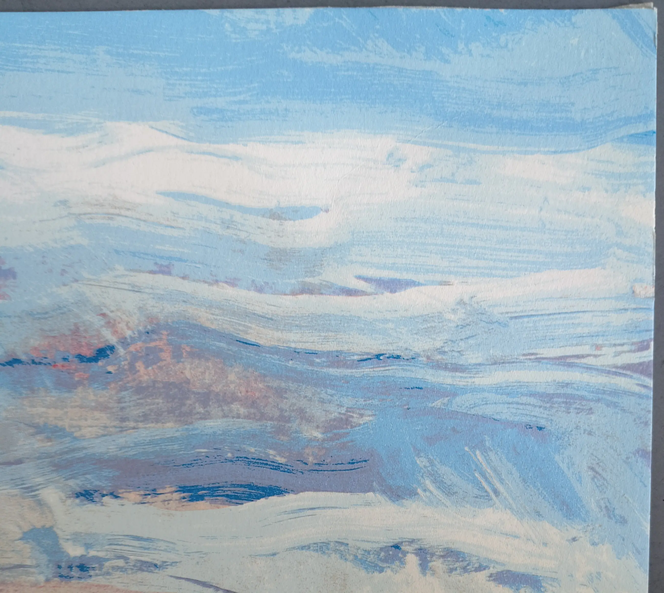 In 3 hoekjes zit een klein vouwtje en bij de rechter onder hoek een klein scheurtje. Aan de achter bovenzijde zit tape. Verder is de zeefdruk in prima staat.