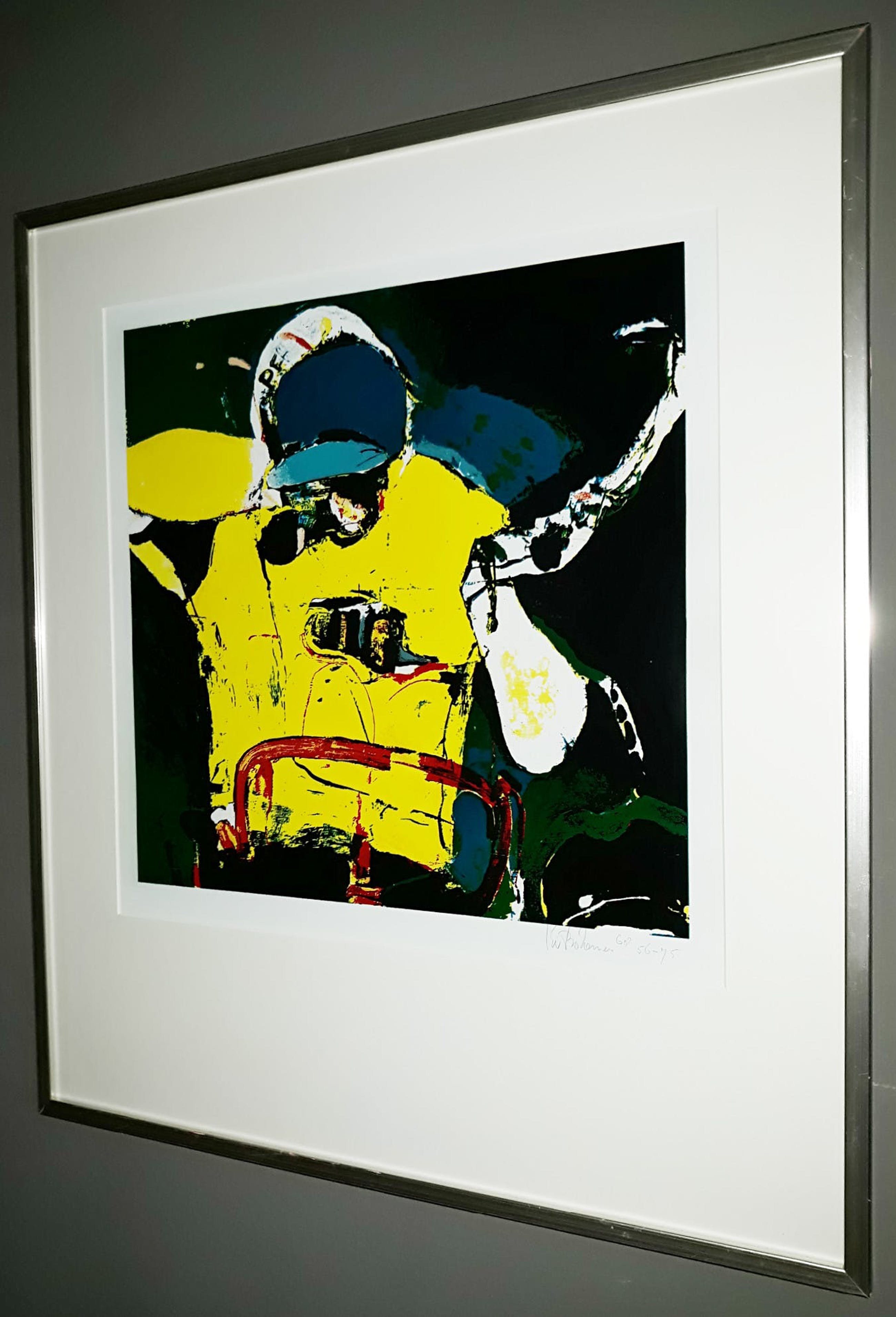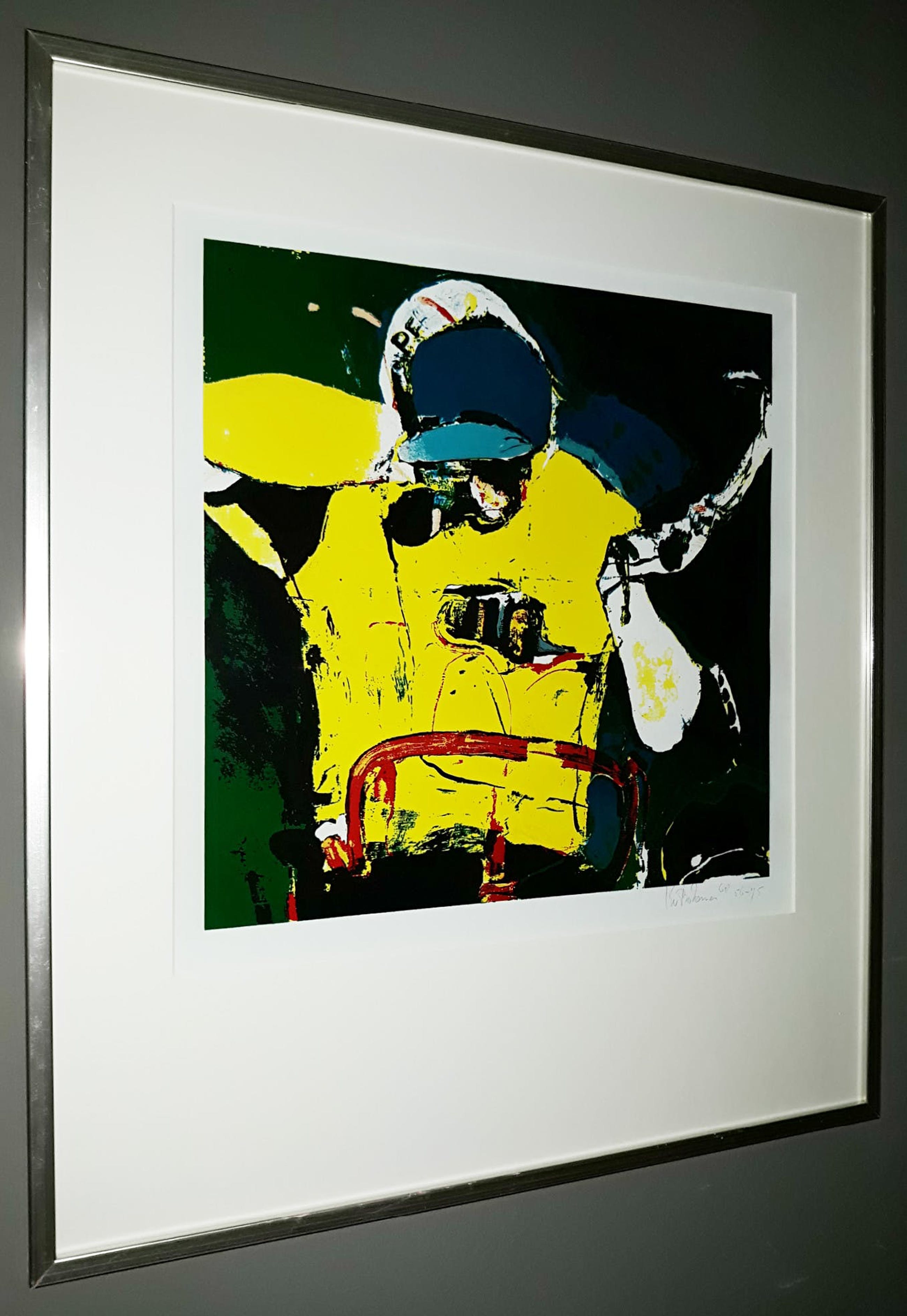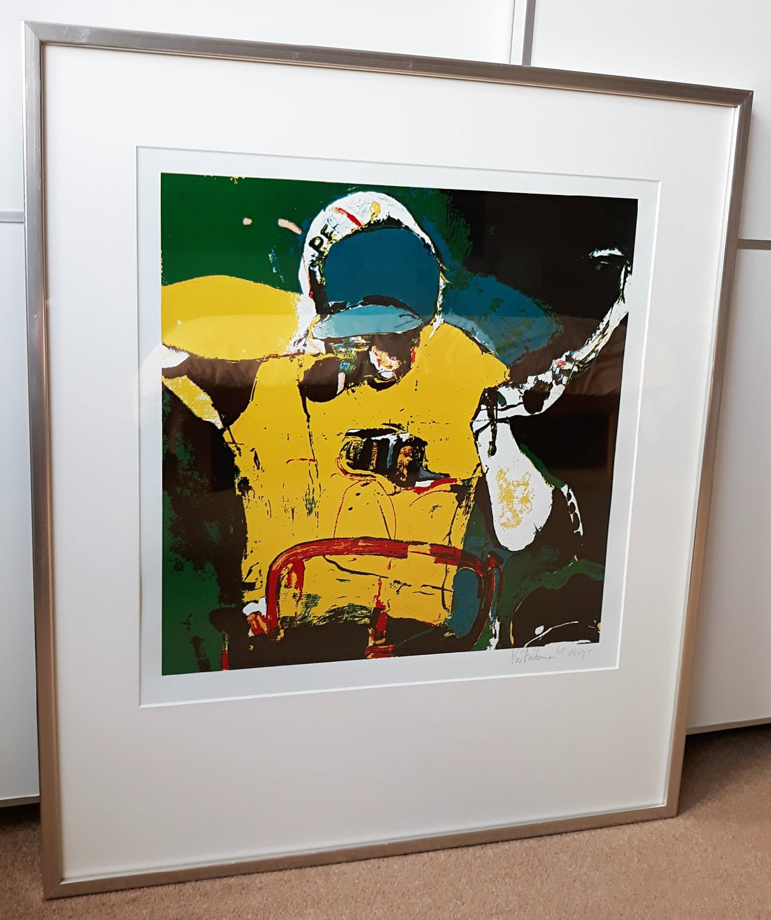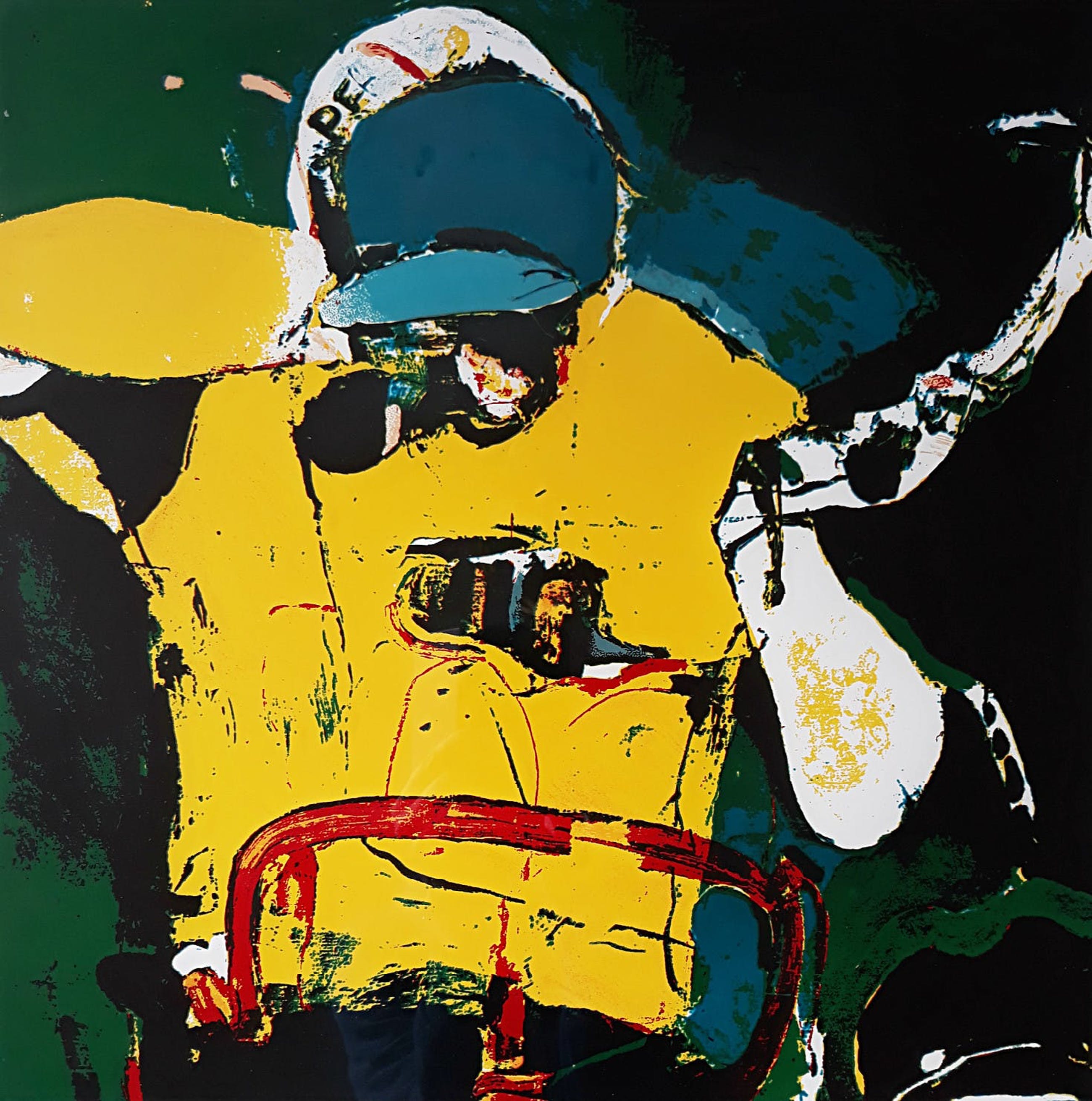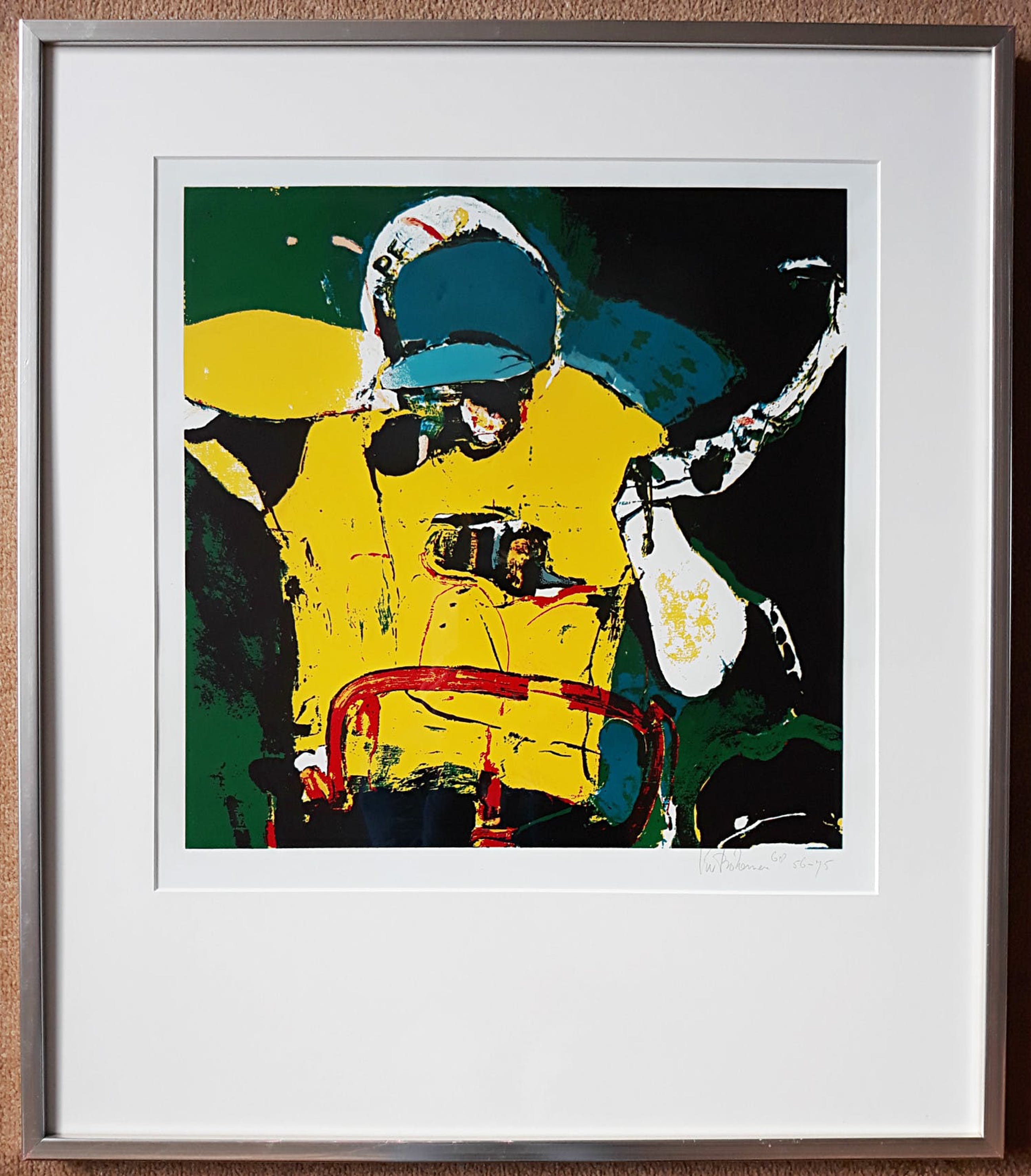 Prachtige zeefdruk van Kees van Bohemen; Jan Janssen die als eerste Nederlander de Tour de France wint (1968). Zeefdruk met hoogglans olieverf op glad papier, met potlood gesigneerd, gedateerd en genummerd (56-75). Alles in uitstekende conditie.