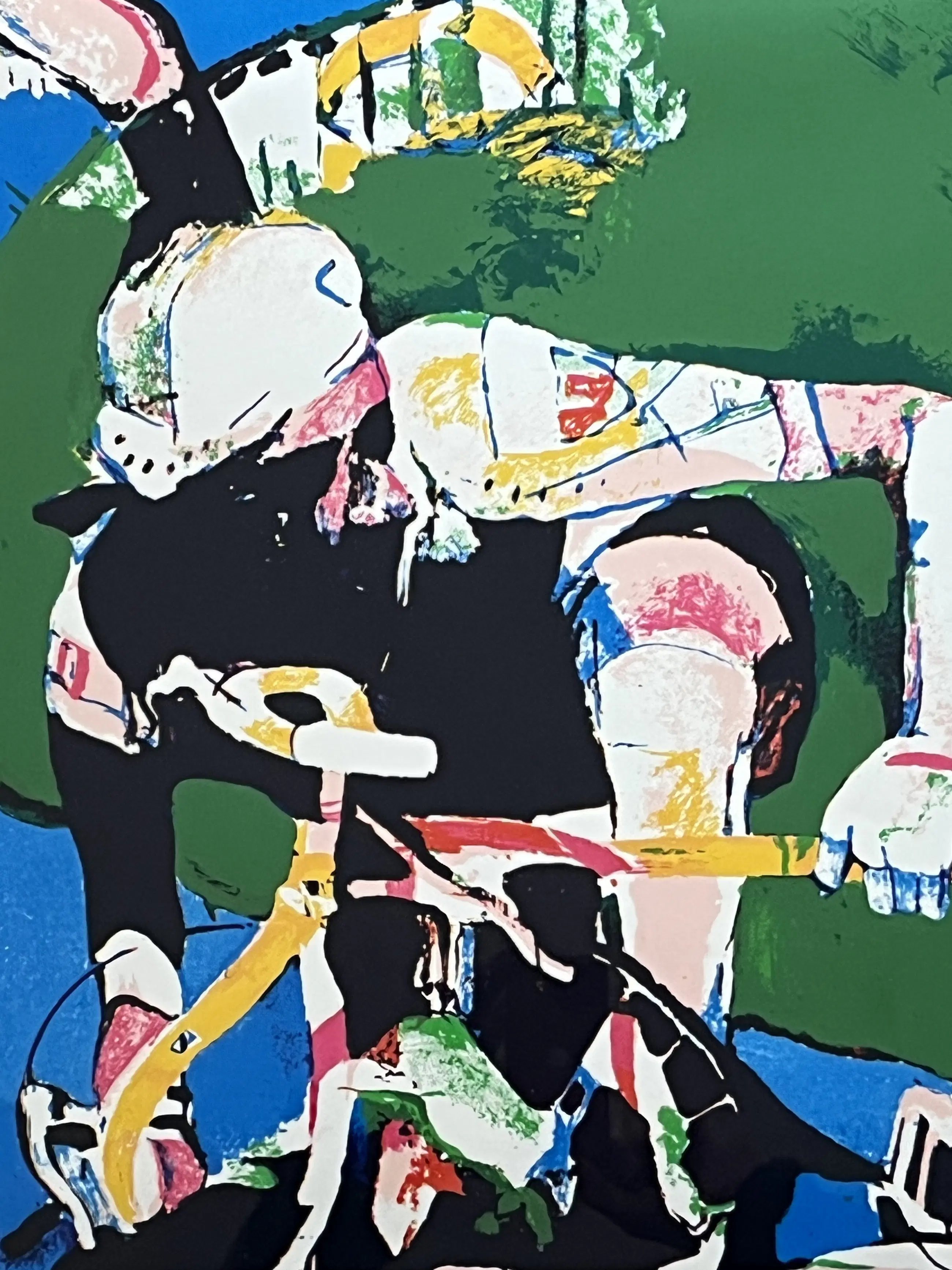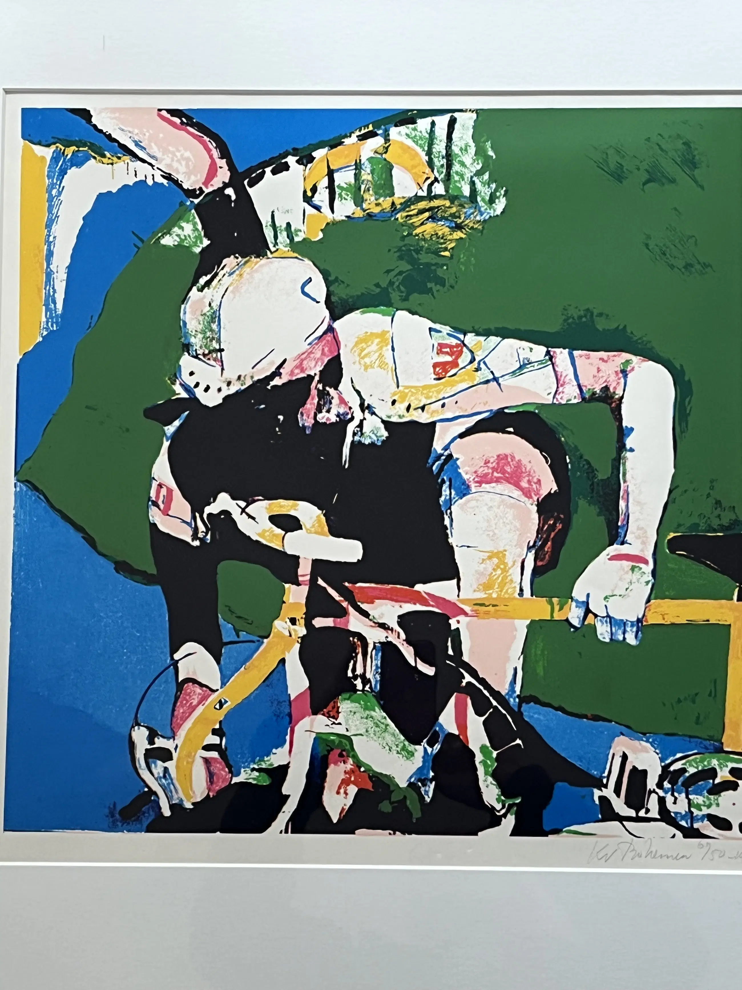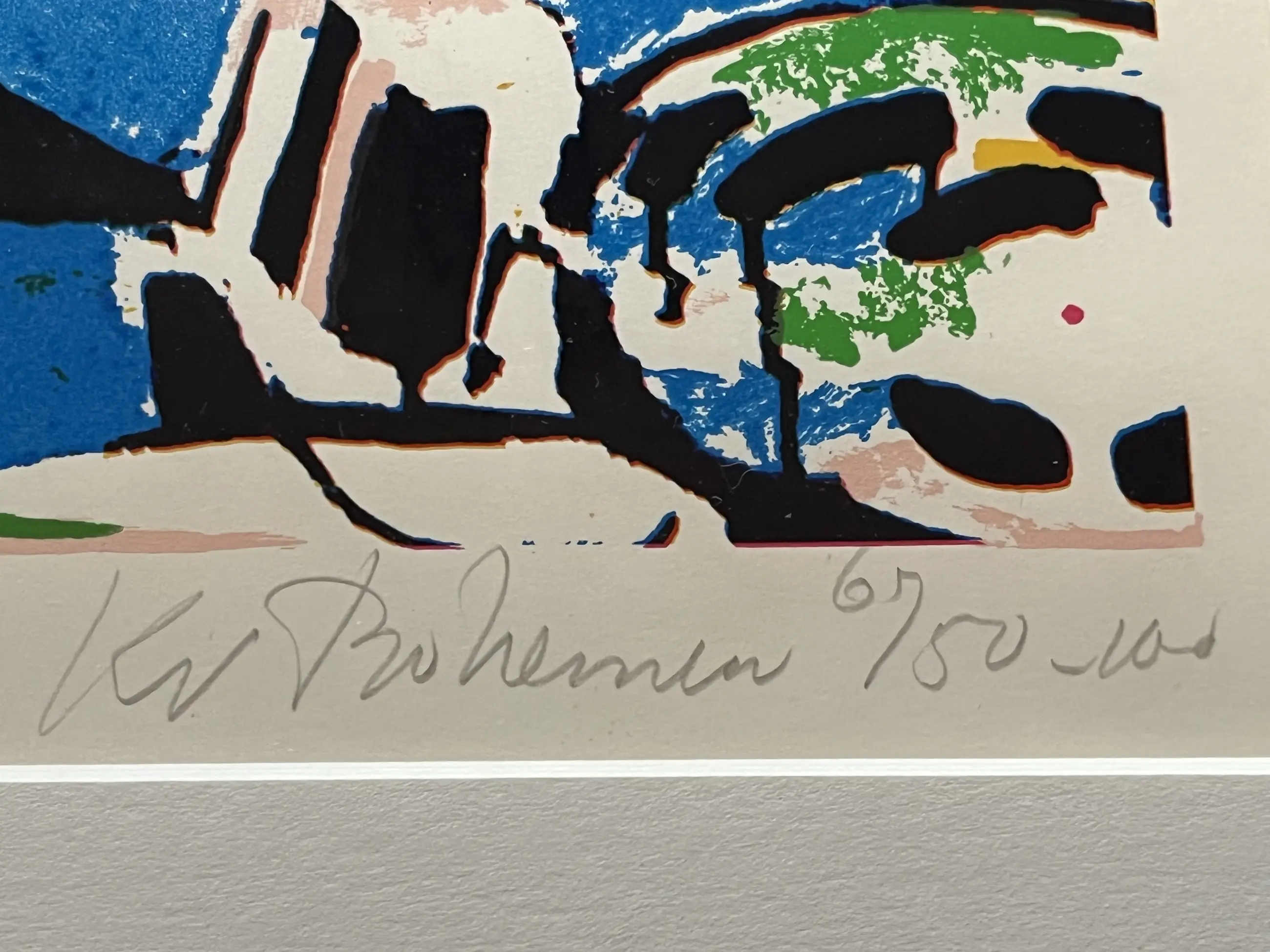 Grafiekblad uit 1967, gelijst in houten lijst. (lichte gebruikssporen) Oplage 50/100. Werk komt uit voormalige RABO collectie. Rechtsonder zit een apart venstertje, waarin waarschijnlijk informatie over de kunstenaar gezeten heeft. Afmeting afbeelding 45 x 45 cm. Inclusief lijst 73 x 73 cm.