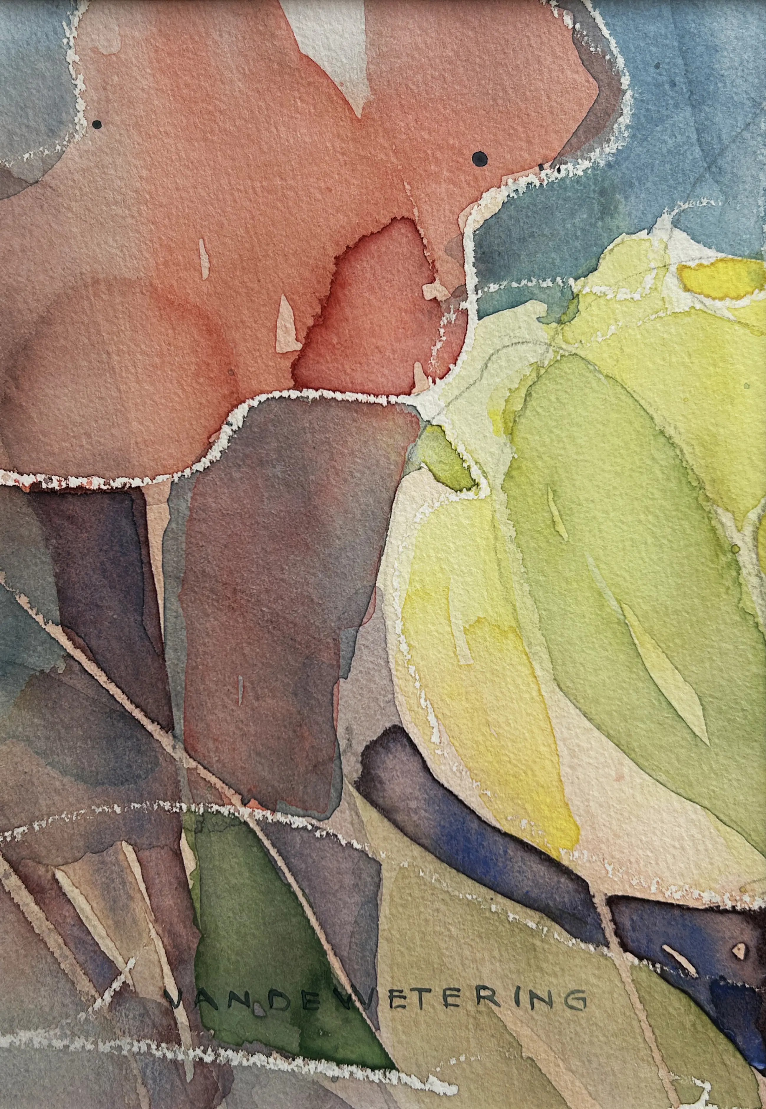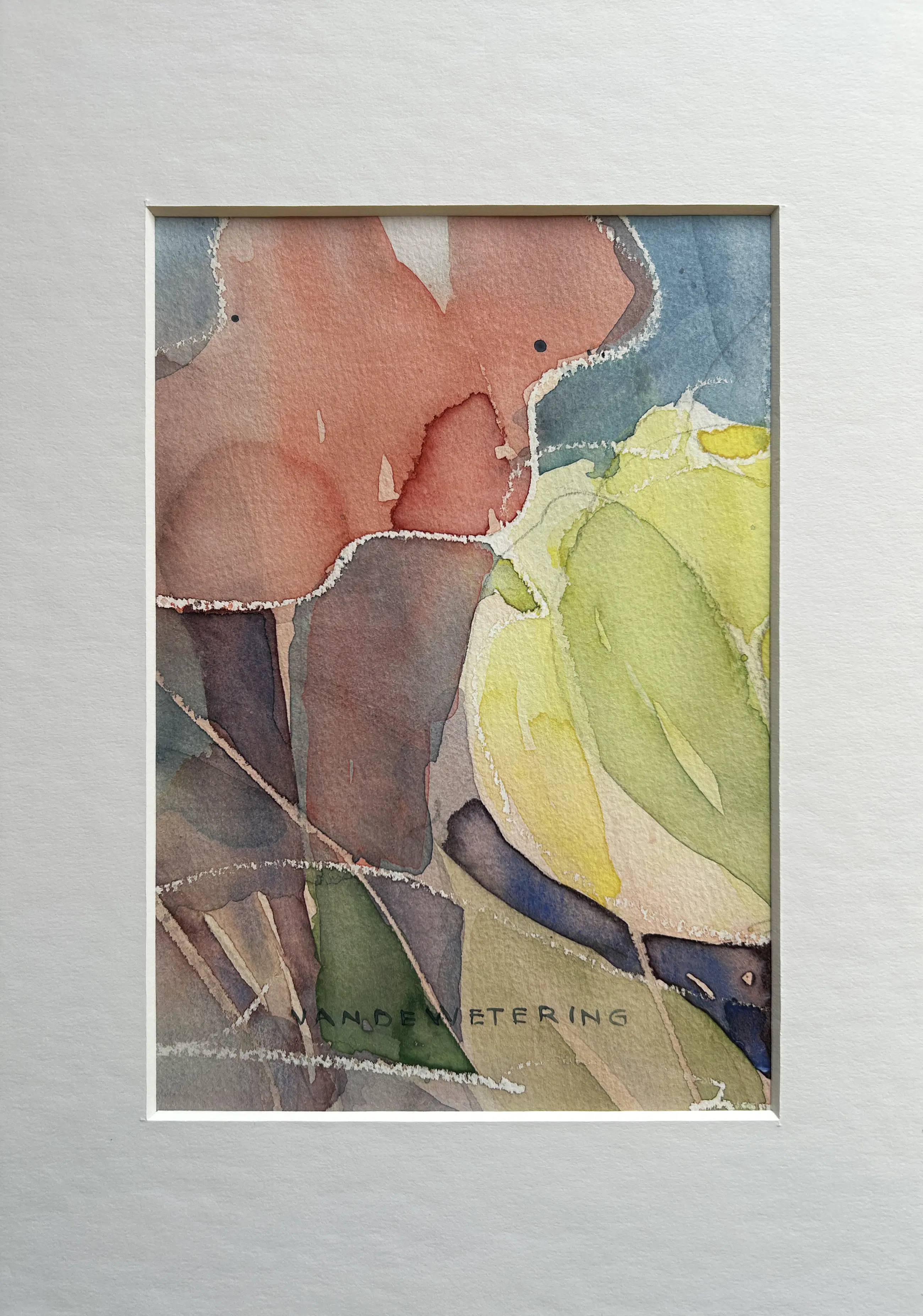 Kleine aquarel van de Nederlandse kunstenaar Kees van de Wetering. Abstract en speels van opzet in rood en groen.