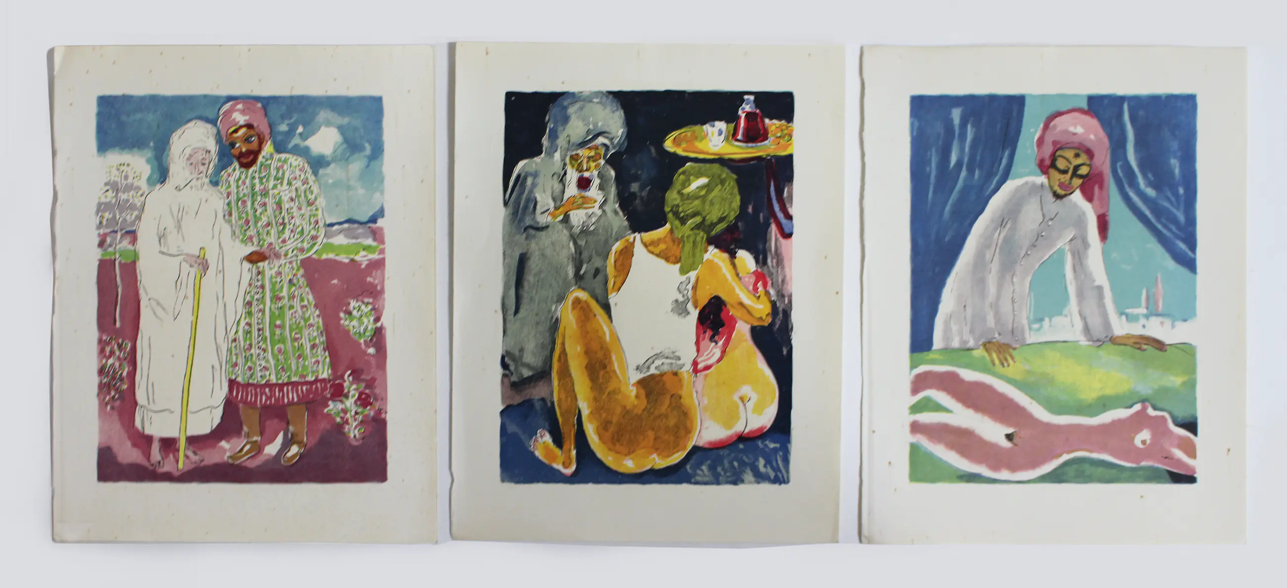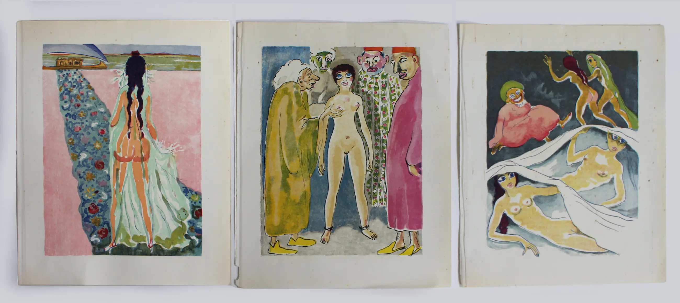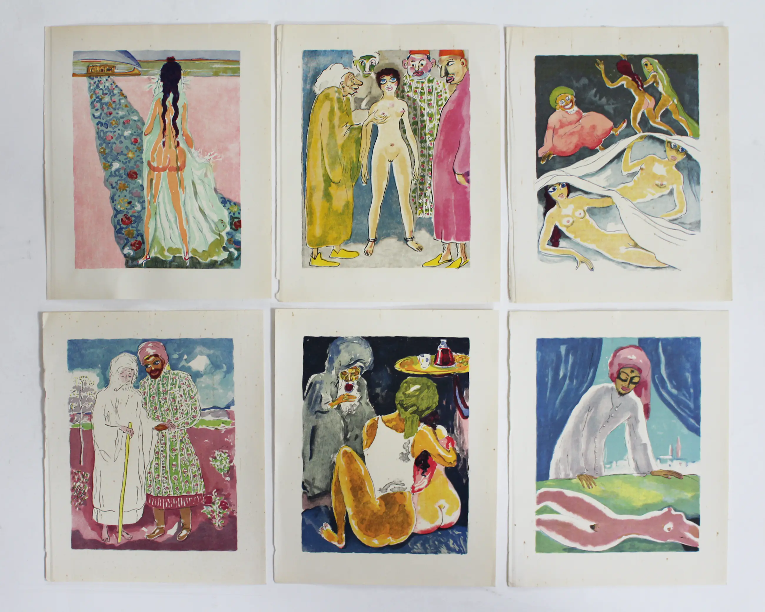 6 houtgravures van Kees van Dongen (1877-1968) uit het boek 'Le Livre des mille Nuits et une Nuit' 1e gravure: blz. 657 - 3e deel2e gravure: blz. 737 - 1e deel3e gravure: blz. 705 - 2e deel4e gravure: blz. 657 - 1e deel5e gravure: blz. 369 - 1e deel 6e gravure: blz. 689 - 1e deel