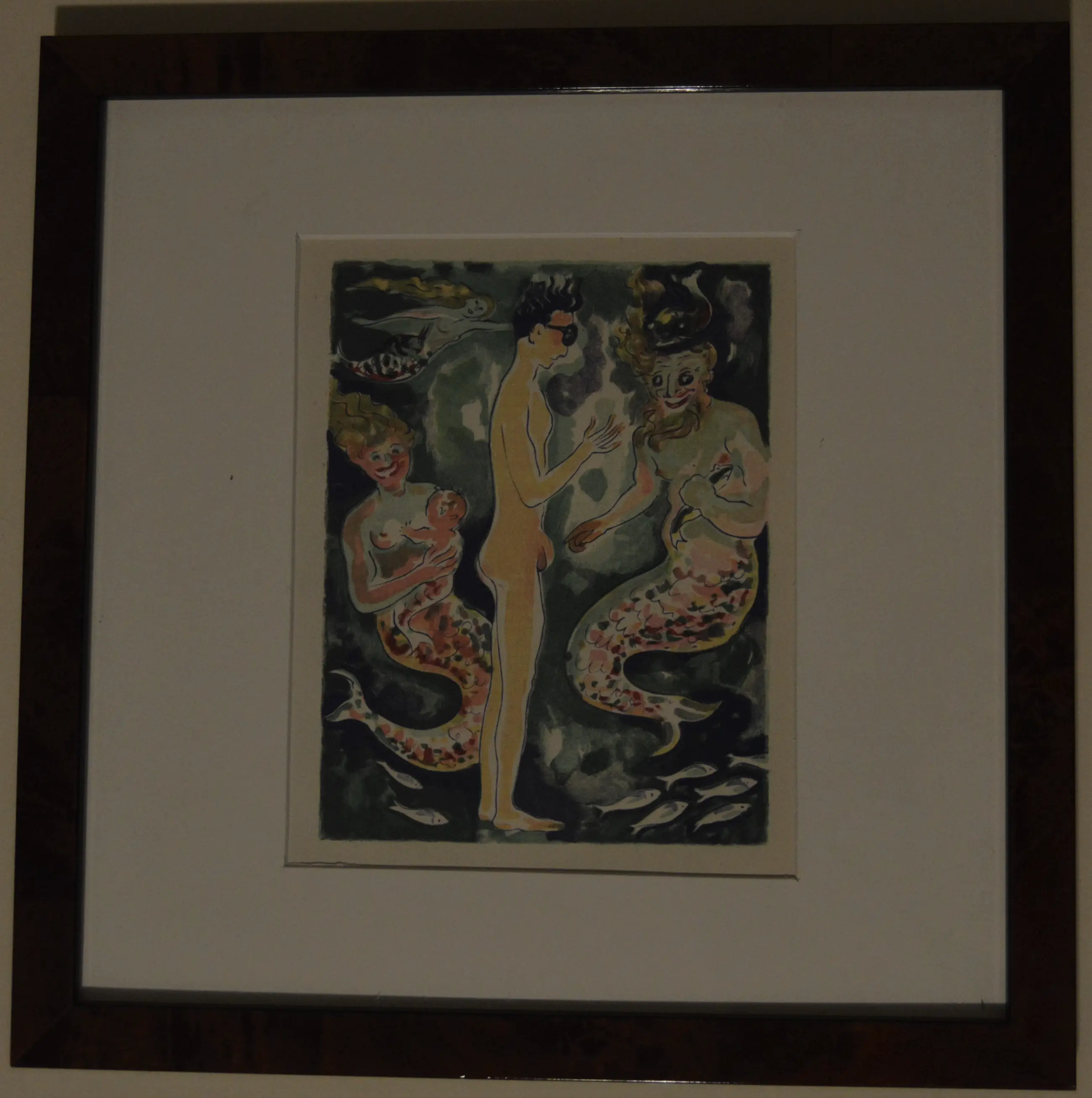 Ingelijst in noten houten lijst met passe partout. Afmetingen inclusief de lijst; 31 x 31 cm.