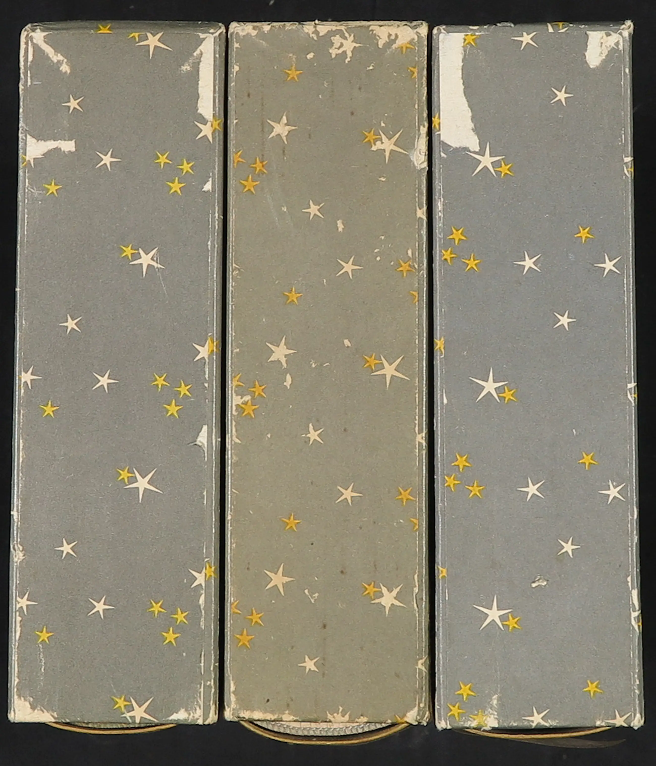 | Over het algemeen in zeer goede staat gezien leeftijd, wat gebruikssporen (een vlekje of ezelsoortje) hier en daar. De plastic beschermkaft is hier en daar beschadigd. De rug van deel 3 (rode details op de kaft) is gebroken van de voor- en achterzijde van de kaft. De kartonnen beschermdozen hebben meerdere beschadigingen/slijtage/gebruikssporen. | |||