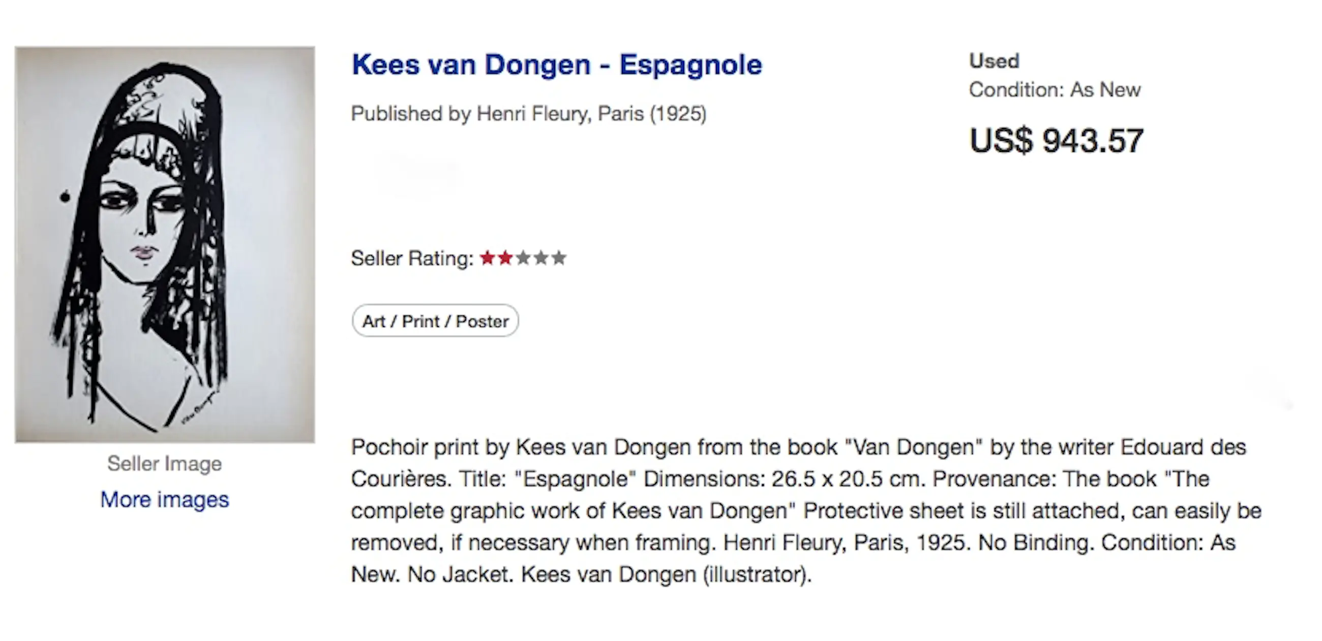 Op bladzijde 136 en 137 staat het boek : van Dongen' door Edouard des Courieres beschreven . Een van de beroemde 8 pochoirs in dit boek is 'Espagnolet'. Zie alle foto's. Schutblad zit er nog aan vast als bewijs van echtheid. Kleuren zijn fraai en helder want recent uit het boek. Zie mijn andere pochoirs in de zgn aftersale.