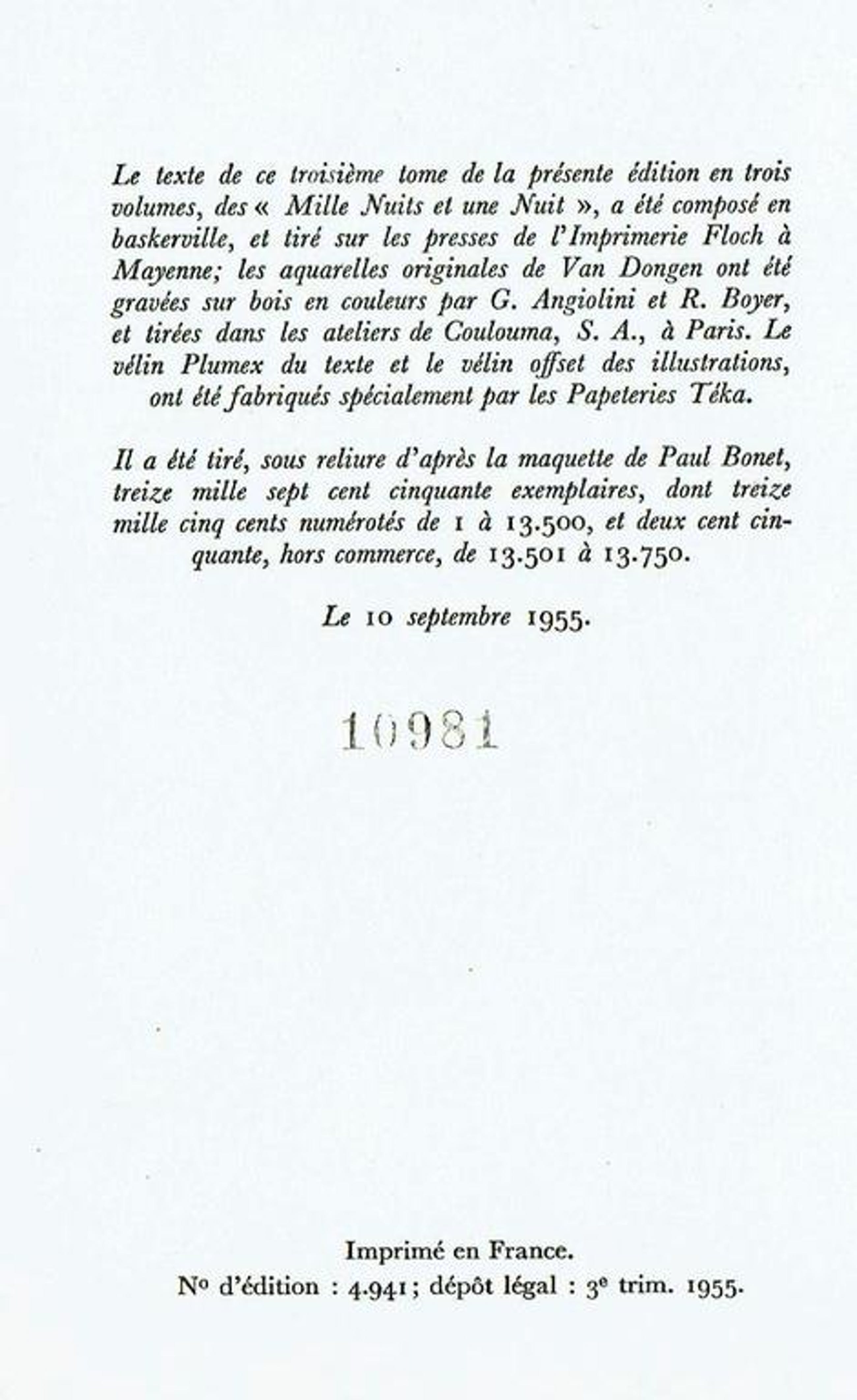 Het boek "Le livre des mille et une nuits" is gemaakt door Papeteries Téka (papierfabriek).