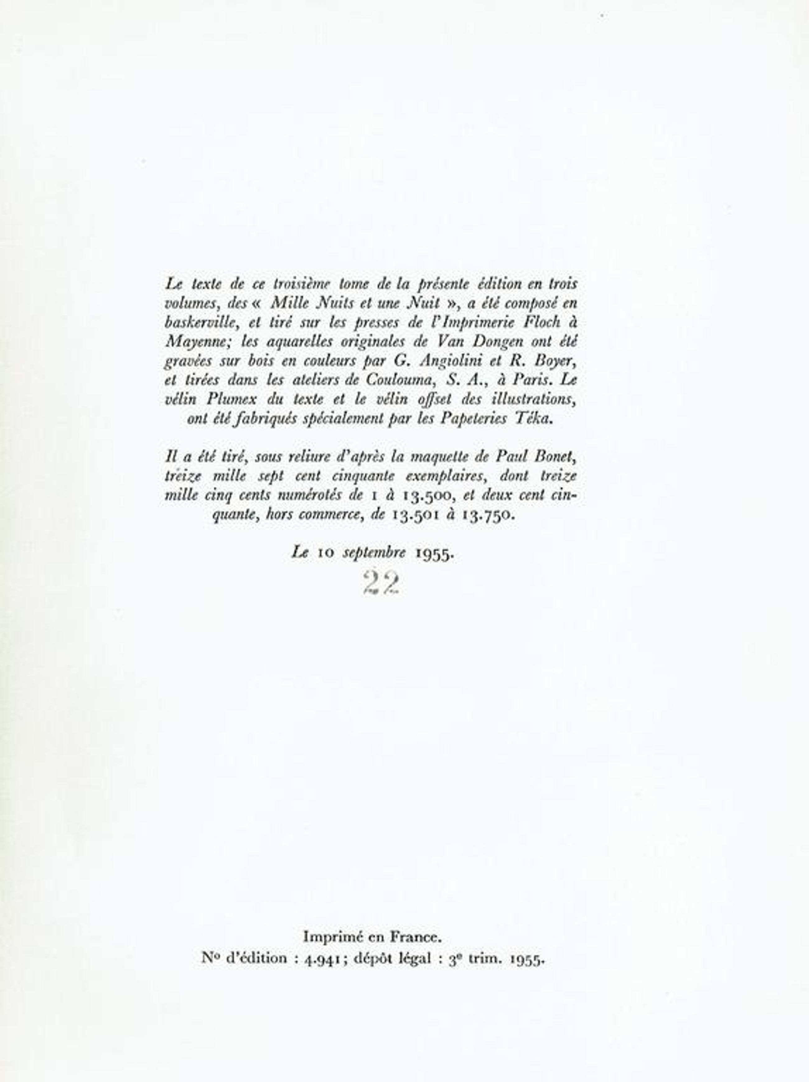 Deze prent maakt deel uit van een serie van 80 illustraties die Kees van Dongen in aquarel maakte voor. J.-C. Mardrus, Le Livre des Mille et Une Nuits, een driedelige uitgave die in 1955 verscheen bij uitgevers Fasquelle et Galimard in Parijs.