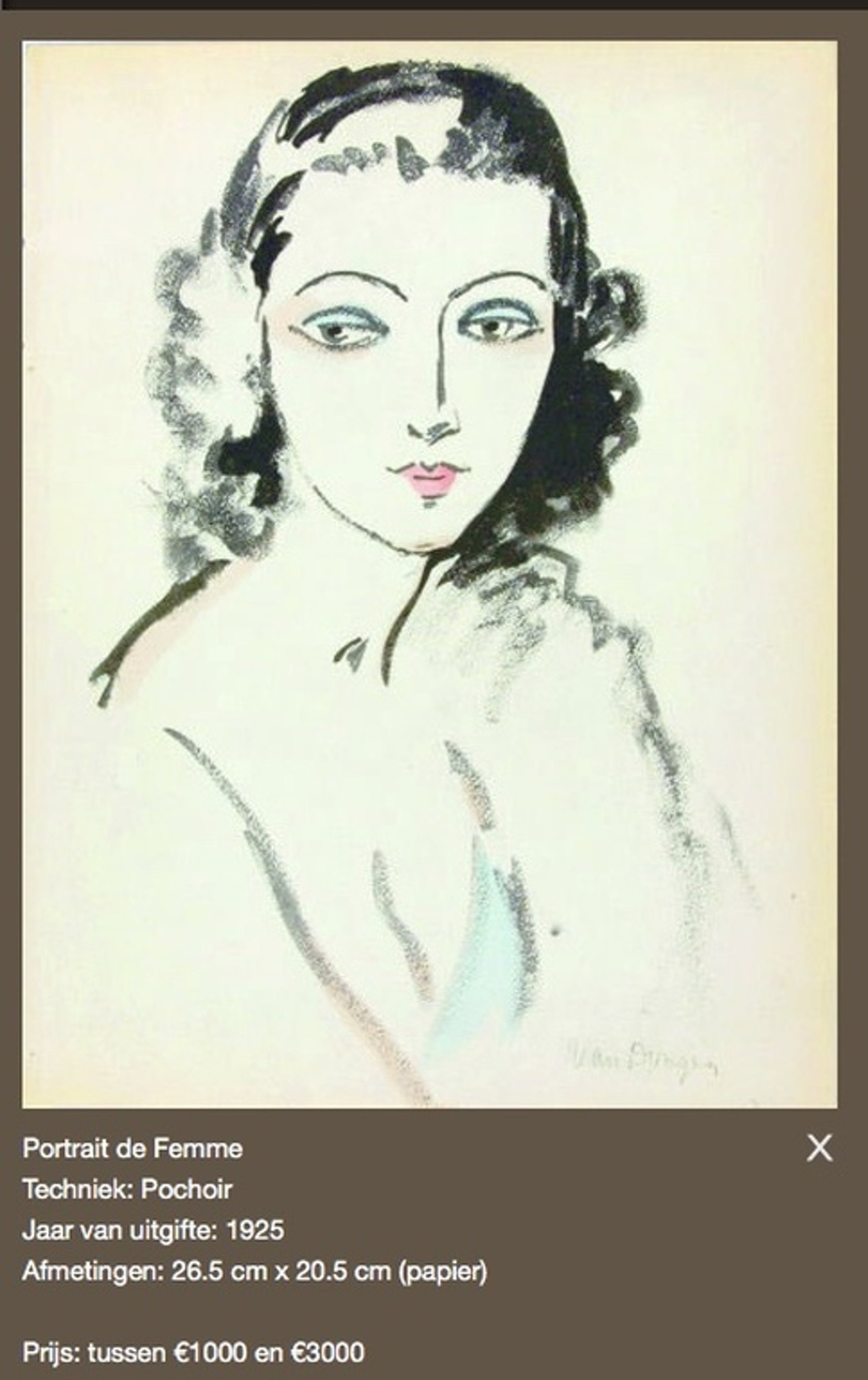In 1925 verscheen het boek "Van Dongen " door Ed.des Courieres ,uitgegeven door Henry Fleury.In dit boek zijn 8 pochoirs van Kees van Dongen opgenomen. Referentie : bladzijde 136-137 van "Juffermans",editie 2010. Deze geadverteerde pochoir is een van de meest populaire van de 8.Meestal geven gevestigde galeries geen vraagprijs bij hun collecties op Internet.Ik heb er twee ,(geanonimiseerd) gevonden om u een indruk te geven van de commerciële waarde van deze mooie pochoir(foto's 6 en 7).Afmetingen : 26,5 x 20,5 cm. In steen gesigneerd,rechts onder.De kleuren zijn goed geconserveerd en helder,want is deze week uit voornoemd boek gehaald . Wanneer u hem laat inlijsten kan het er uitzien als op foto 4...Linksboven aan zit een klein vochtvlekje ,niet gek bij een object van >90 jaar.Verzendkosten afhankelijk van gewenste wijze van verzenden. Van 2,90(standaard) tot 8,15 Euro (aangetekend).