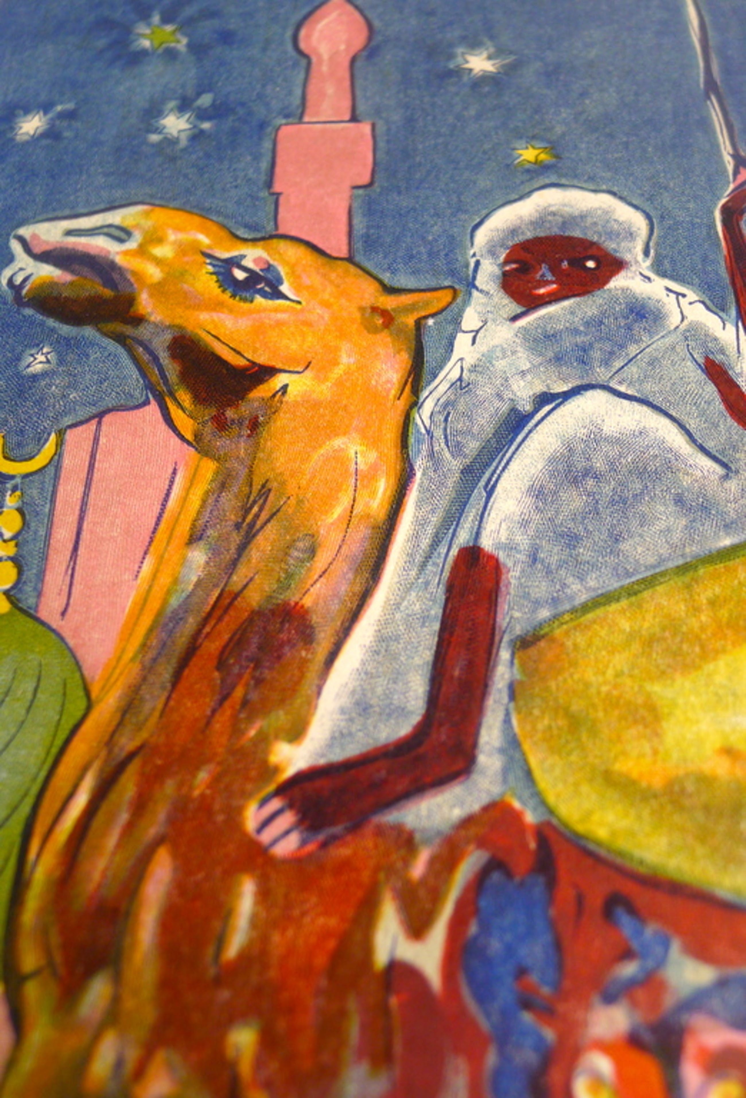 " Le voyage de Kamaralzamân " is de titel van deze houtgravure naar een aquarel van Kees van Dongen. Gepubliceerd in (deel 1) één van de drie delen van het boek : " Le livre des mille nuits et une Nuit " . In 1955 door Gallimard te Parijs uitgegeven en door Kees van Dongen voorzien van 80 Houtgravures ( foto 5 ). Kijk voor de aardigheid naar alle foto's en zie hoe intens en ahw driediemensionaal deze prent(en) zijn gekleurd.Een aardig lijstje hoeft niet meer te kosten dan 10.00 Euro. Tel uit uw winst.