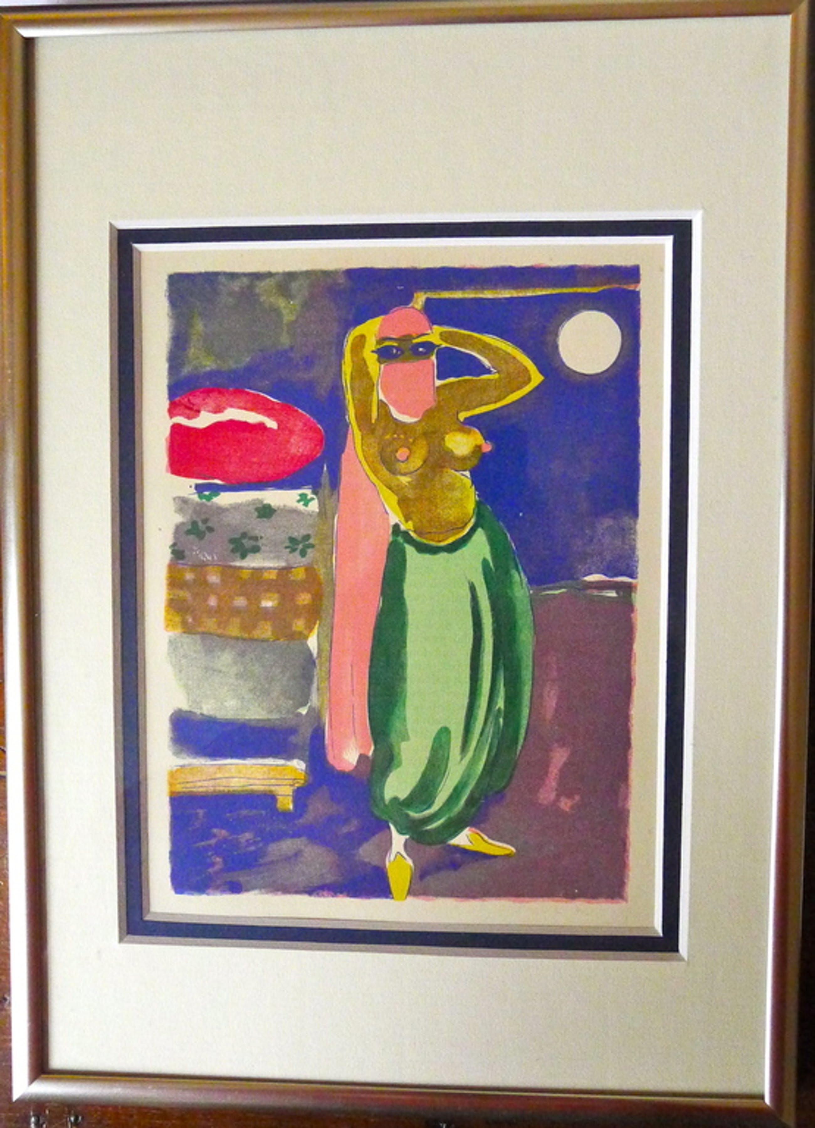 Verjaardag of Sinterklaascadeau? >>Op bladzijde 145 van deel twee van het oorspronkelijk uit drie delen bestaande boek : " Le livre des mille nuits et une nuit " Geschreven door Mardrus , in 1955 uitgegeven door Gallimard te Parijs en door Kees van Dongen met 80 houtgravures geillustreerd vindt u de ze " La Comparaison " Ingelijst met beige en donkerblauw passe-partout.
