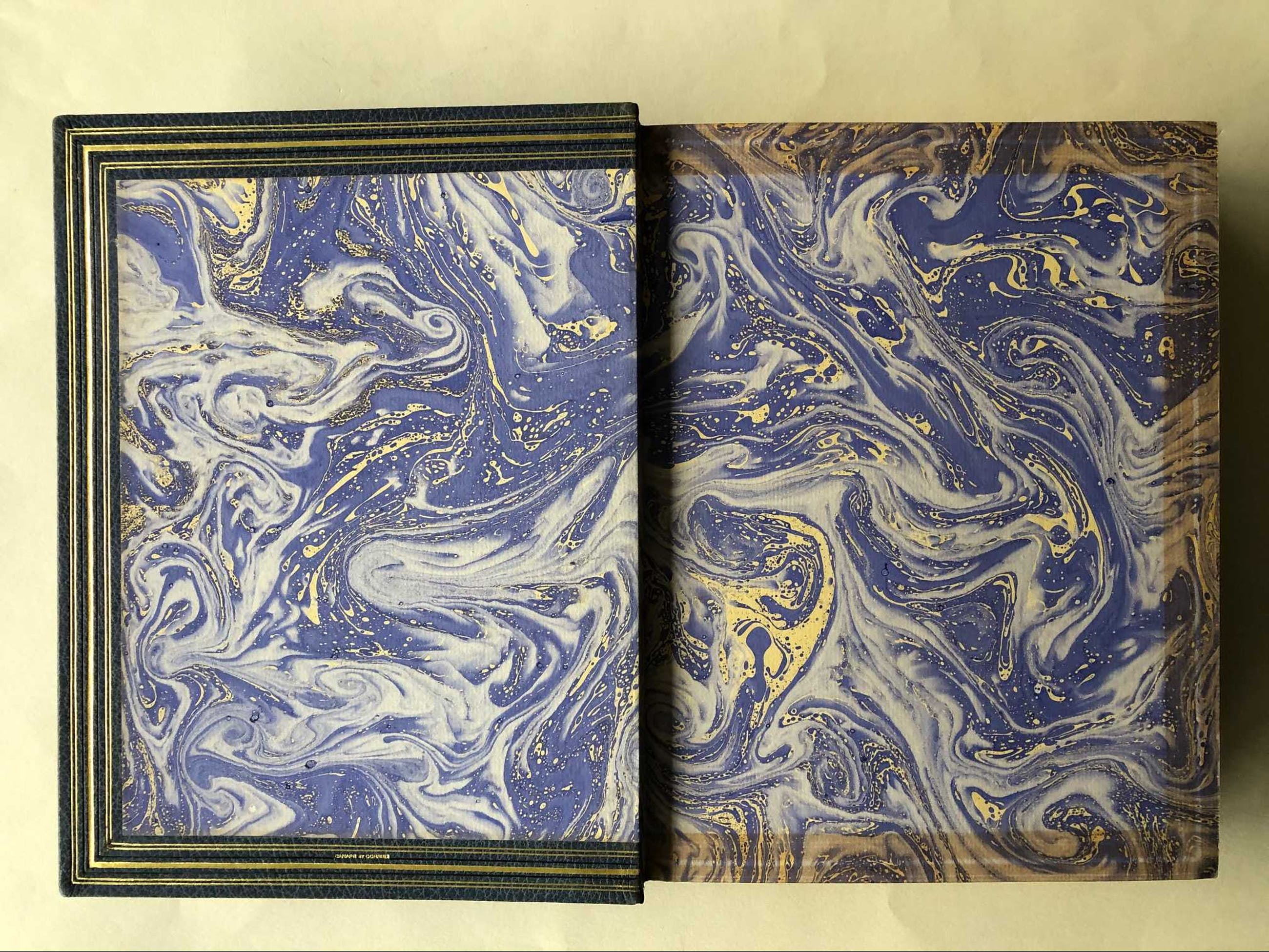 Omslag van Afrikaans geitenleer en de rug is wat verkleurd. In slip case.