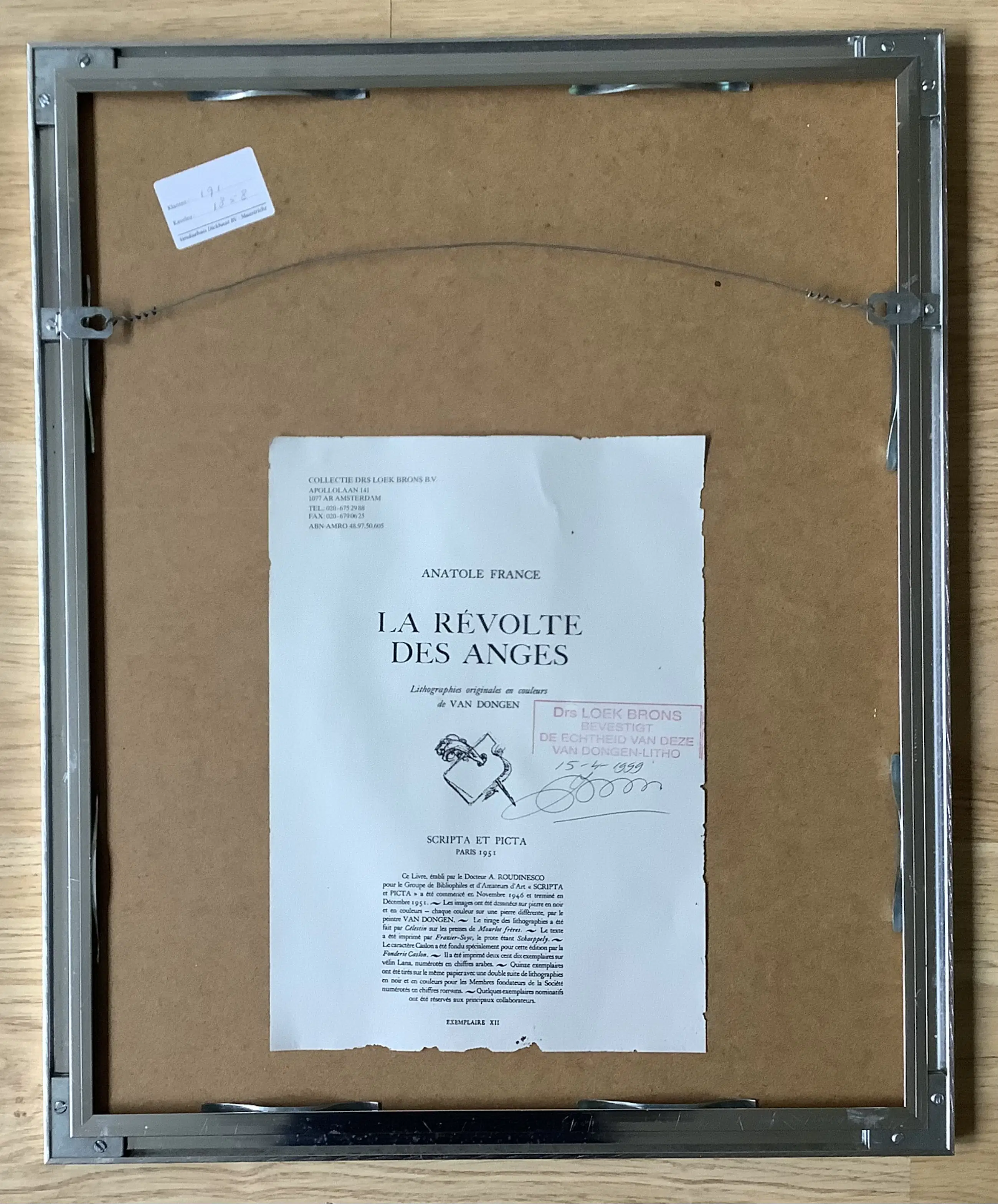 COA afgegeven boor Drs. Loek Brons 1999, zie foto achterzijde van het werk.
