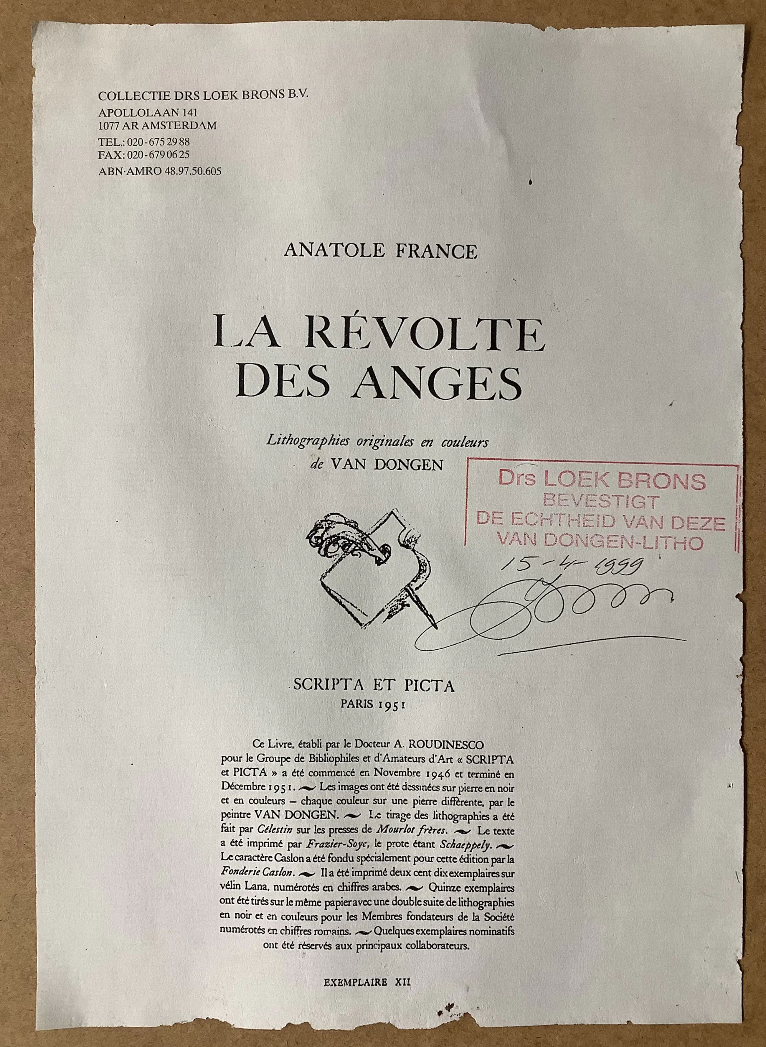 Reference: Collectie Drs Loek Brons BV. Lithografie uit de kleurensuite bij La Revolte des Anges, Anatole France, waarvan er maar 15 gedrukt zijn. Dus geen tekst op achterzijde.