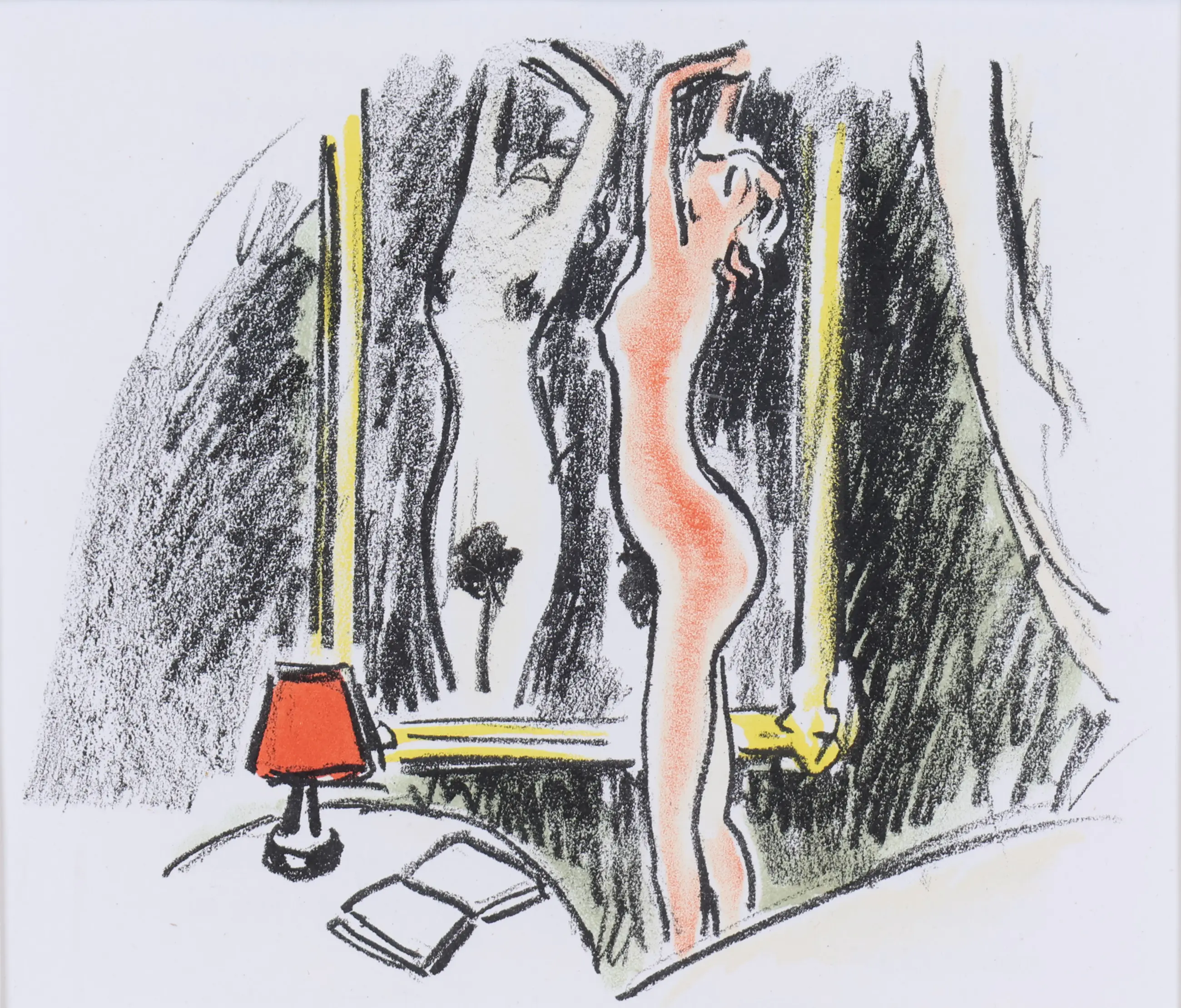 In dit werk toont Van Dongen zijn karakteristieke eenvoud en kracht in lijn en kleur. Een vrouw, weergegeven in zachte roodtinten, staat voor een spiegel en bewondert haar eigen reflectie. De scene is intiem en sensueel, maar nooit vulgair — de kunstenaar weet met enkele expressieve krijtlijnen en subtiele accenten een sfeer van elegantie en zelfbewustzijn te scheppen. De rode gloed van de lamp versterkt de warme tonaliteit van het tafereel, terwijl de speelse contouren een indruk wekken van spontaniteit en beweging.