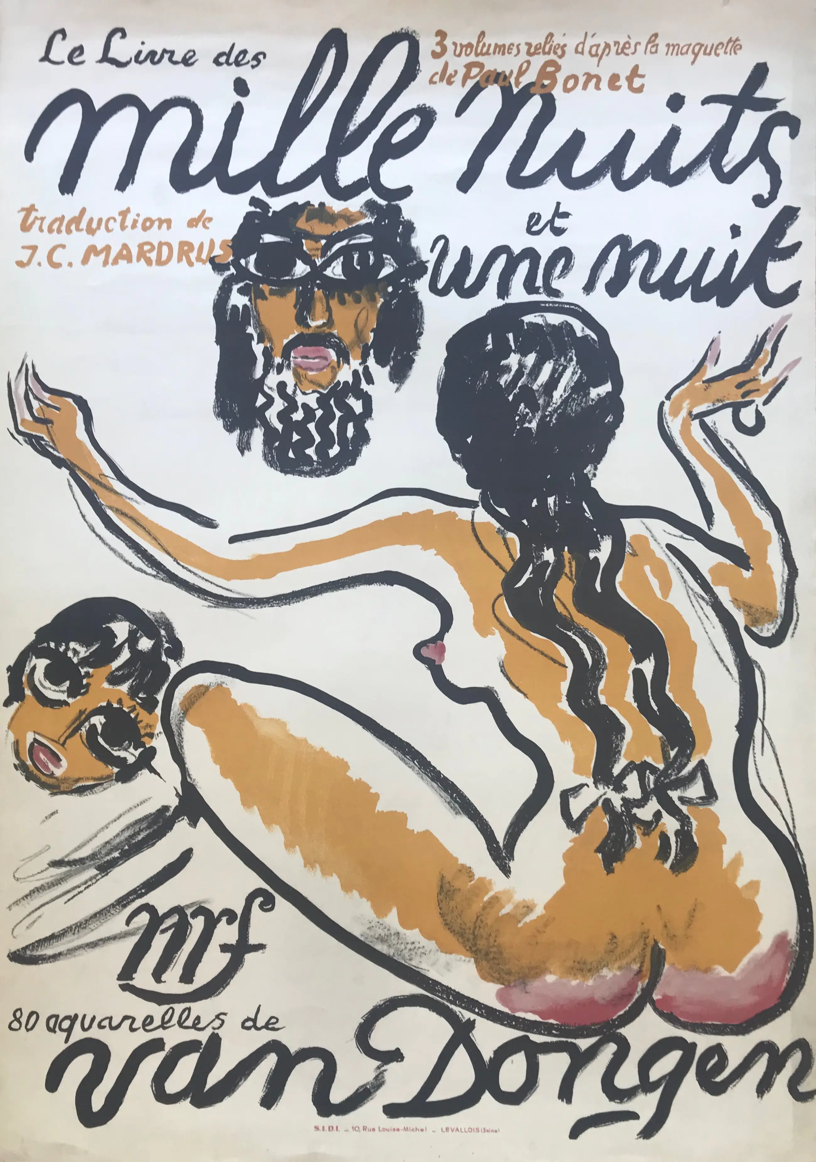 Deze originele lithografische affiche van "Mille Nuits et une Nuit" is gemaakt voor de promotie van de prachtig geïllustreerde uitgave van het boek 'Le Livre des Mille et Une Nuit, 1955' van Kees van Dongen (over het verhaal van 1001 nachten).