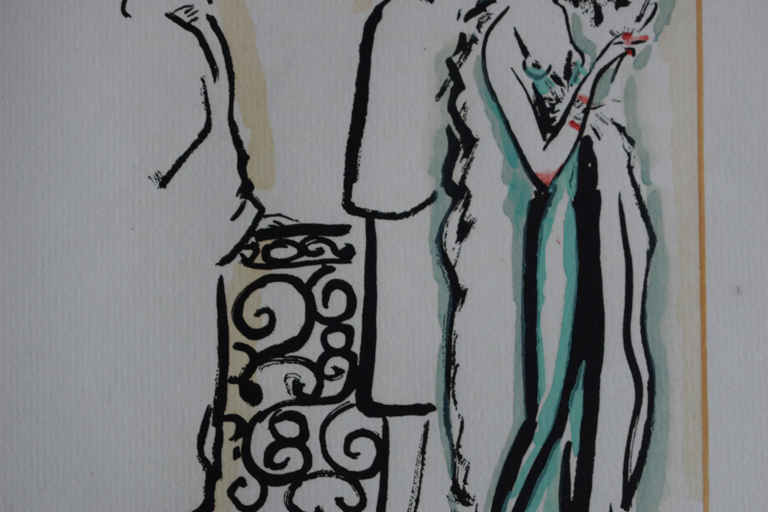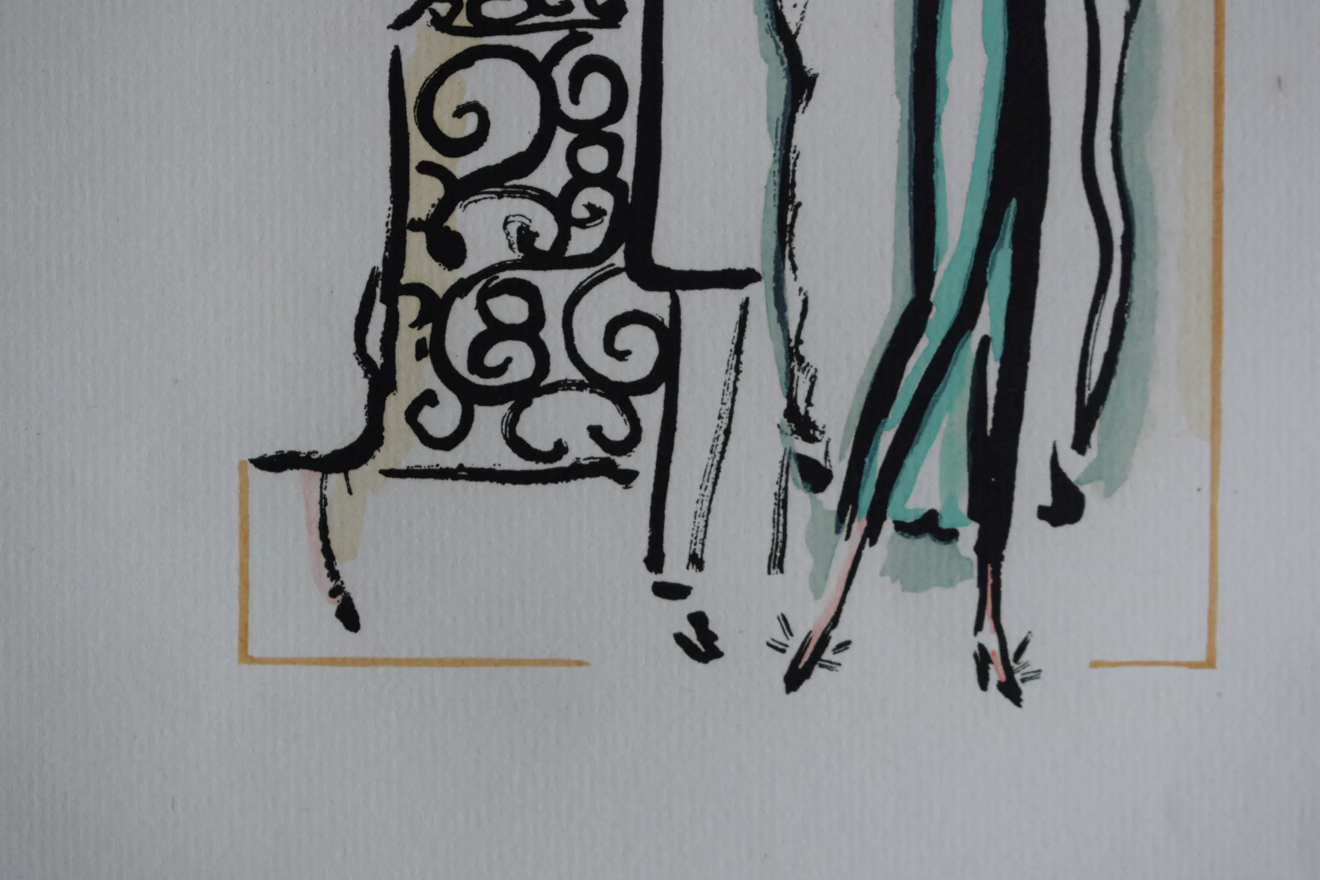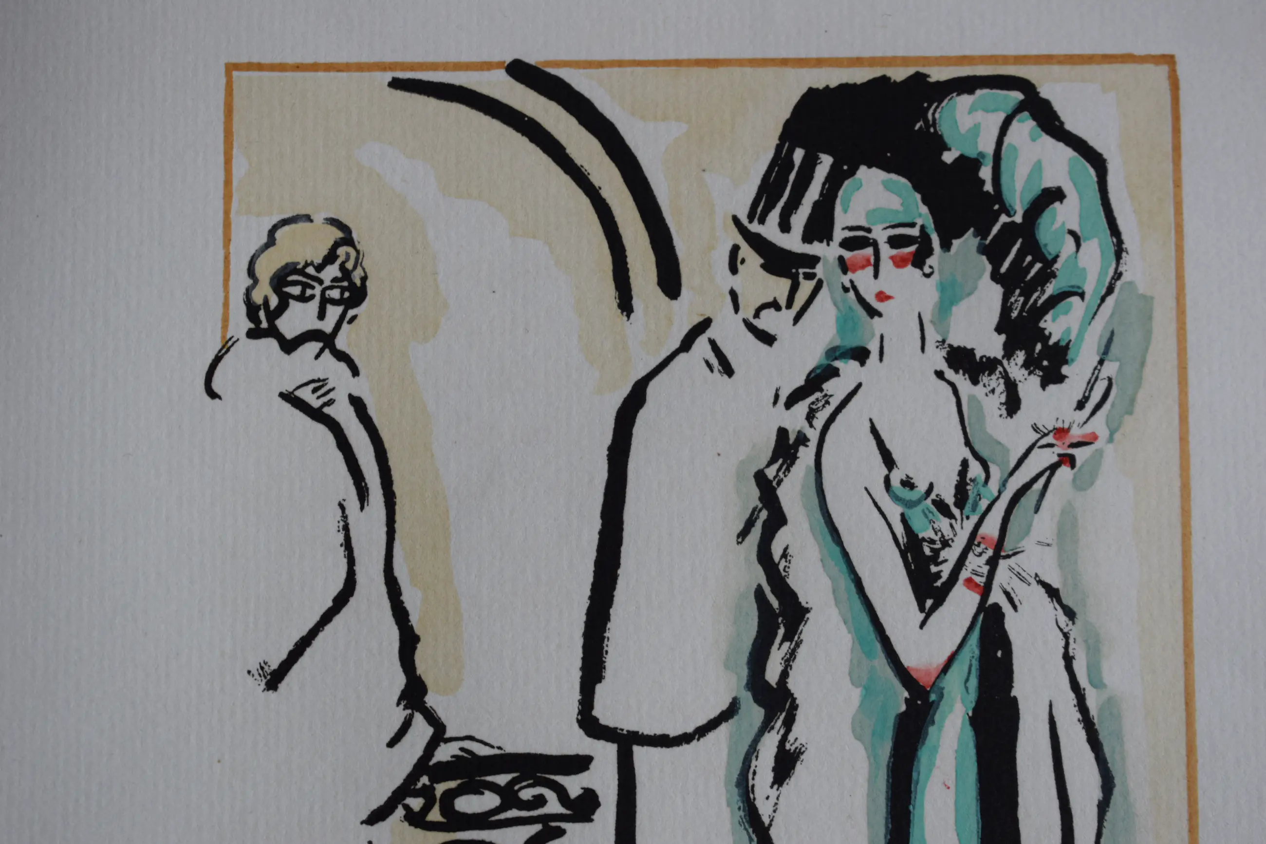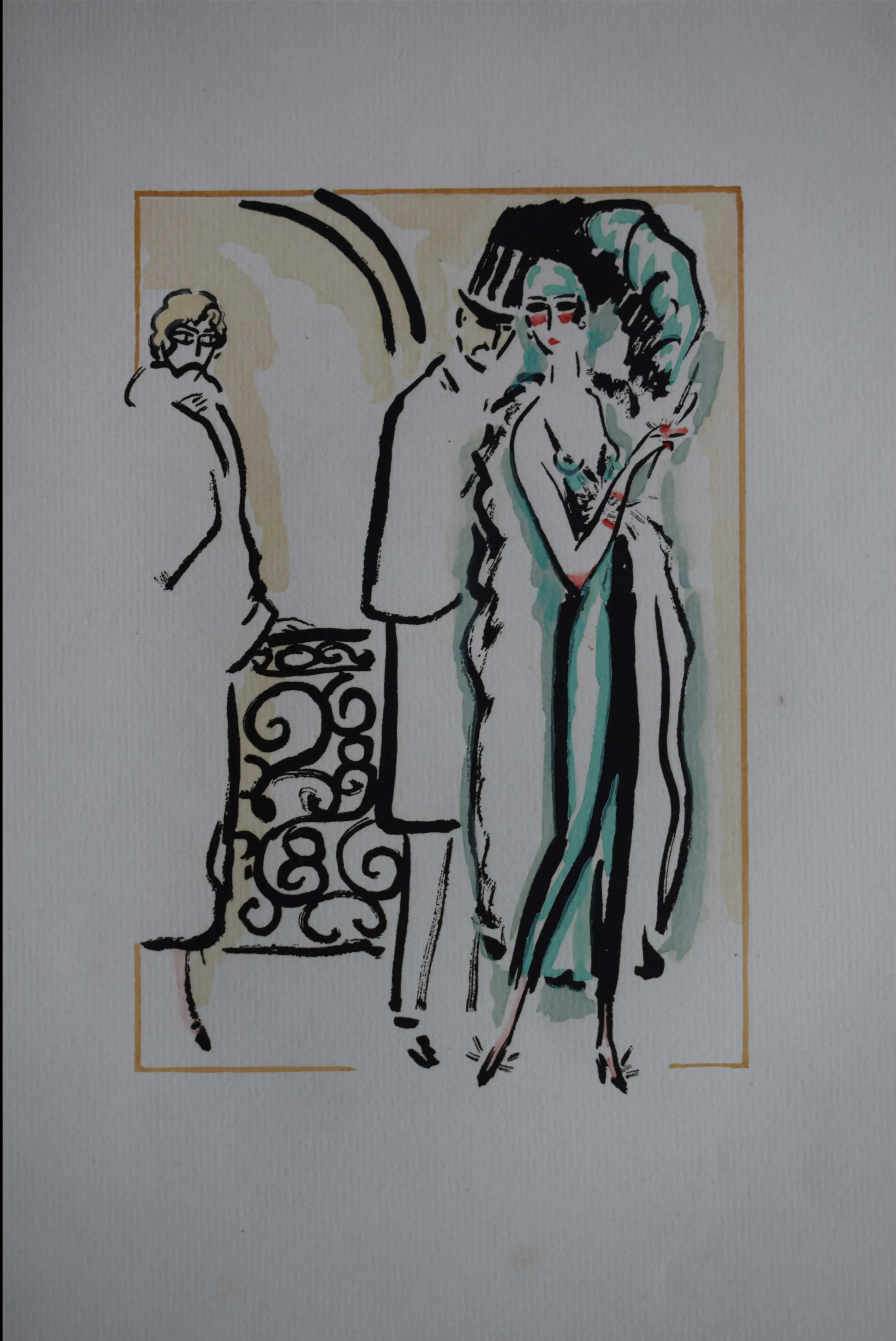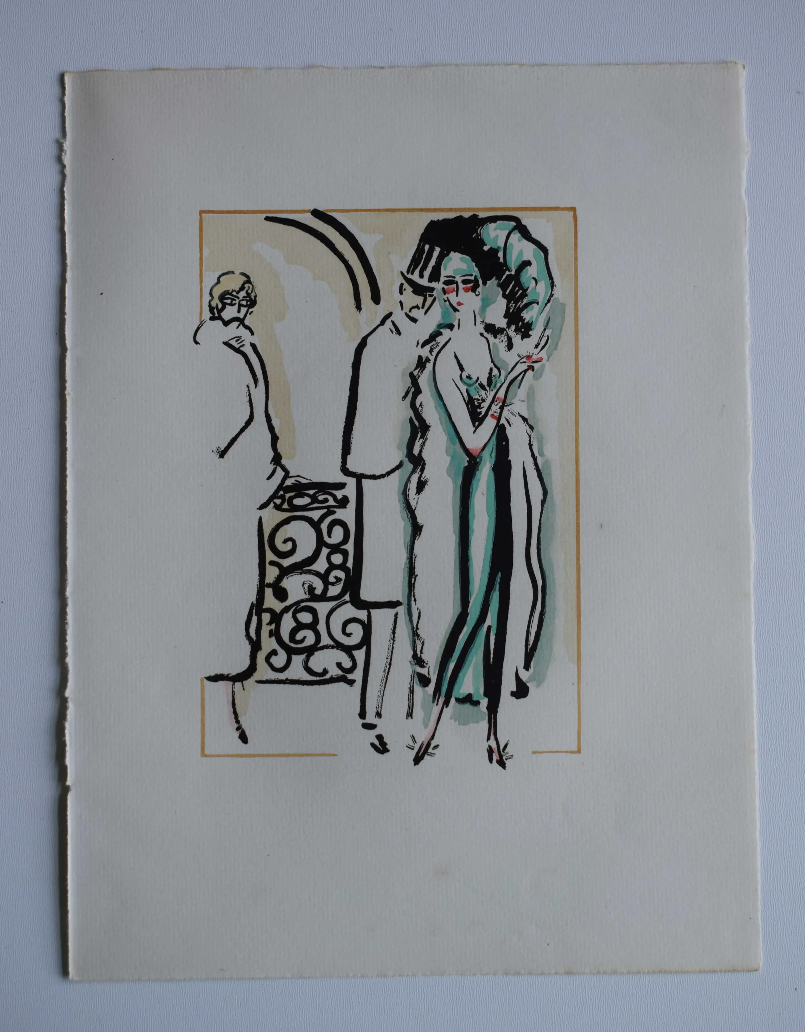 Mooie pochoir van Kees van Dongen. Een gentelman die de jas van zijn geliefde aan pakt. Top van de Art Deco periode en Roaring Twenties.