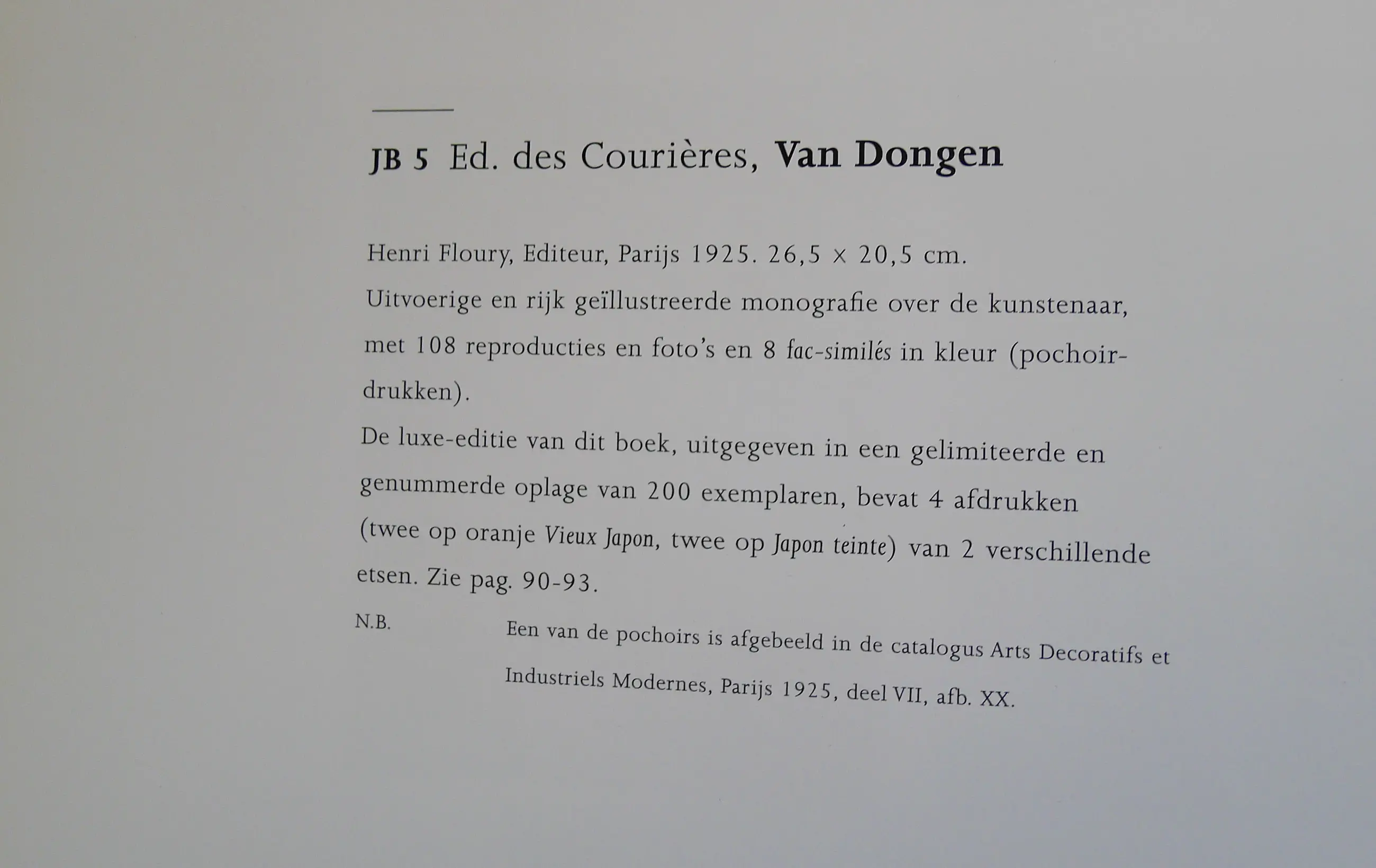 Op bladzijde 136 en 137 van 'Juffermans' , editie 2010, (foto 4 en 5 ) staat het prachtige boek : van Dongen' door Edouard des Courières beschreven. Dit is een van de 8 pochoirs uit dit boek. Het schutblad zit er nog aan vast.