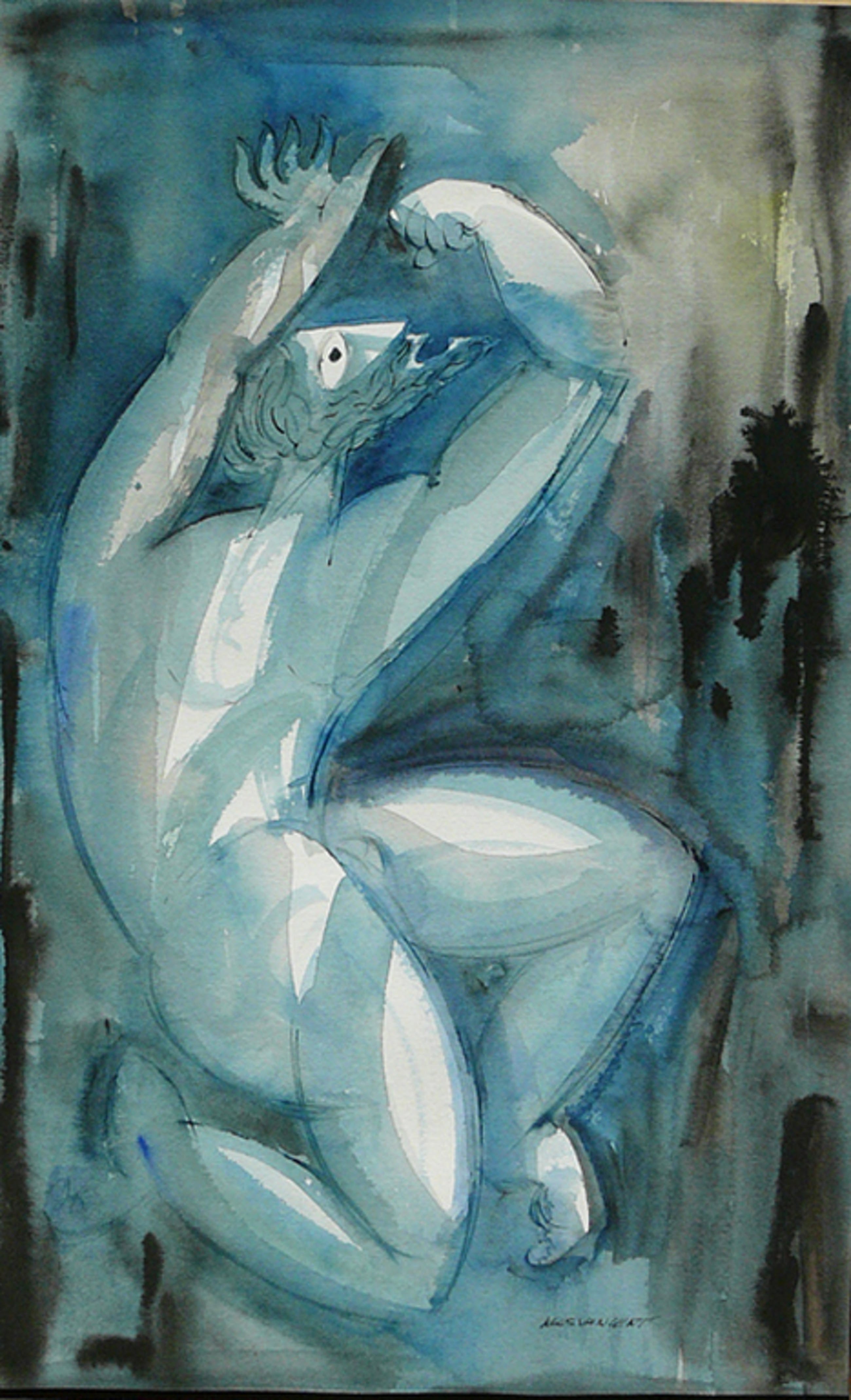 Grote aquarel (zichtmaat 30 x 50 cm) voorstellende een mythische figuur achter passepartout. Het werk laat een bewogen kunstenaar zien met voorliefde voor bijbelse onderwerpen en symboliek. Olieverf, aquarel, etsen en pentekeningen. Gefascineerd door de kleine kruisbeelden langs de wegen in Limburg maakte hij de veel besproken ets 'Sjuuske', een van zijn meest bekende werken.